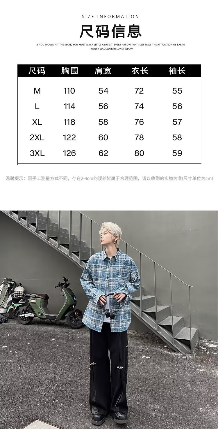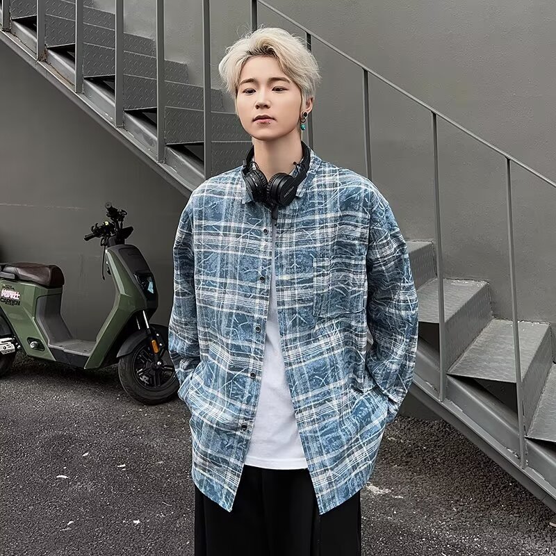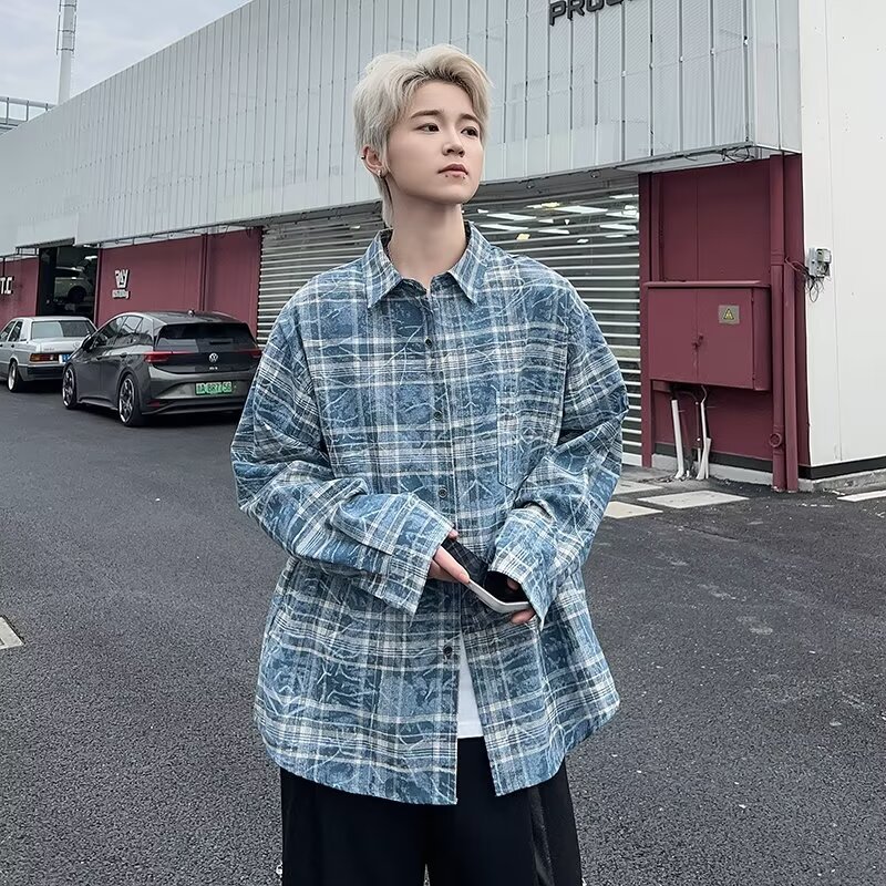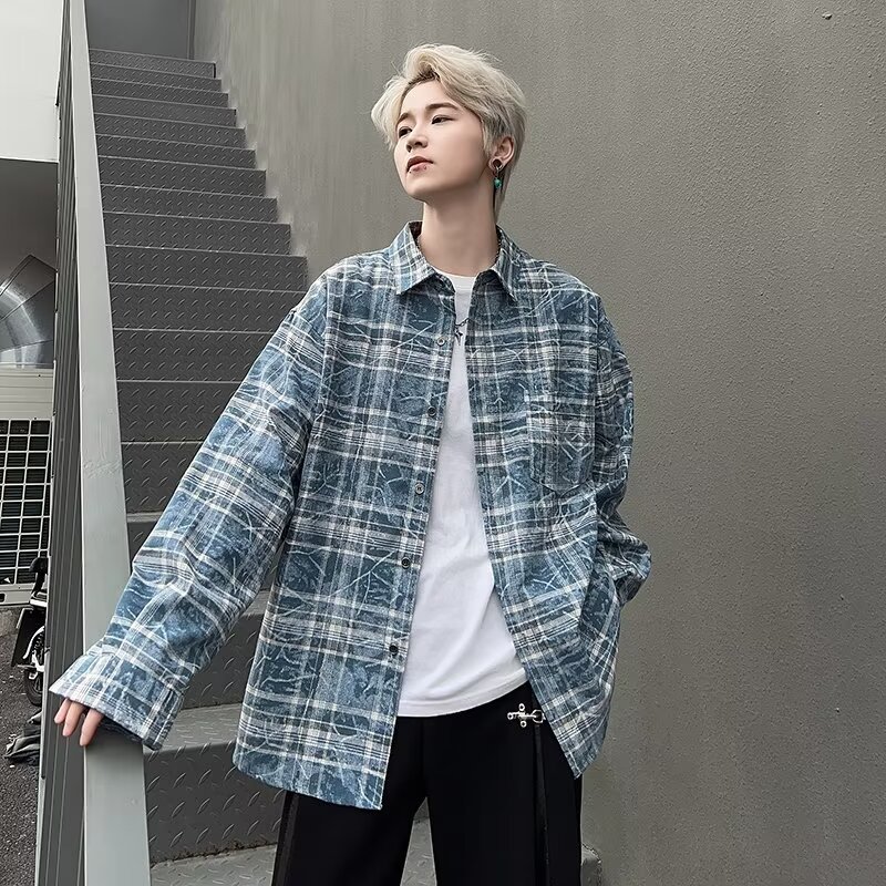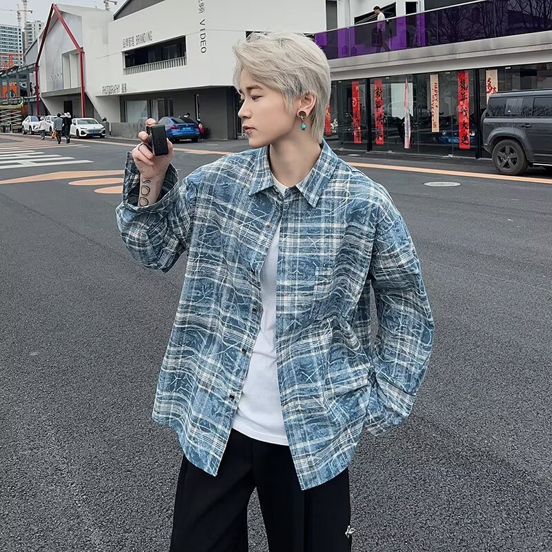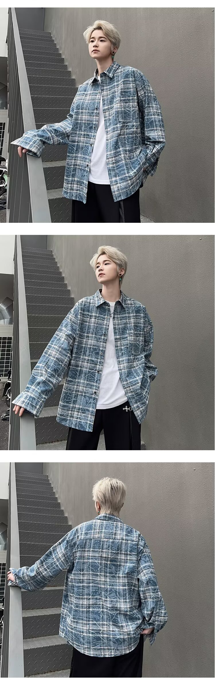 아메리칸 레트로 태슬 디스트로이드 블루 체크 남성 셔츠 봄, 가을 로우 엣지 남성 및 여성 셔츠 재킷 이너웨어 청소년스토어 가기