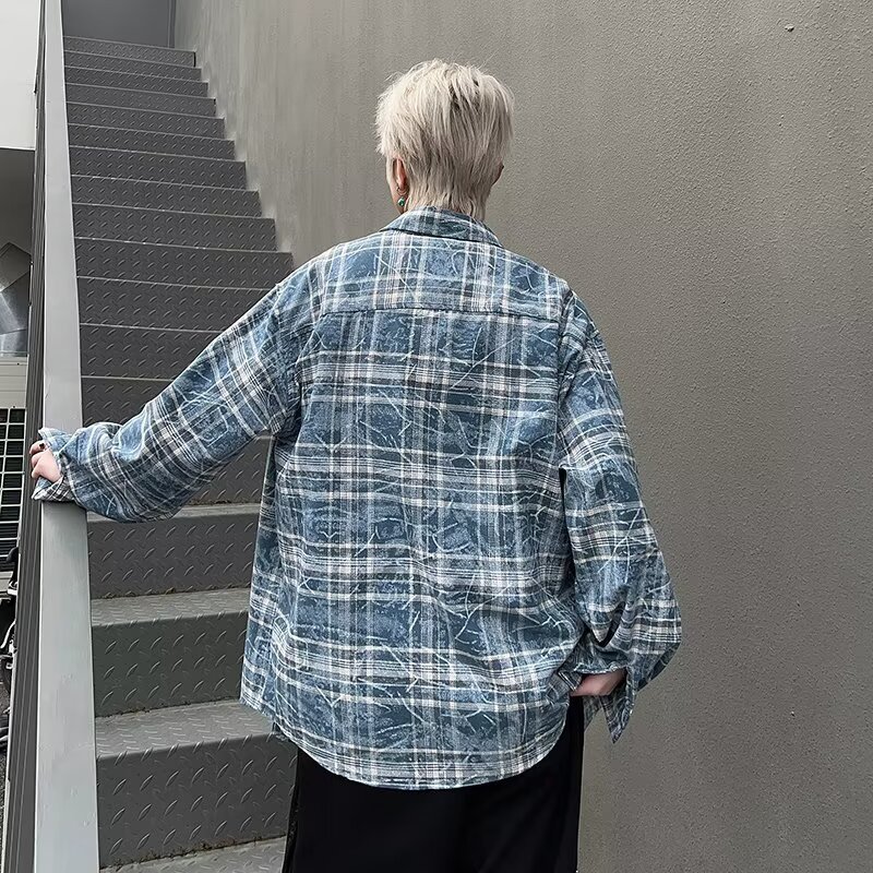 아메리칸 레트로 태슬 디스트로이드 블루 체크 남성 셔츠 봄, 가을 로우 엣지 남성 및 여성 셔츠 재킷 이너웨어 청소년