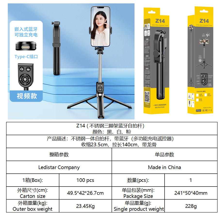 • Z14 핑크 [ selfie stick 1.4m + Douyin 리모컨 충전 + 안정적인 삼각대 ]