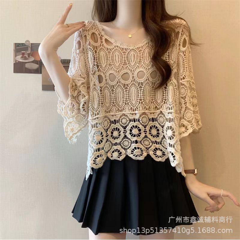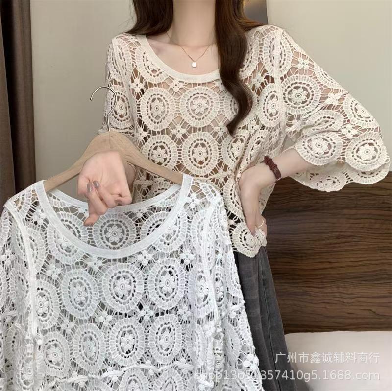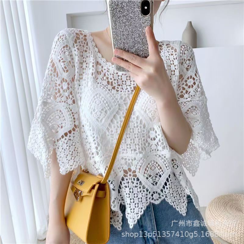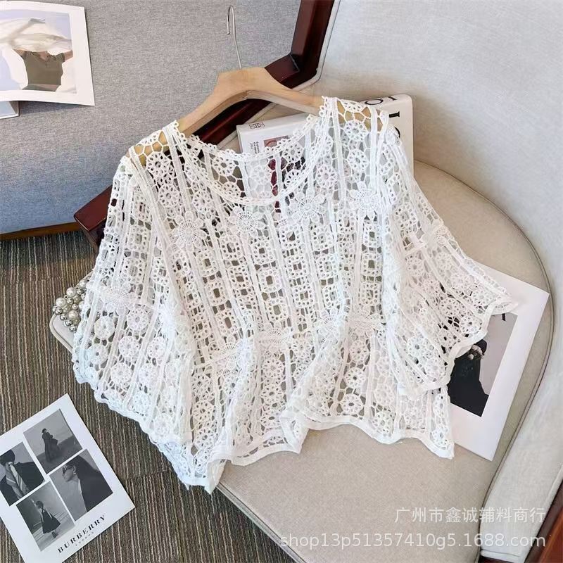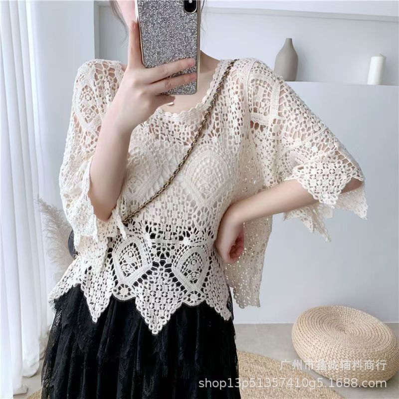 프랑스 스타일 우아한 레이스 셔츠 여성의 여름 새로운 복고풍 니트 스웨터 오버 셔츠 중공 크로 셰 탑 여성스토어 가기