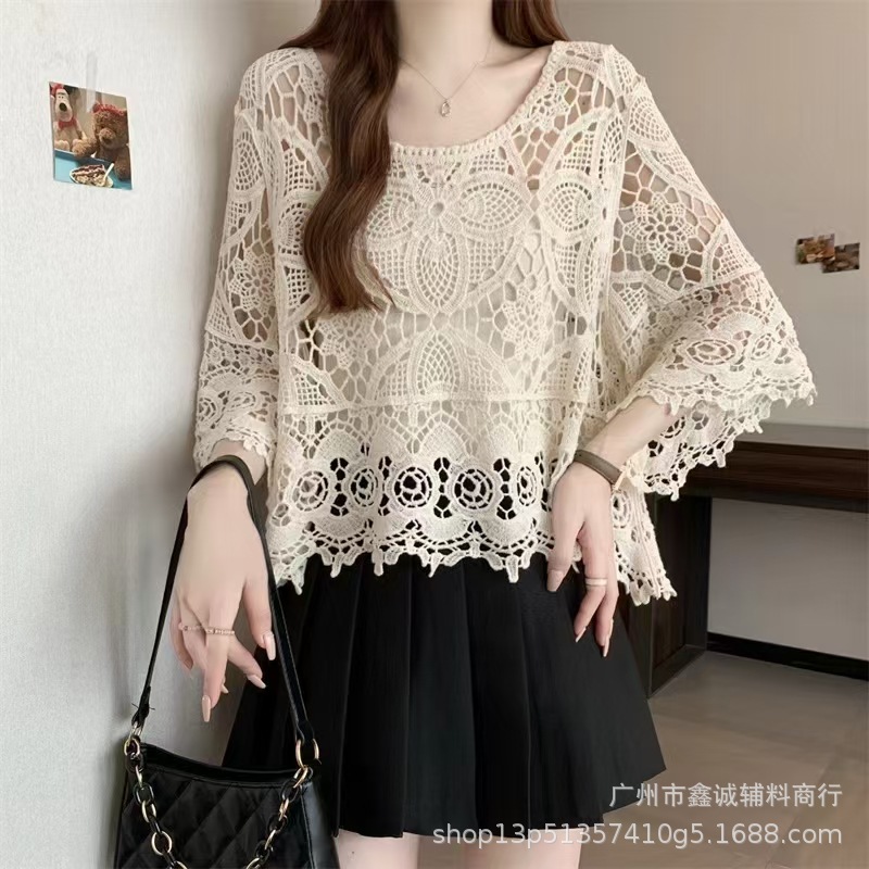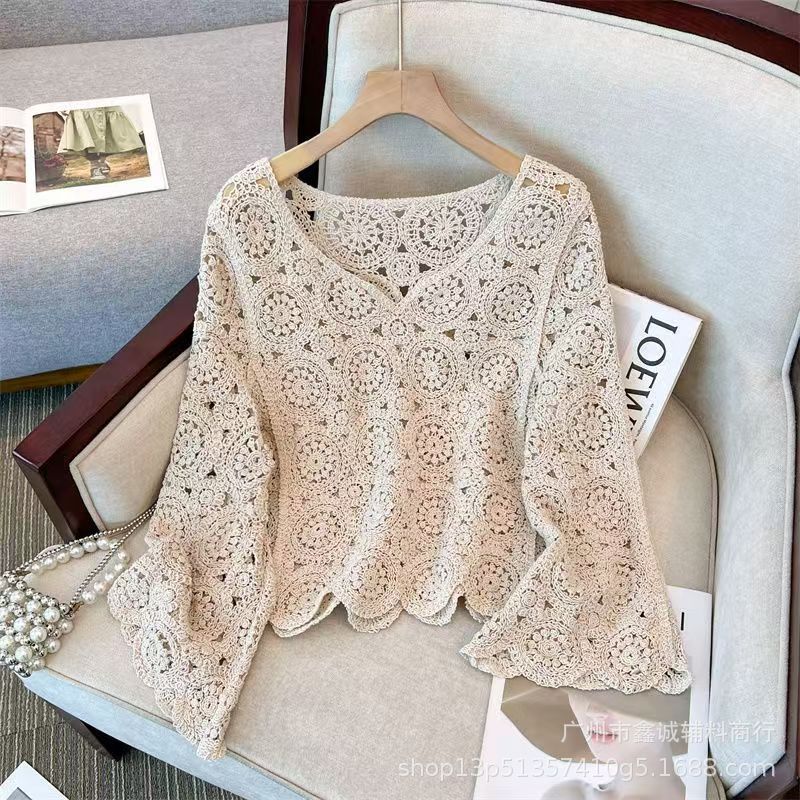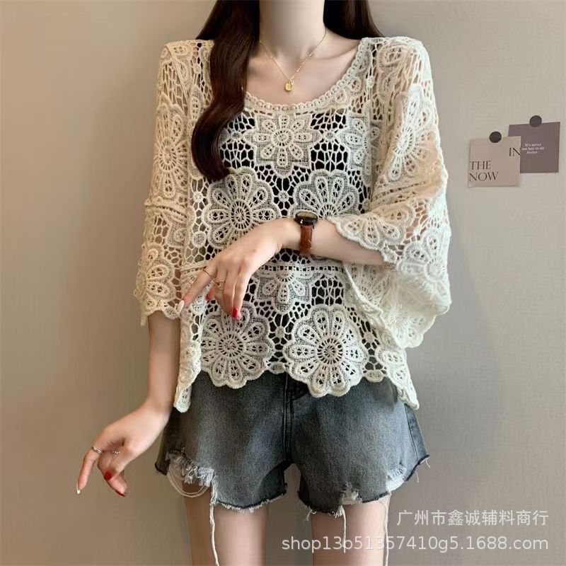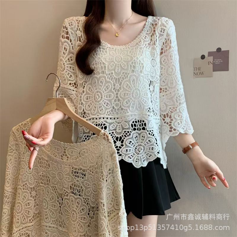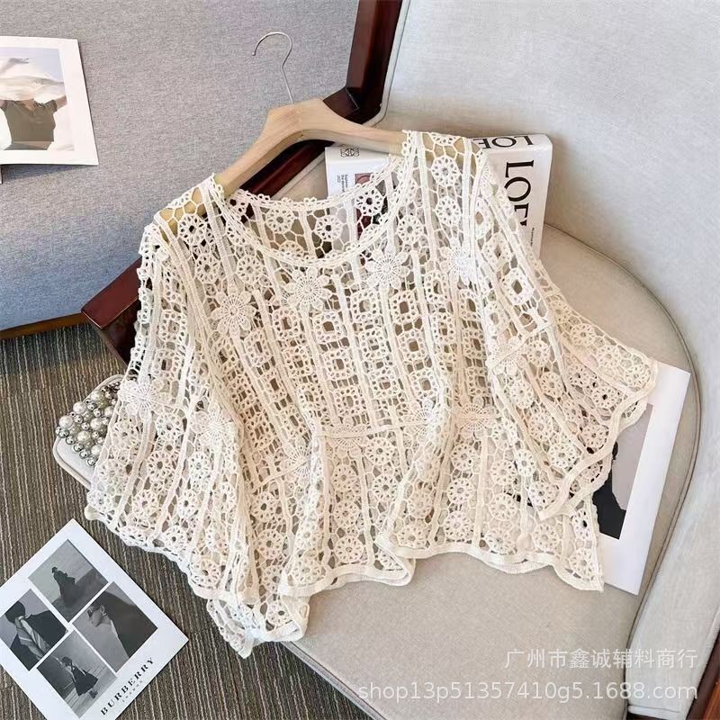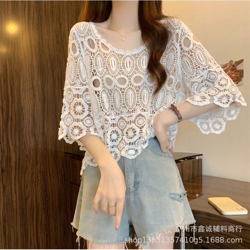 프랑스 스타일 우아한 레이스 셔츠 여성의 여름 새로운 복고풍 니트 스웨터 오버 셔츠 중공 크로 셰 탑 여성스토어 가기