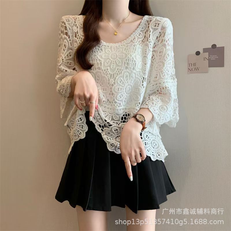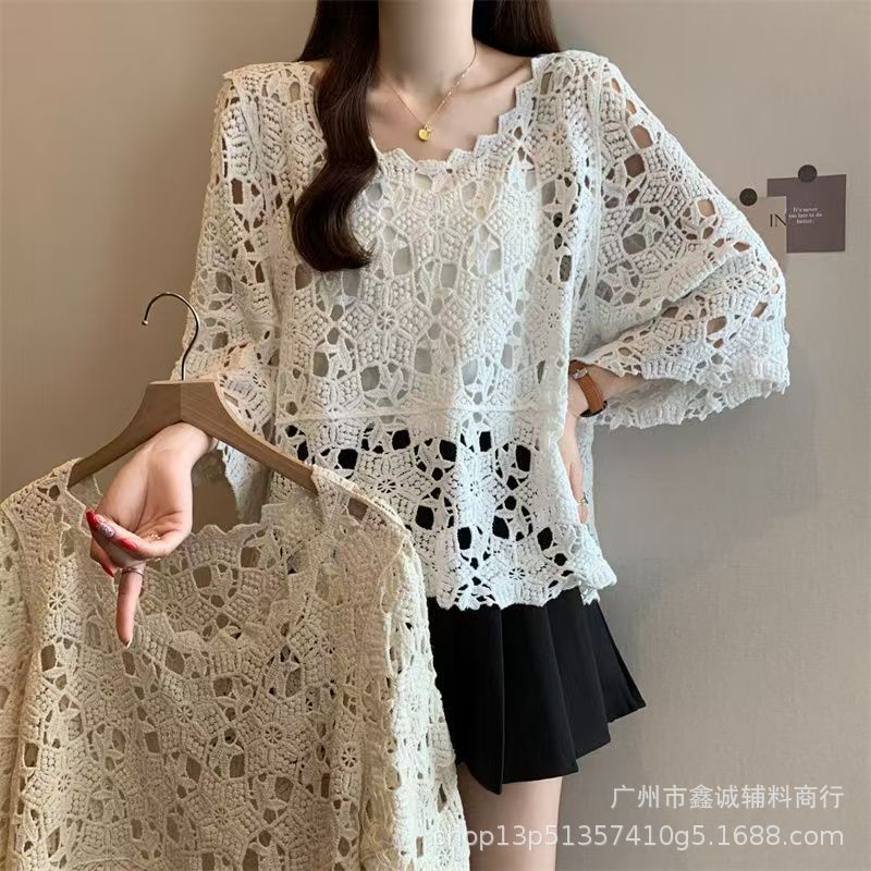 프랑스 스타일 우아한 레이스 셔츠 여성의 여름 새로운 복고풍 니트 스웨터 오버 셔츠 중공 크로 셰 탑 여성
