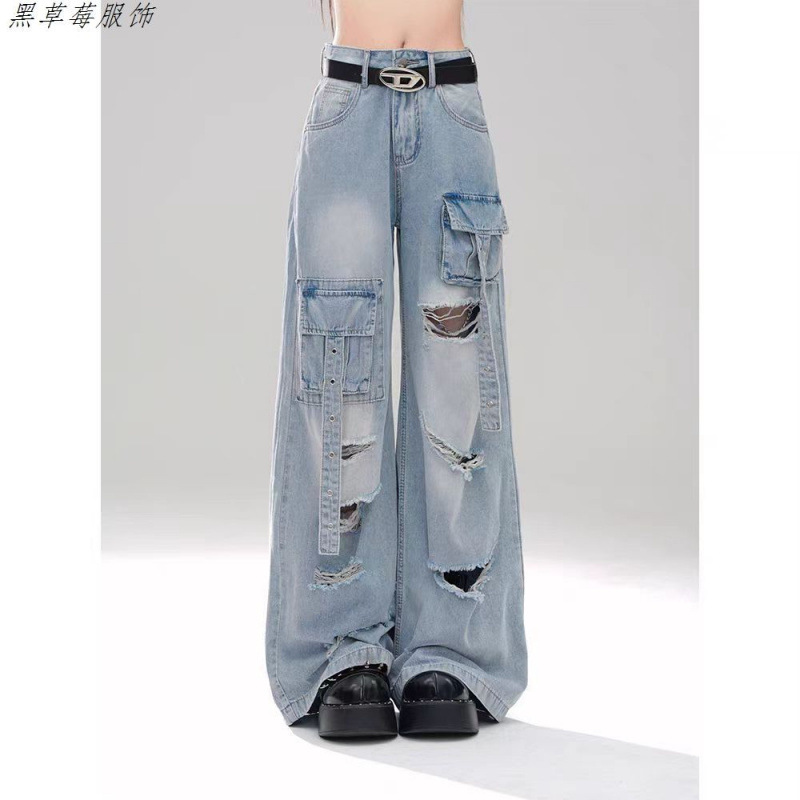 아메리칸 스타일 하이 스트리트 라이트 컬러 포켓 찢어진 툴링 청바지 여성의 여름 느슨한 슬림 넓은 다리 바지 미국 스타일 트렌디스토어 가기