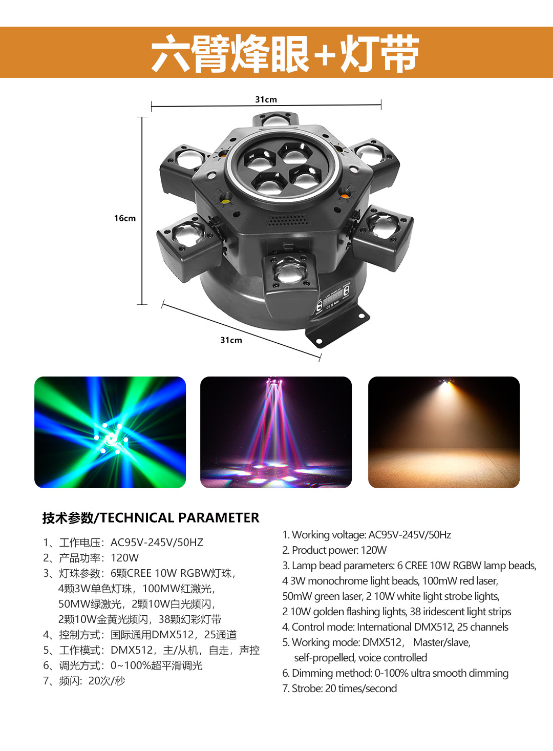 • 6암 꿀벌 눈 레이저 광 + 조명 스트립 + 리모콘
