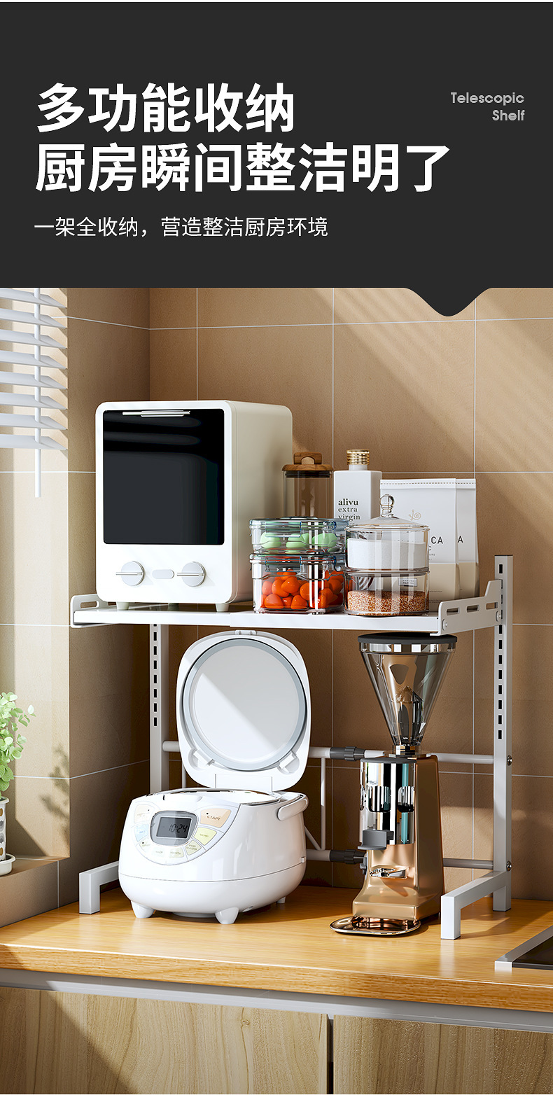 Whoa 개폐식 전자 레인지 랙 수축 가능한 저장 랙 가정용 전기 밥솥 랙 높이 조절 가능한 저장 랙 바닥 스탠딩 조미료 랙