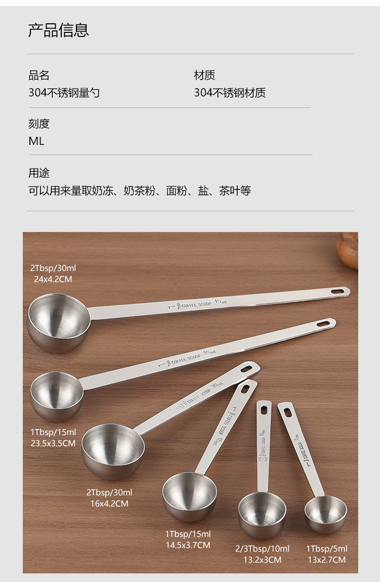 소스 제조업체는 다양한 사양의 304 스테인레스 스틸 계량 스푼, 정확한 정량 분유 스푼, 커피 베이킹 계량 스푼을 직접 공급합니다.스토어 가기