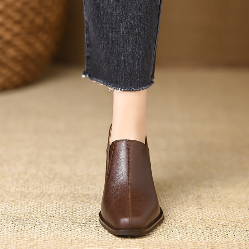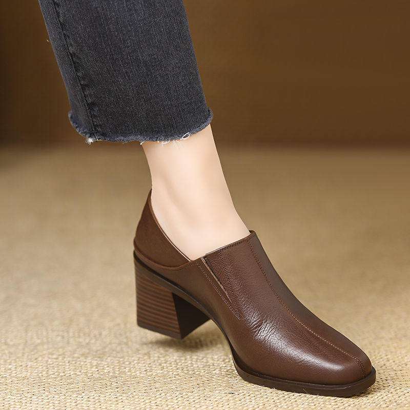 2025 봄과 가을 고급 깊은 입 사각형 발가락 두꺼운 굽 통근 작은 가죽 신발 여성 검은 하이힐 부드러운 가죽 신발 가을