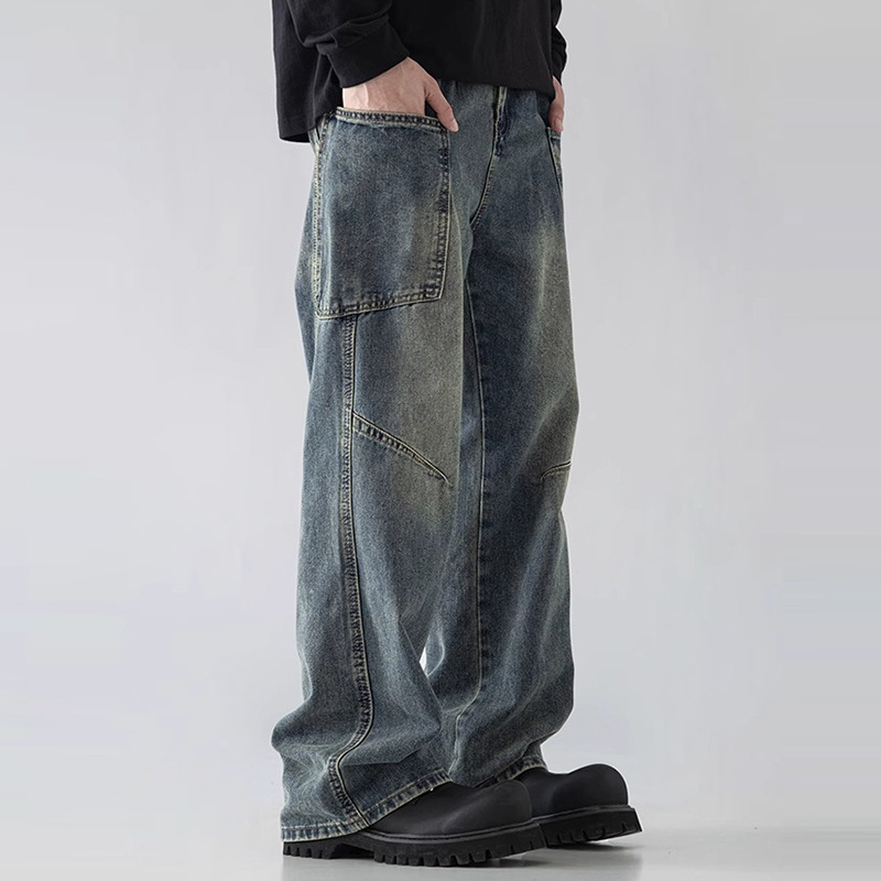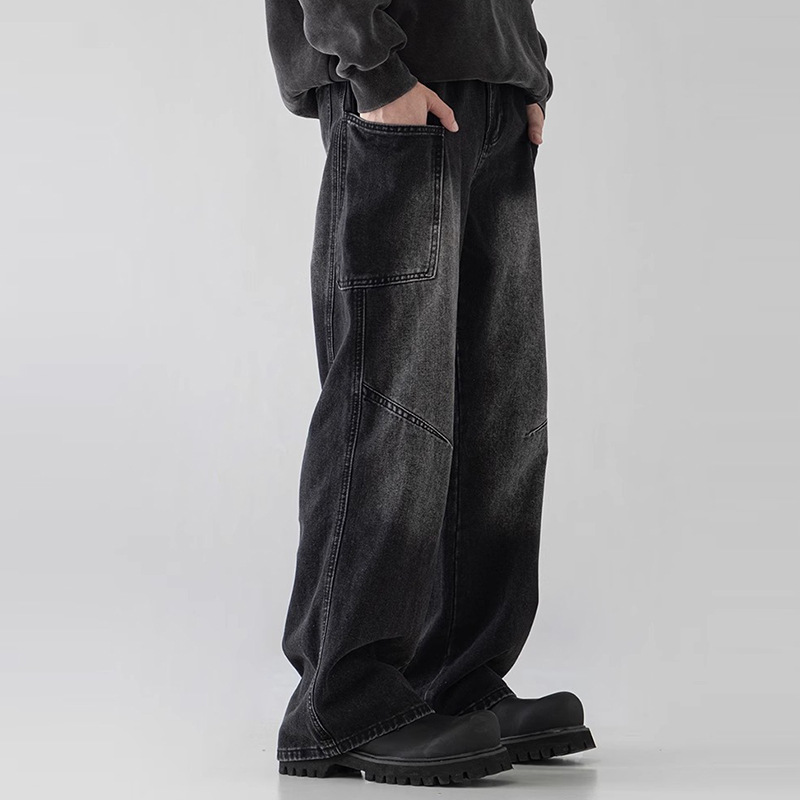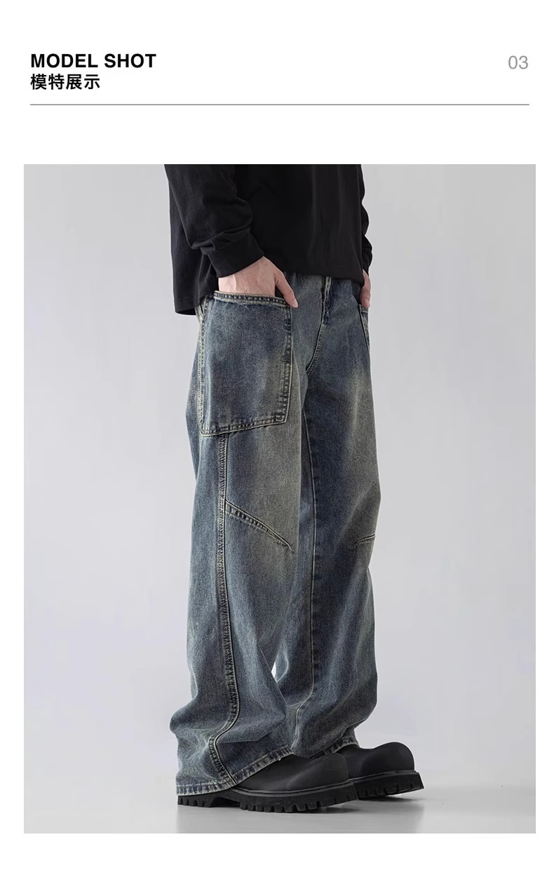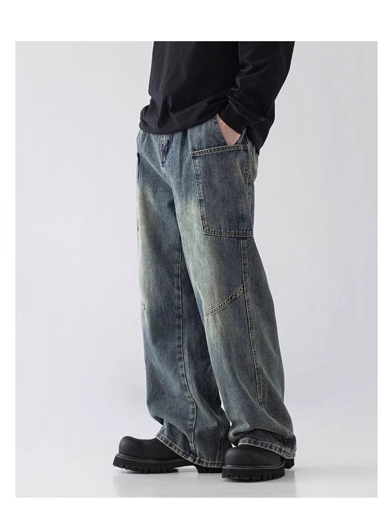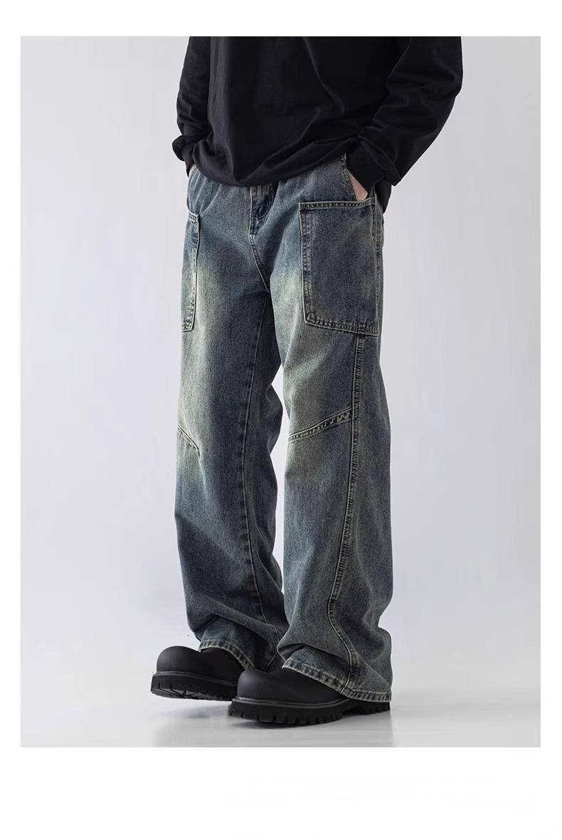 아메리칸 포켓 워크 청바지 남성용 스트레이트 루즈 와이드 레그 워싱 레트로 팬츠 트렌디하고 다재다능한 캐주얼 바지스토어 가기