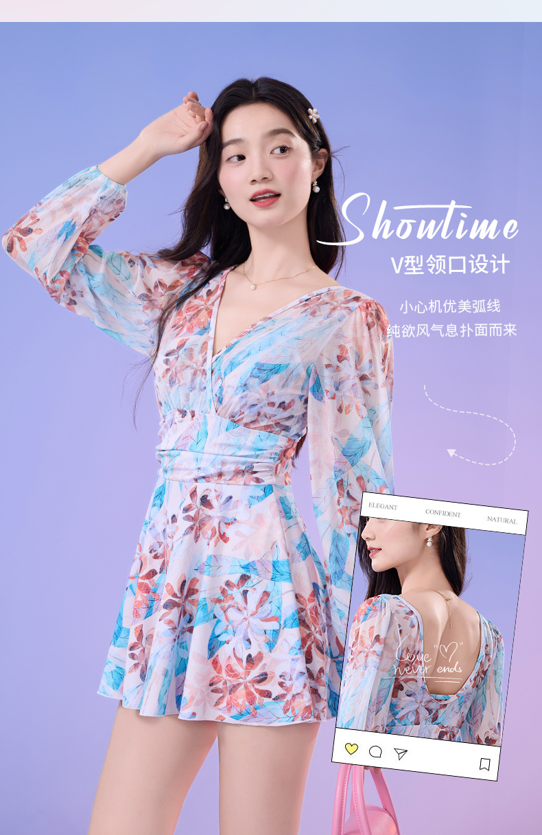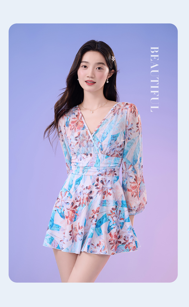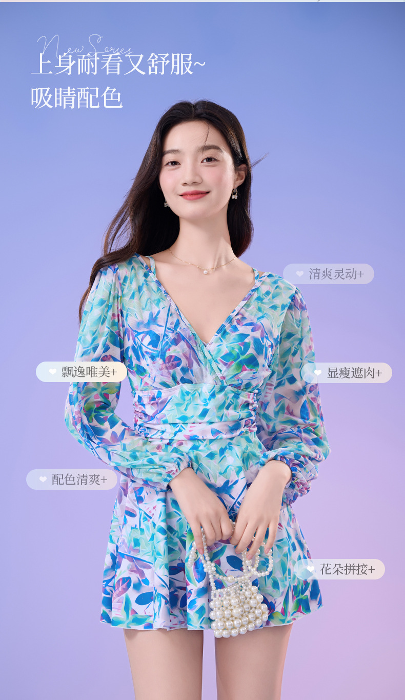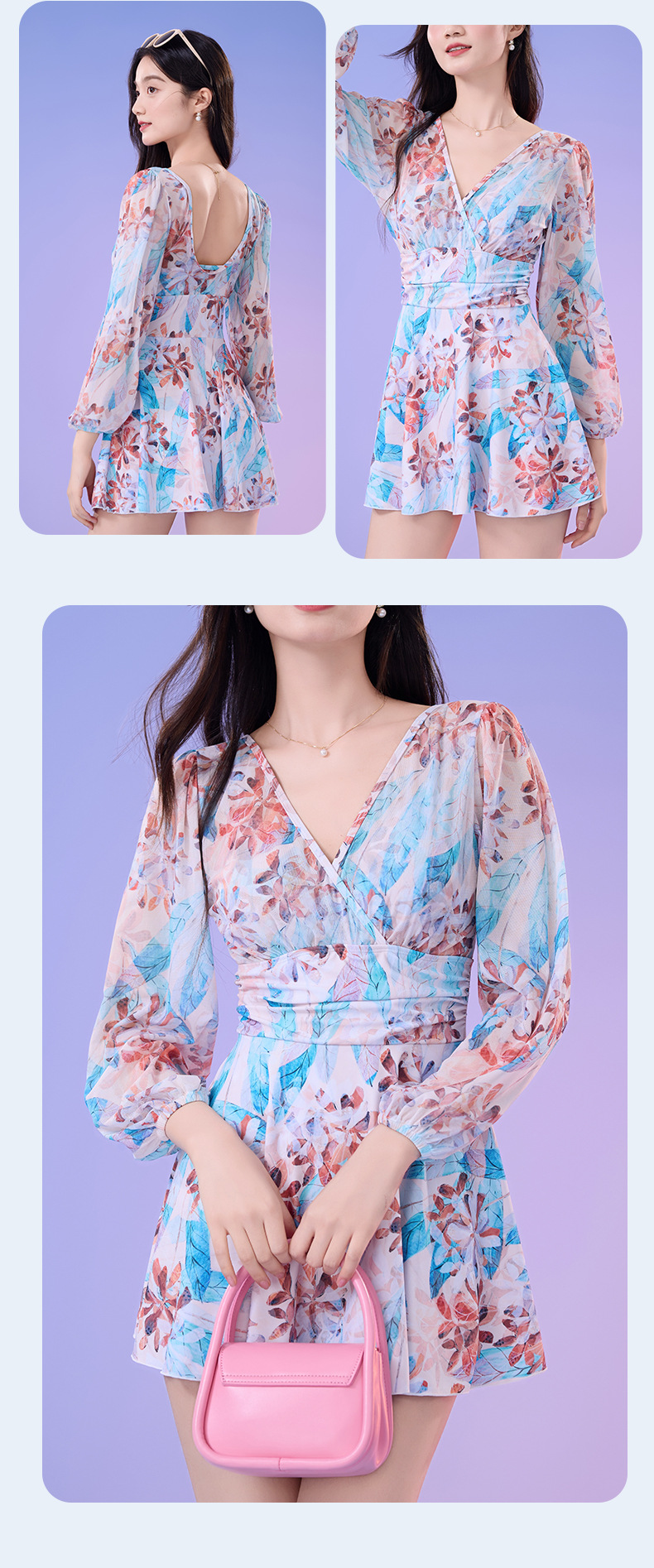 뚱뚱한 여자를 위한 플러스 사이즈 수영복, 살을 커버하고 날씬해 보이는 원피스 수영복, 해변 온천 브이넥 블루 꽃무늬 수영복스토어 가기