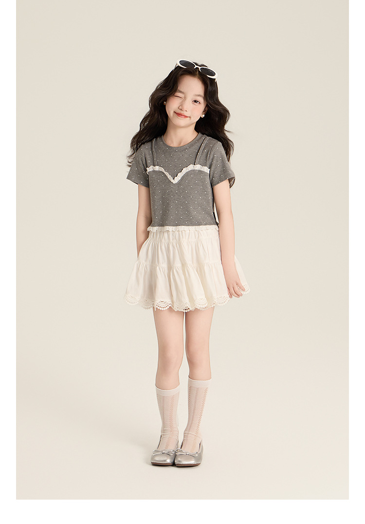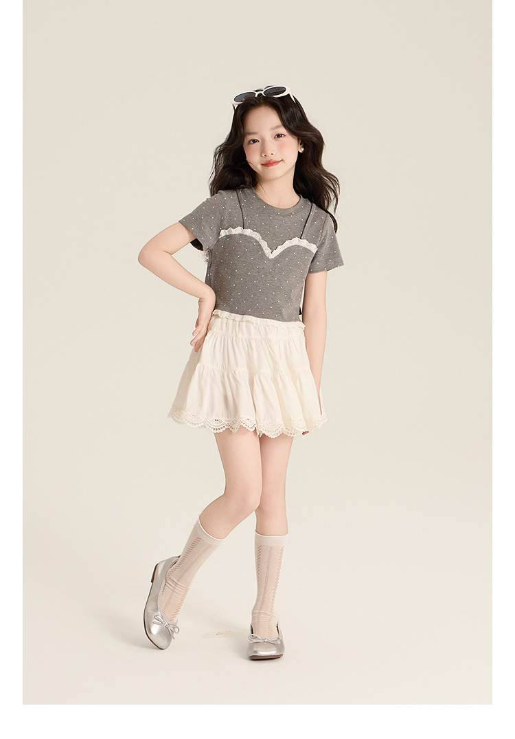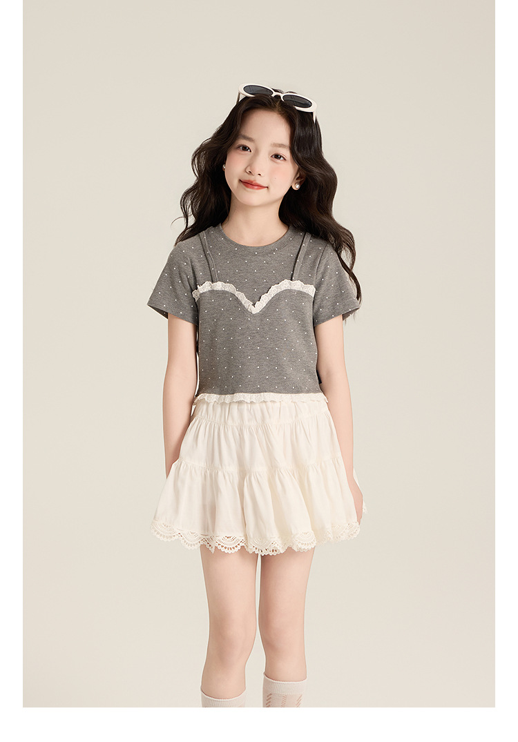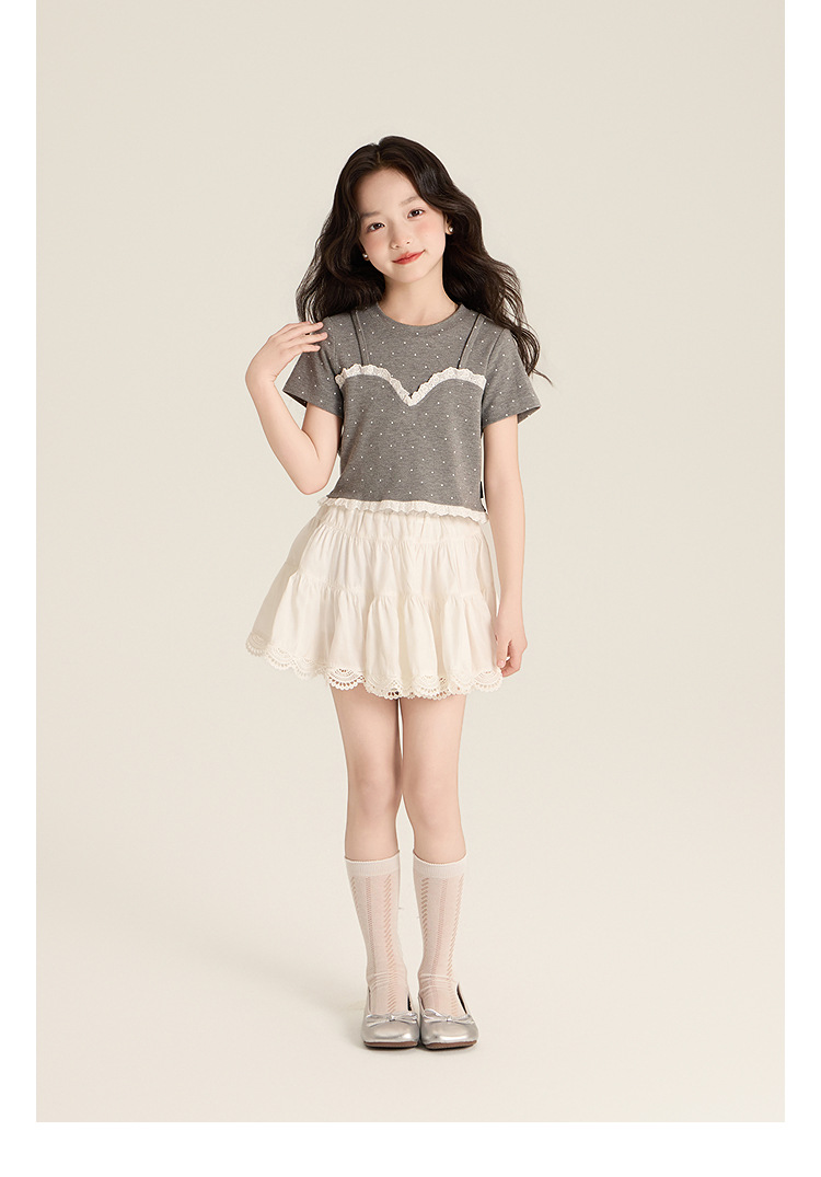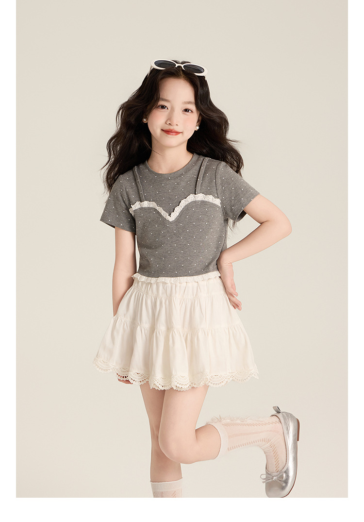 Amybaby Girls 'Top Summer 2025 새로운 한국 스타일 연인 레이스 가짜 투피스 짧은 소매