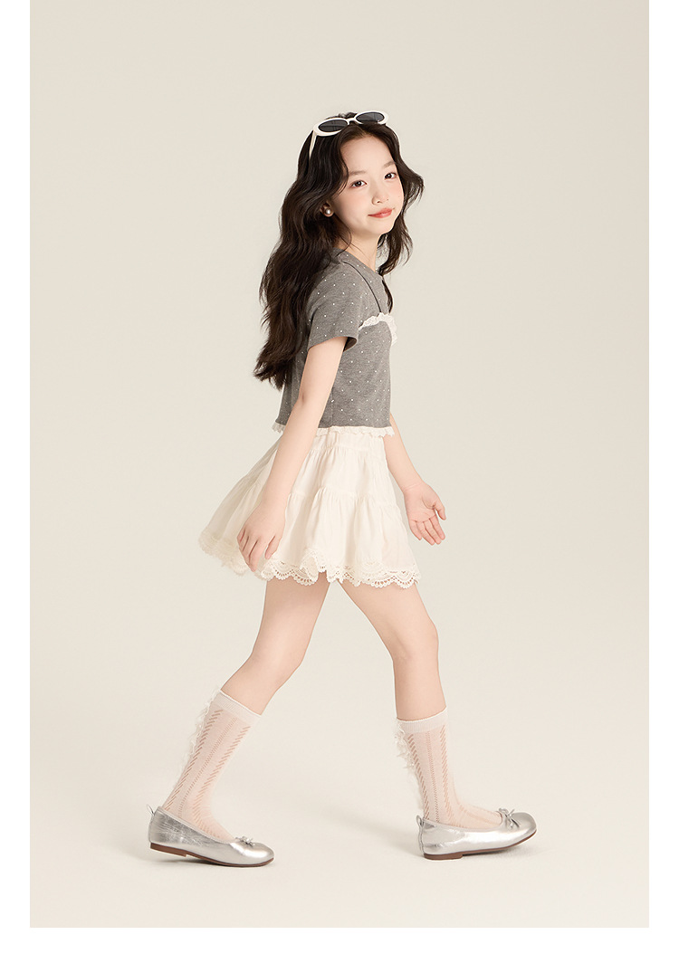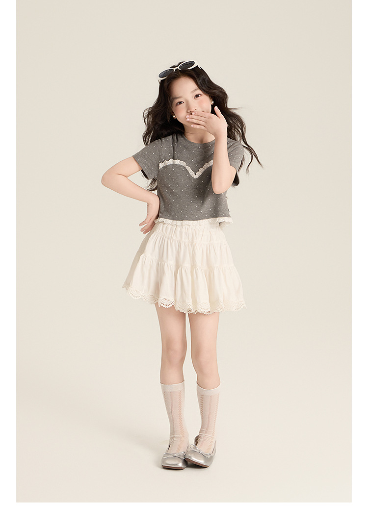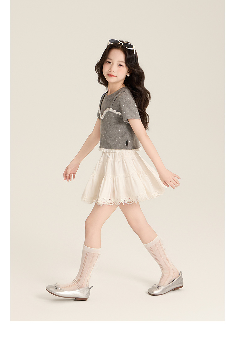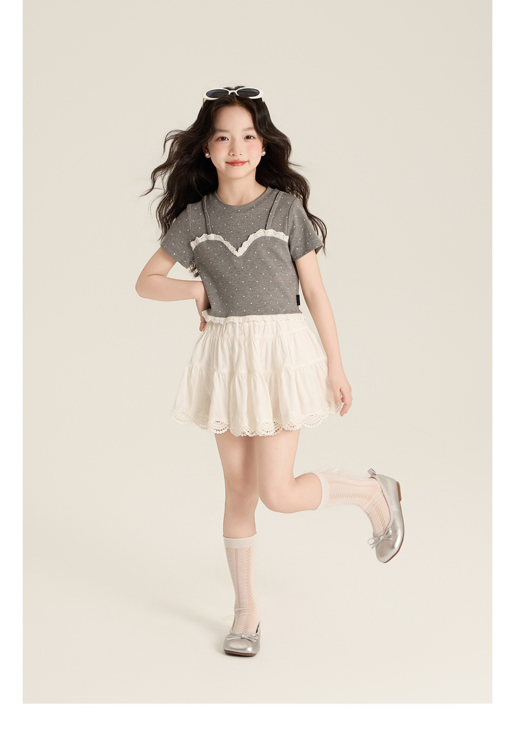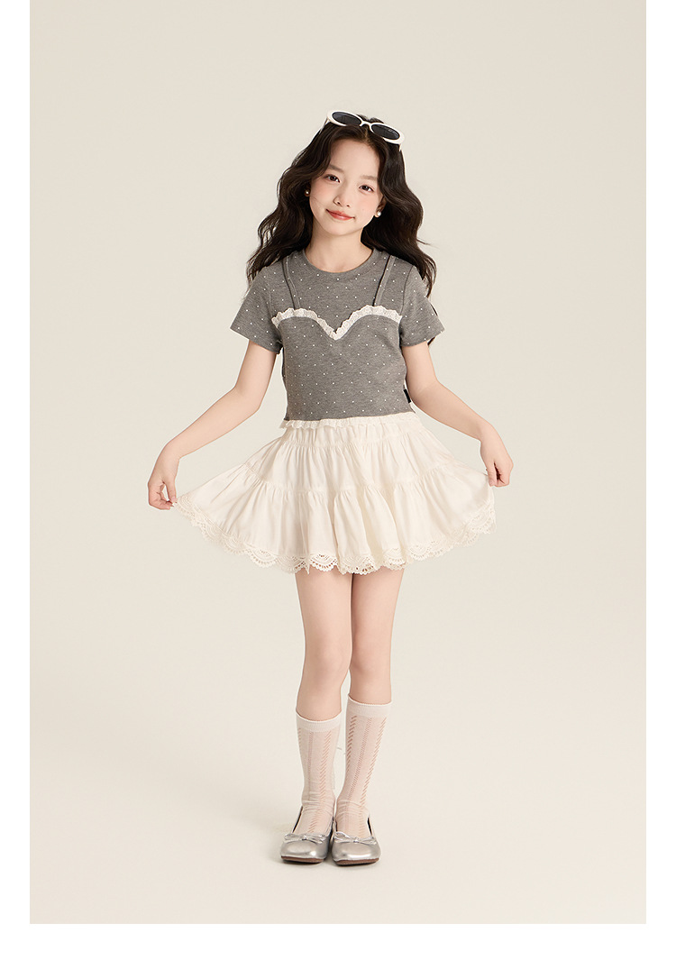 Amybaby Girls 'Top Summer 2025 새로운 한국 스타일 연인 레이스 가짜 투피스 짧은 소매