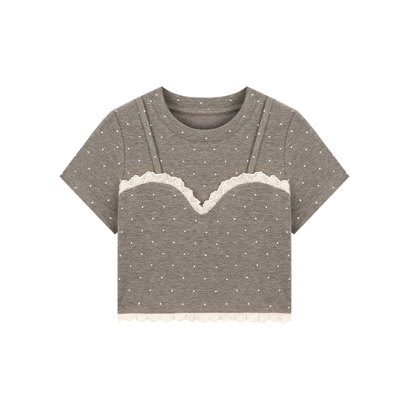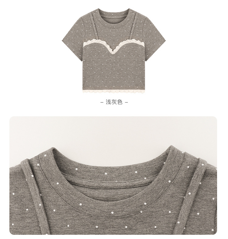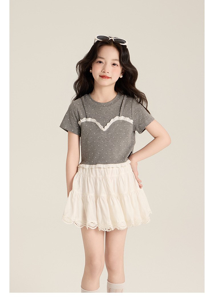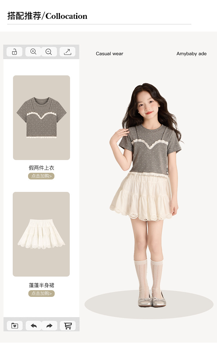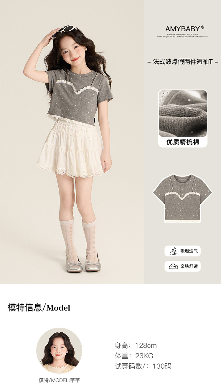 Amybaby Girls 'Top Summer 2025 새로운 한국 스타일 연인 레이스 가짜 투피스 짧은 소매스토어 가기