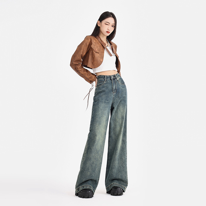 【实拍】高腰阔腿复古牛仔裤女秋季2023年新款宽松显瘦直筒拖地裤