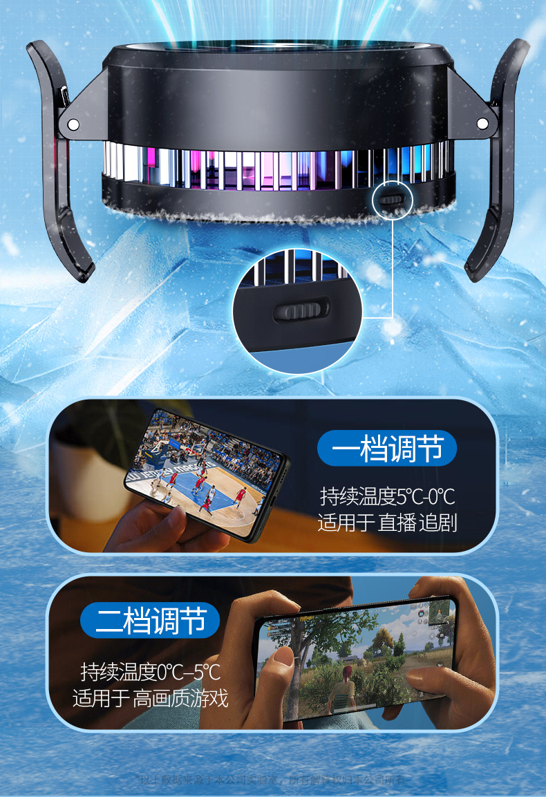 产品特色:炫酷拼色外观,带三档调节,快速让手机降温20多度。而且轻量化设计,能够随时携带,不会给您的手机增加任何负担。另有温度显示版本,可随时显示制冷温度,可视化体验,性价比很高,跑量优选!