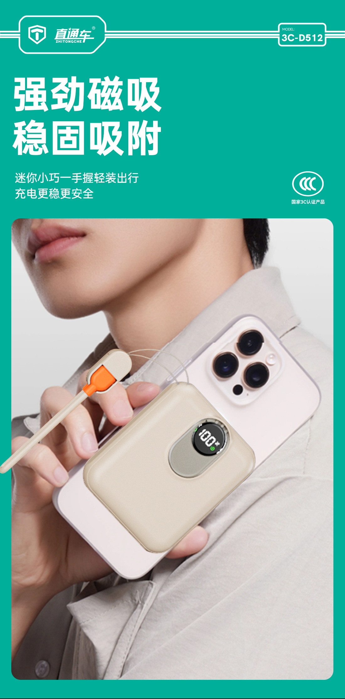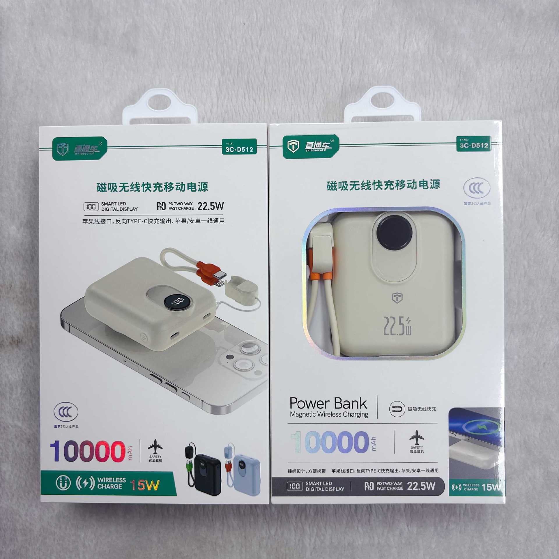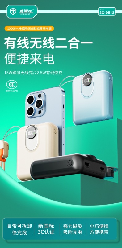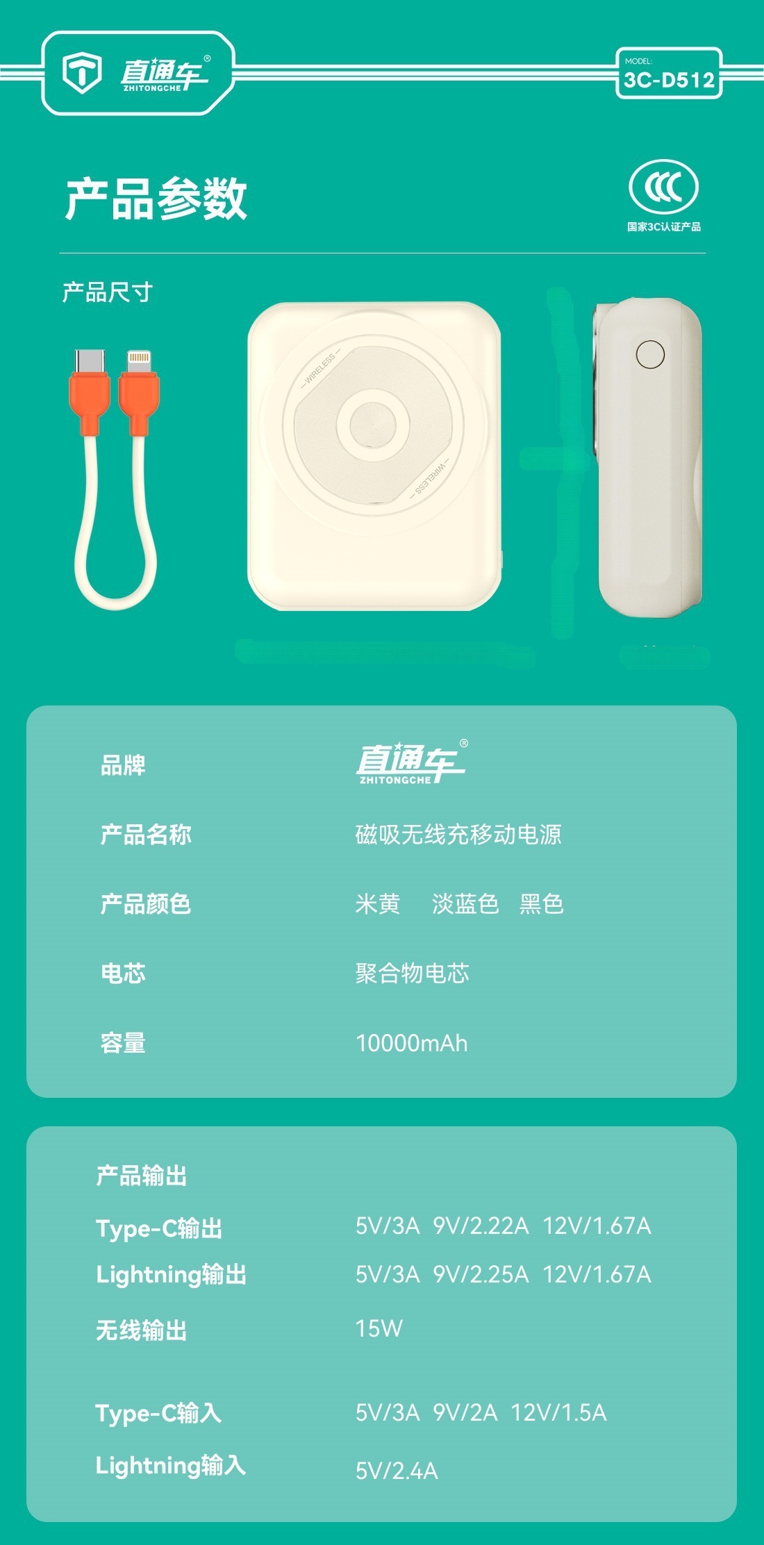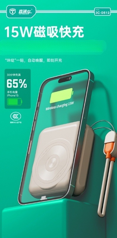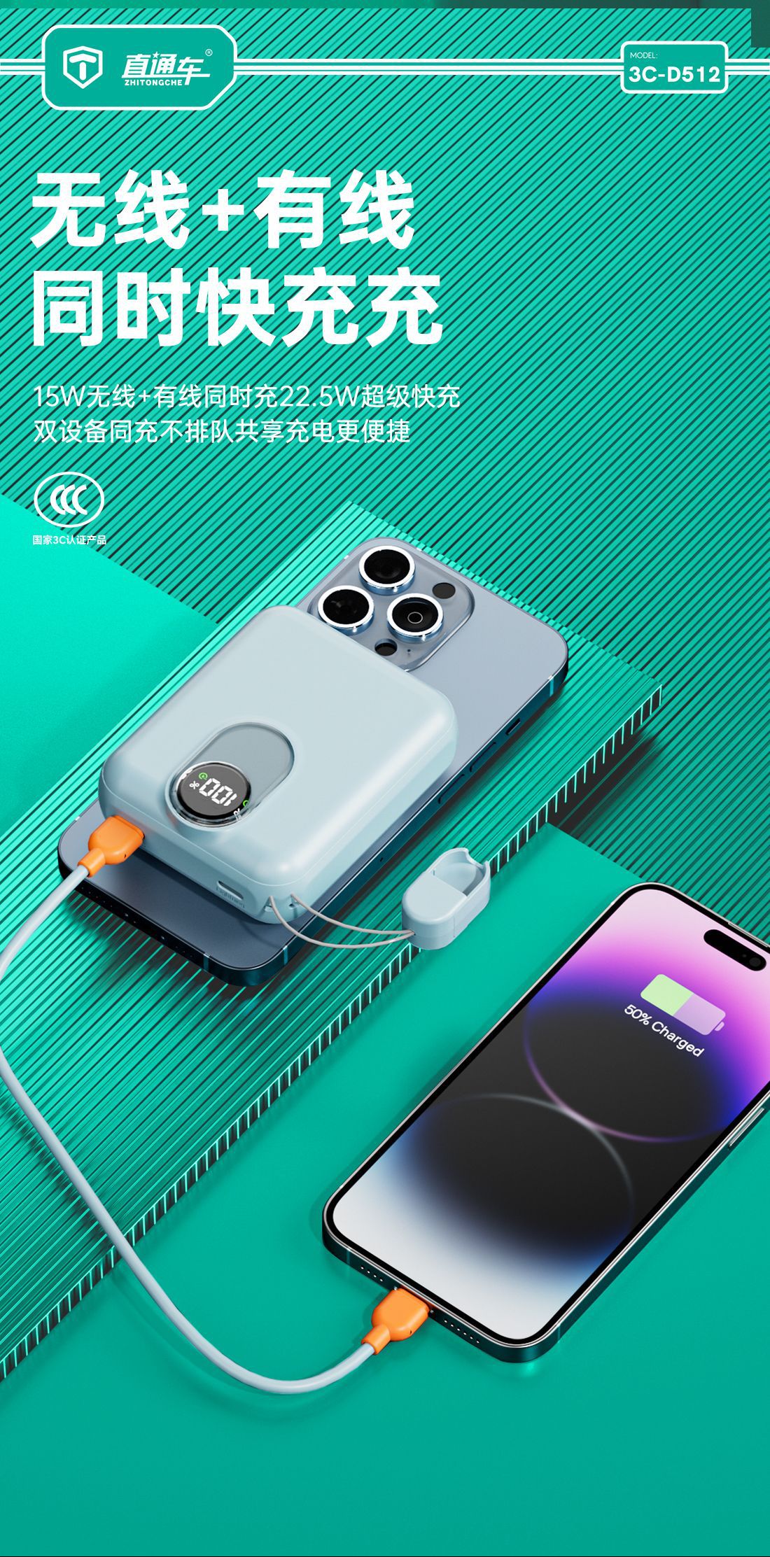 产品特点,15W无线充+PD22.5W带线输出。同时享有磁吸的便捷和充电速度。磁吸一贴自启动无线充功能。无需按键启动。苹果接口双向输入输出创新设计。一线多用。智能电量数显。告别用电焦虑。type-c接口双向输入输出。 内置多重安全保护芯片,PC阻燃外壳,保护设备安全性,大容量安全可靠,持久续航!