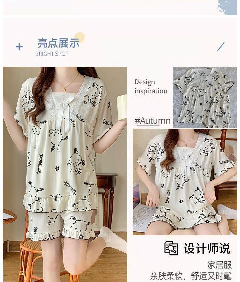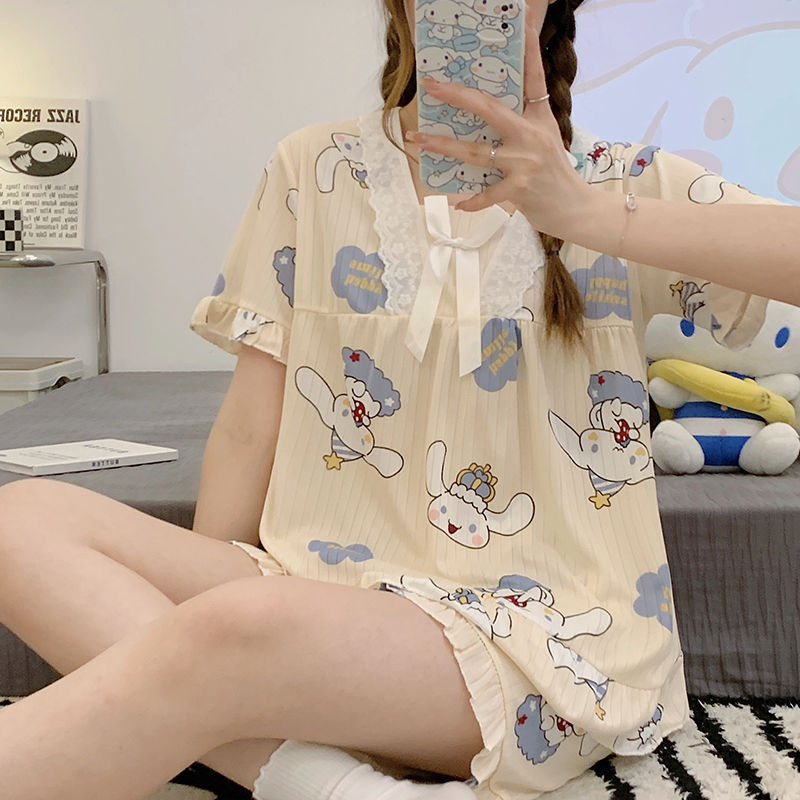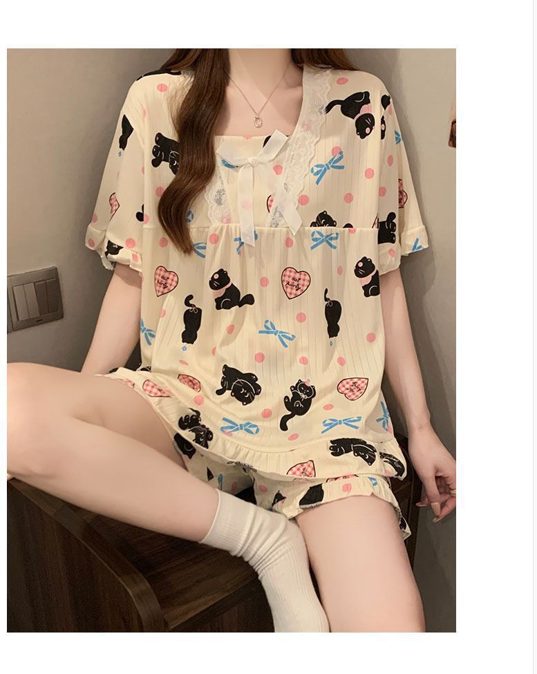 여름 잠옷 여성 반팔 잠옷 달콤한 레이스 스퀘어 칼라 느슨한 새로운 하이 페이스 가치 공주 스타일 홈 의류 세트스토어 가기
