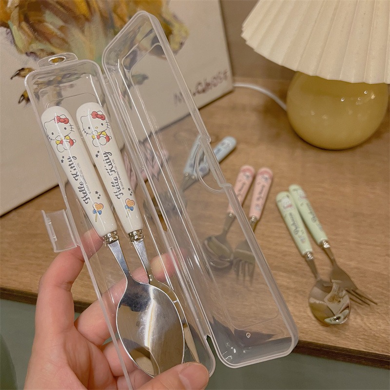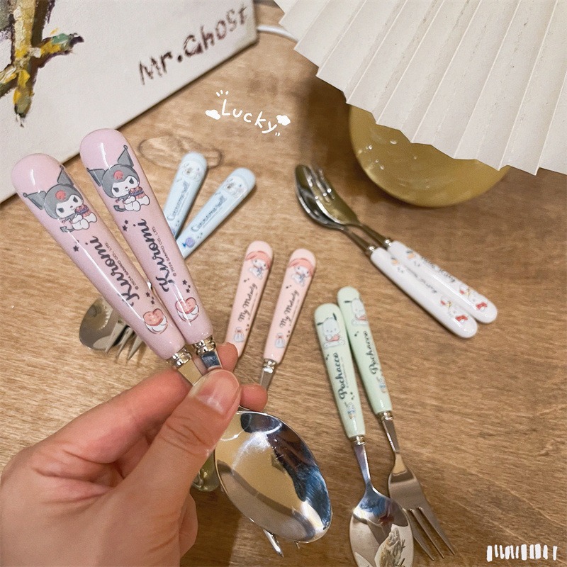 정품 산리오 세라믹 스푼과 포크 304 스테인레스 스틸 쿠로미 어린이 스푼 식품 보충 스푼 큰 귀 개 식기 세트