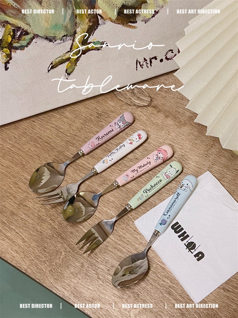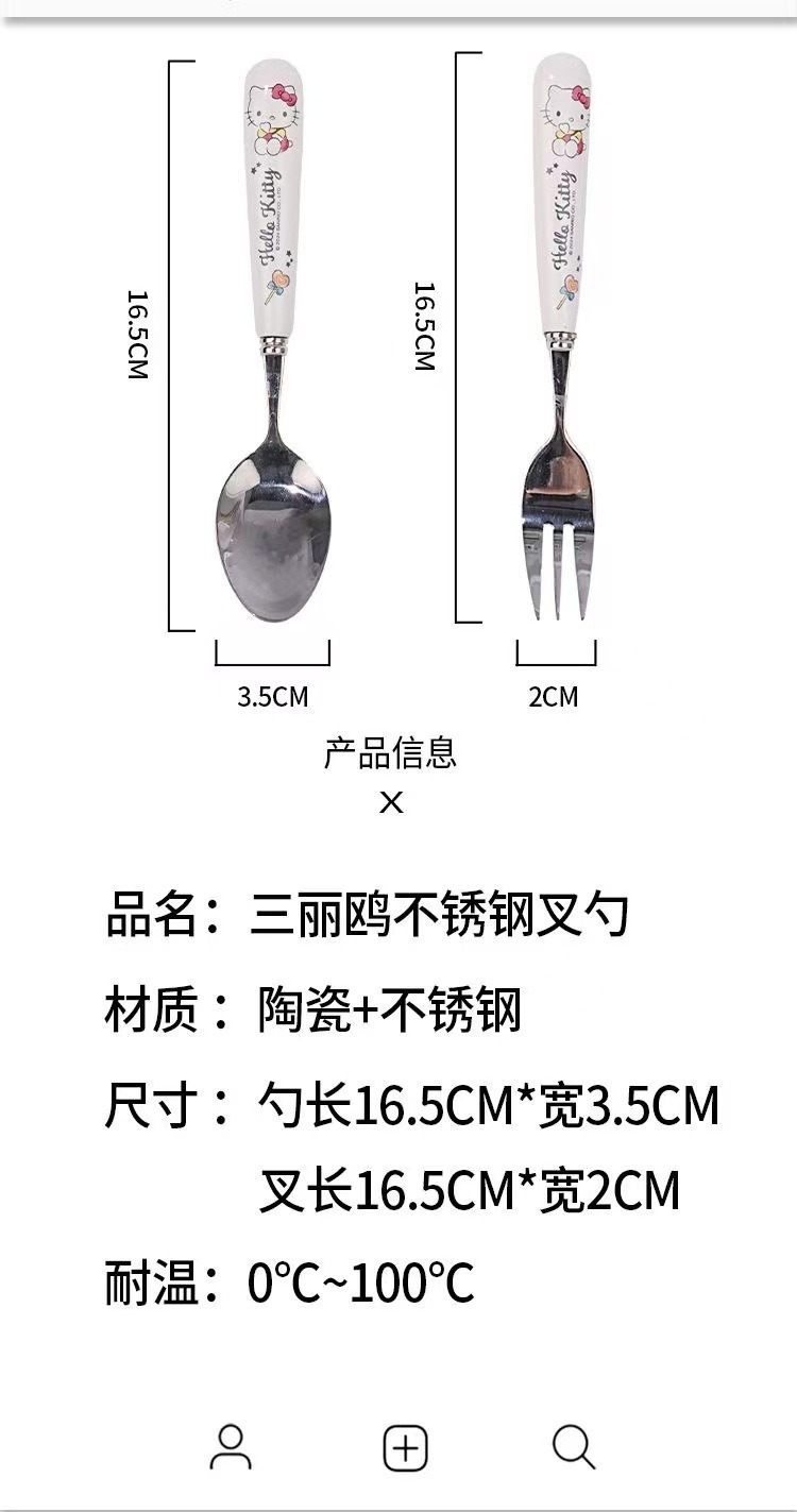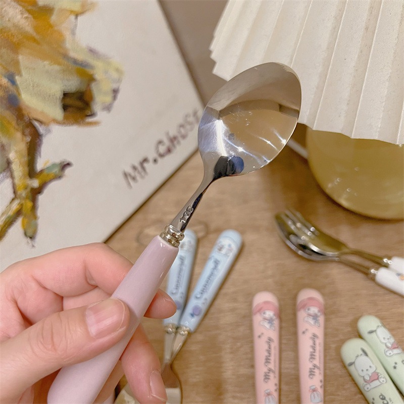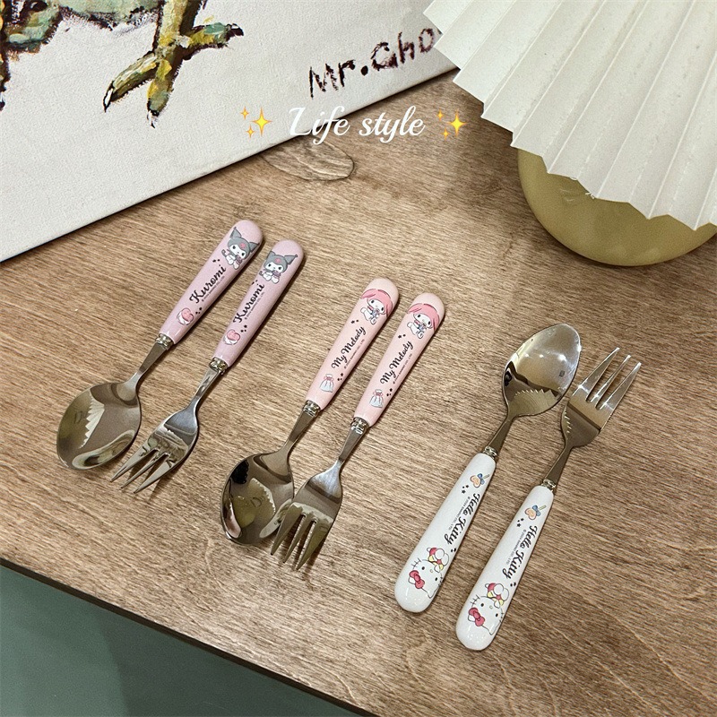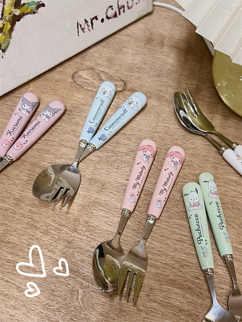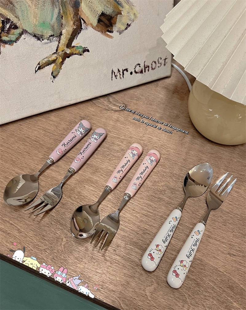 정품 산리오 세라믹 스푼과 포크 304 스테인레스 스틸 쿠로미 어린이 스푼 식품 보충 스푼 큰 귀 개 식기 세트스토어 가기