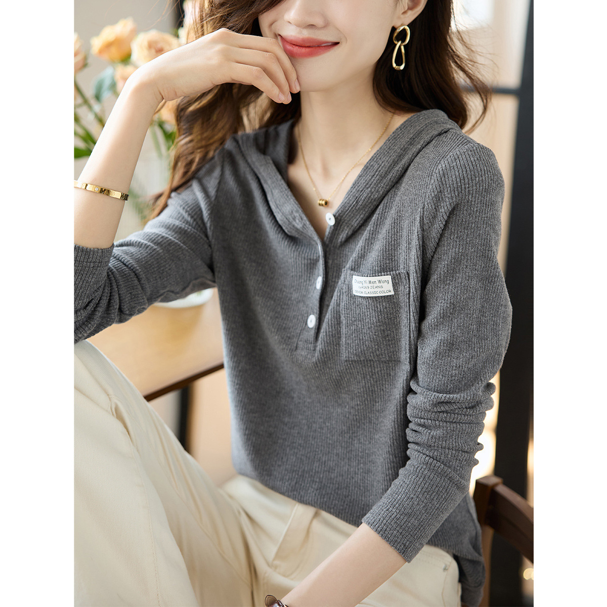 가슴 패치 포켓 디자인 2023 가을 새로운 패션 올 매치 캐주얼 편안한 슬리밍 후드 티셔츠