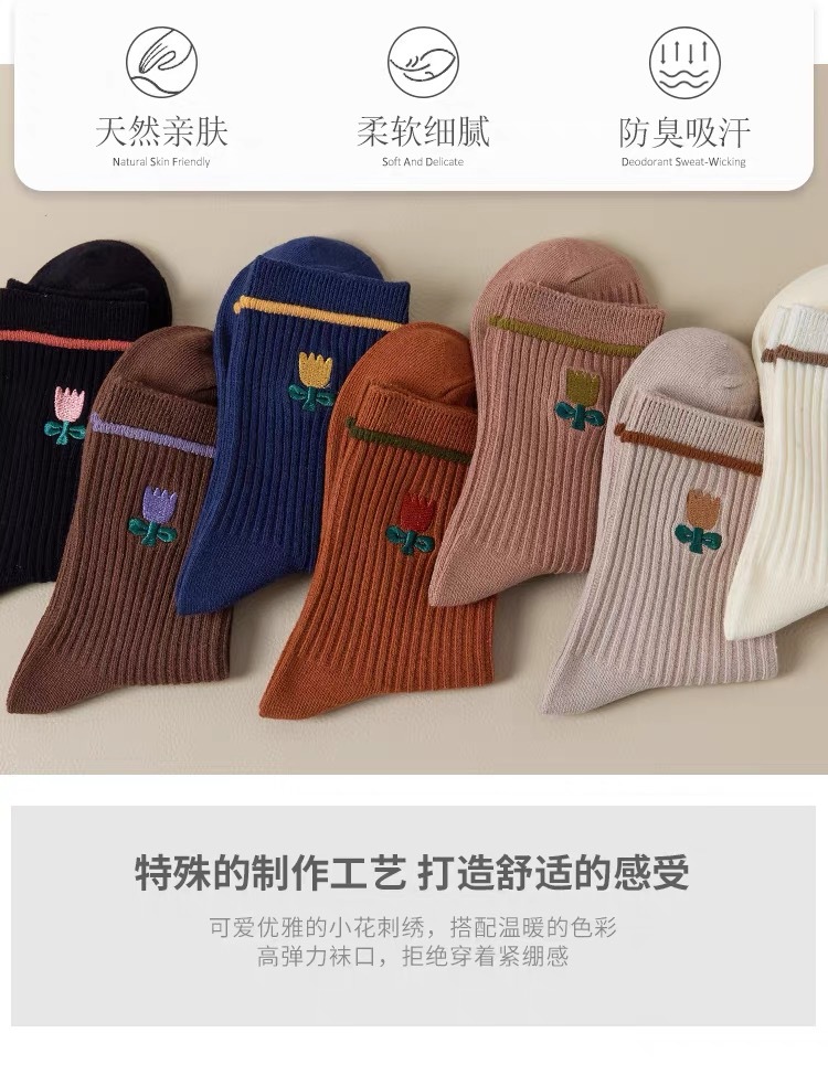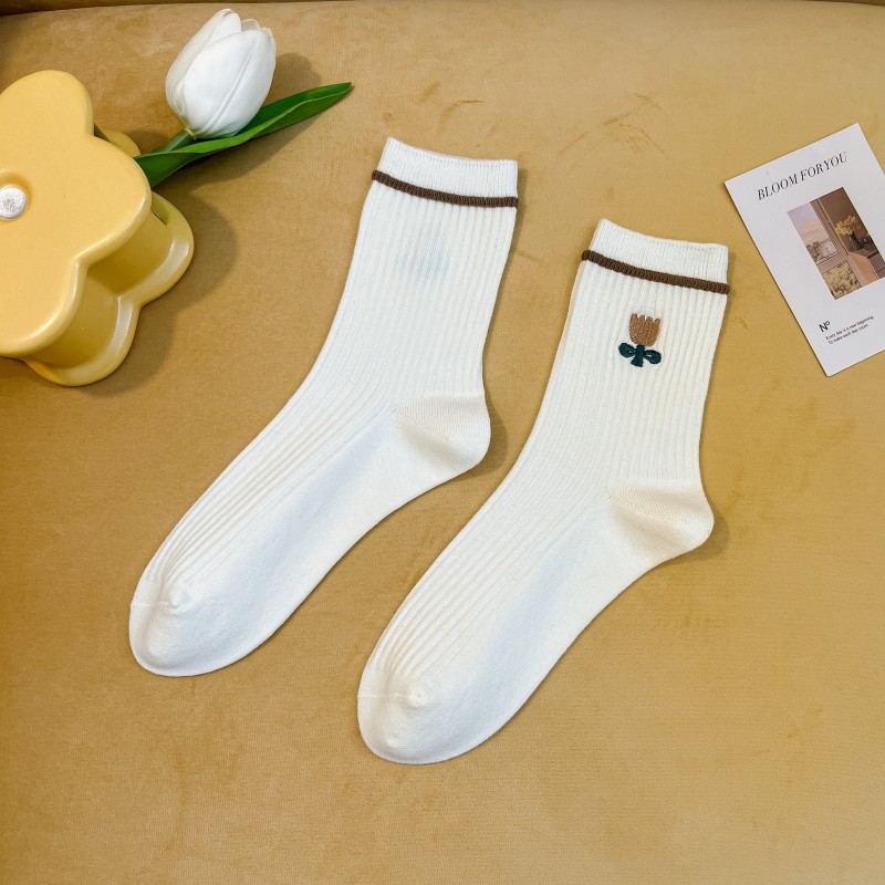 양말 여자 가을 겨울 더블 바늘 자수 중간 길이 양말 튤립 꽃 자수 스타킹 일본과 한국 스타일 면 양말 주지 양말스토어 가기