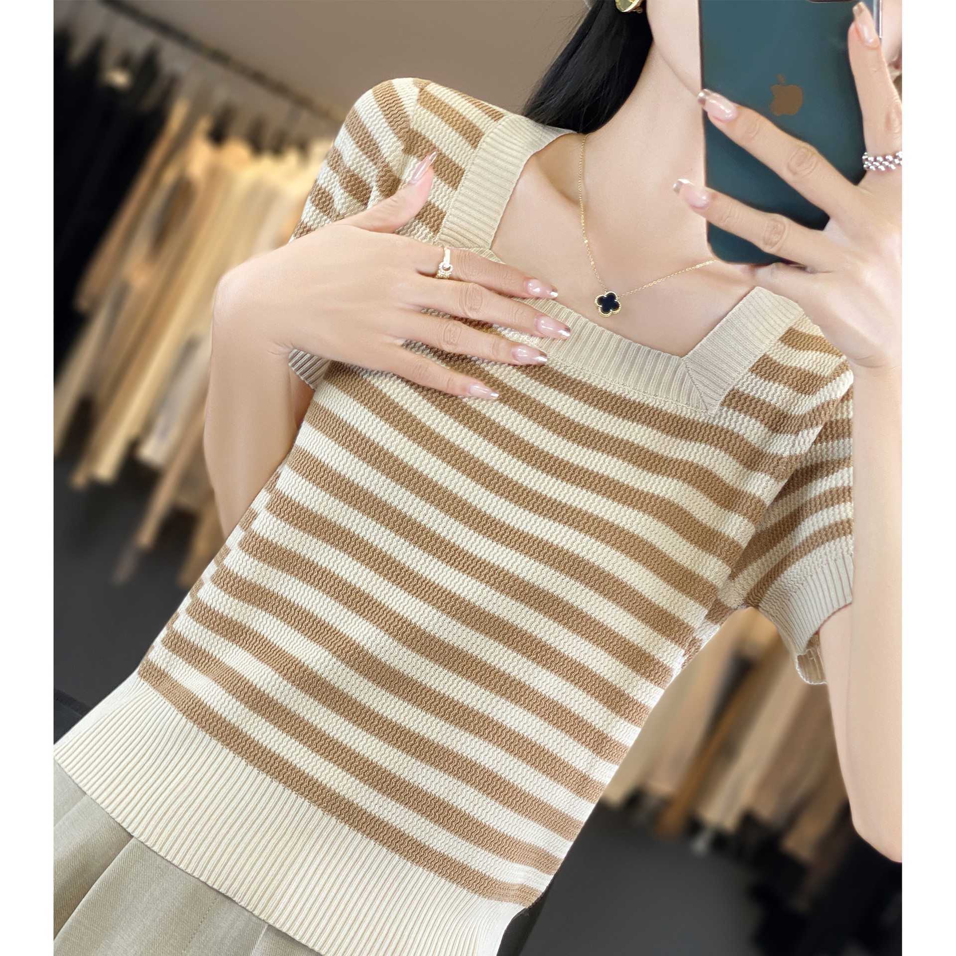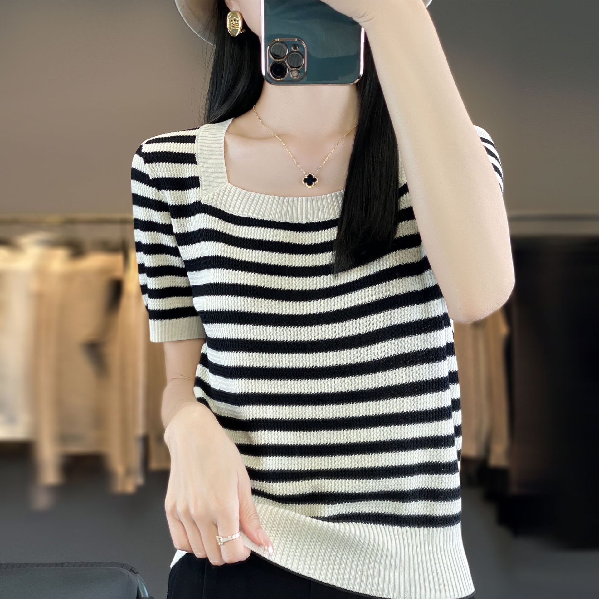 봄과 여름 2024 새로운 스타일 샤넬 스타일 새로운 반팔 대비 컬러 니트 셔츠 얇은 스웨터 여성용스토어 가기