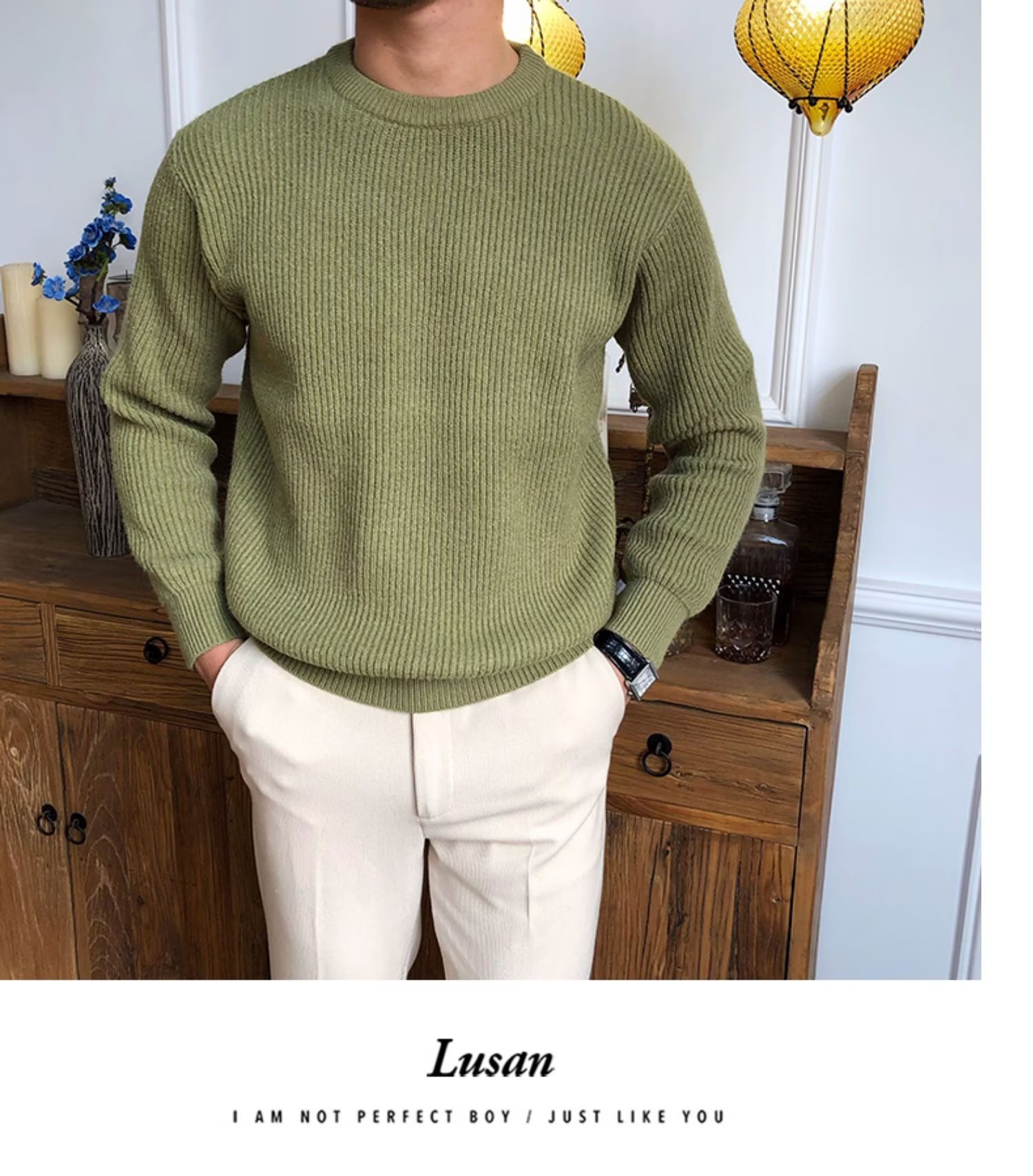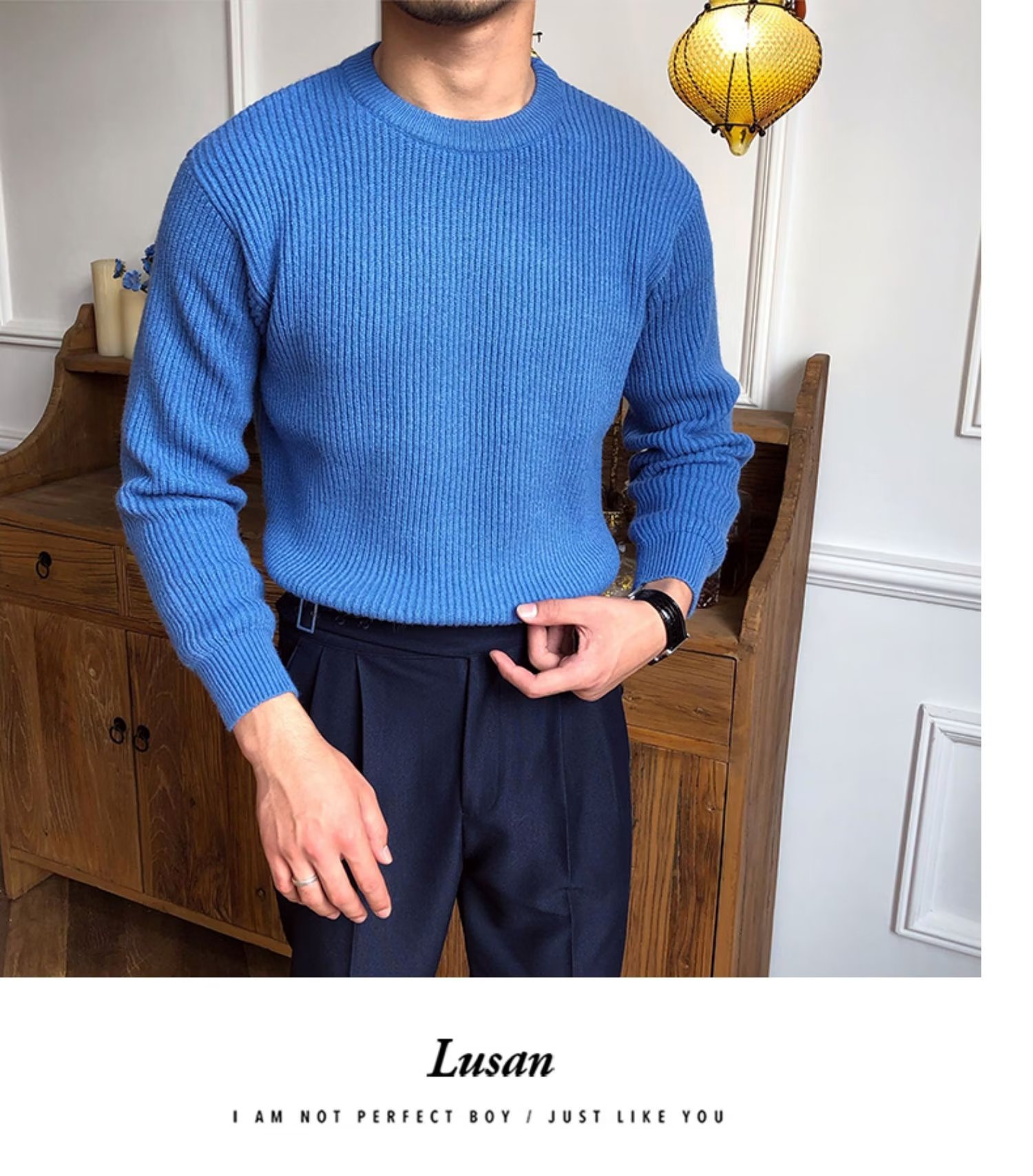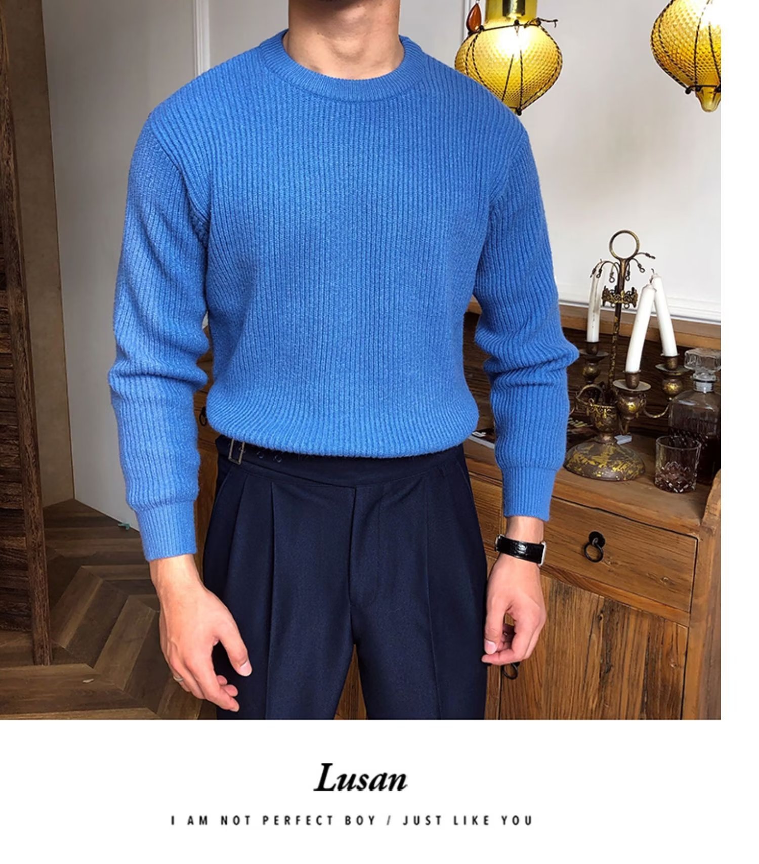 가볍고 성숙한 스타일의 가을 겨울 일본식 남성 긴팔 캐주얼 스웨터 영국 라운드 넥 풀오버 니트 베이스 스웨터 트렌디스토어 가기