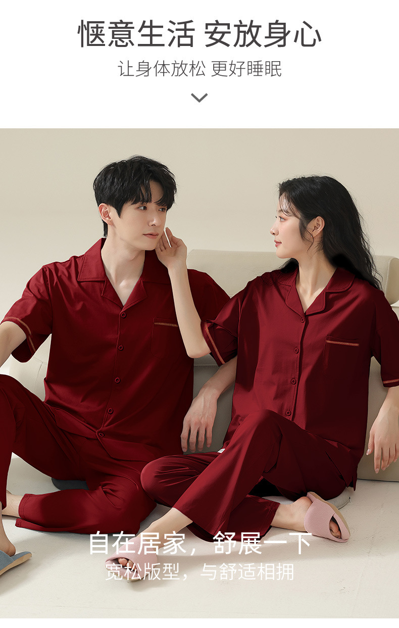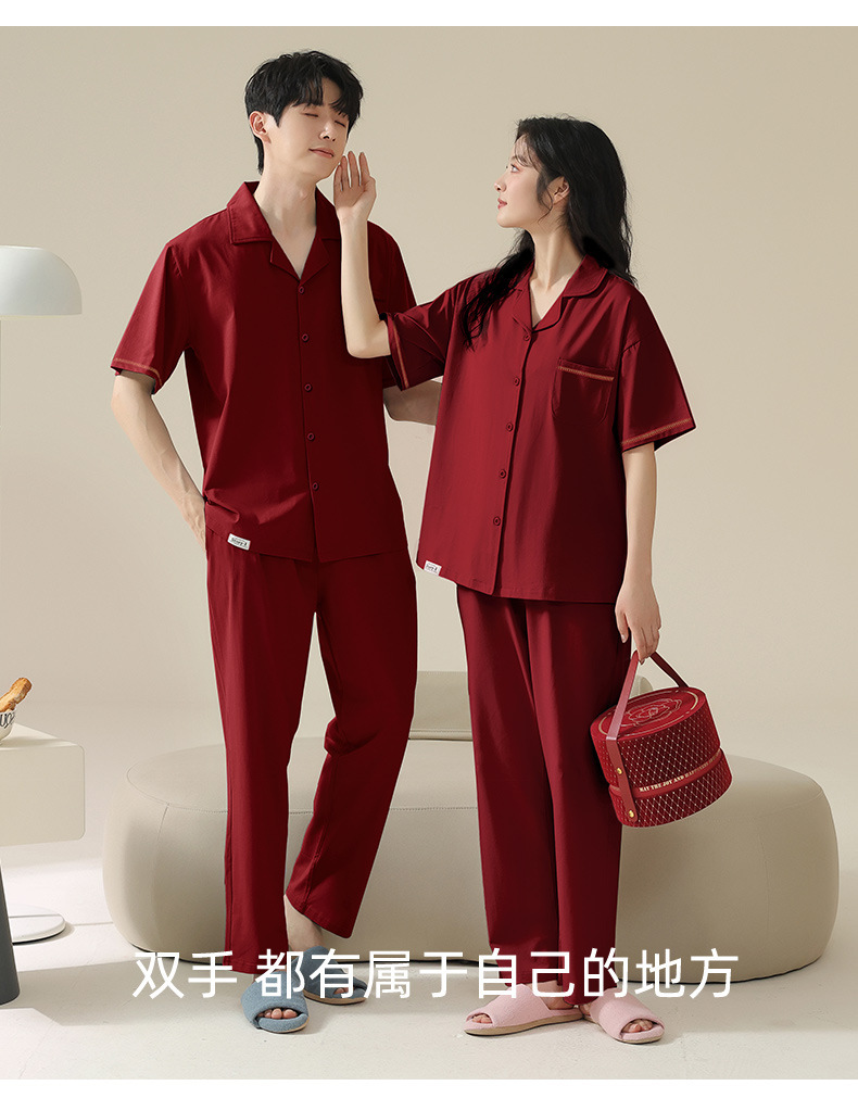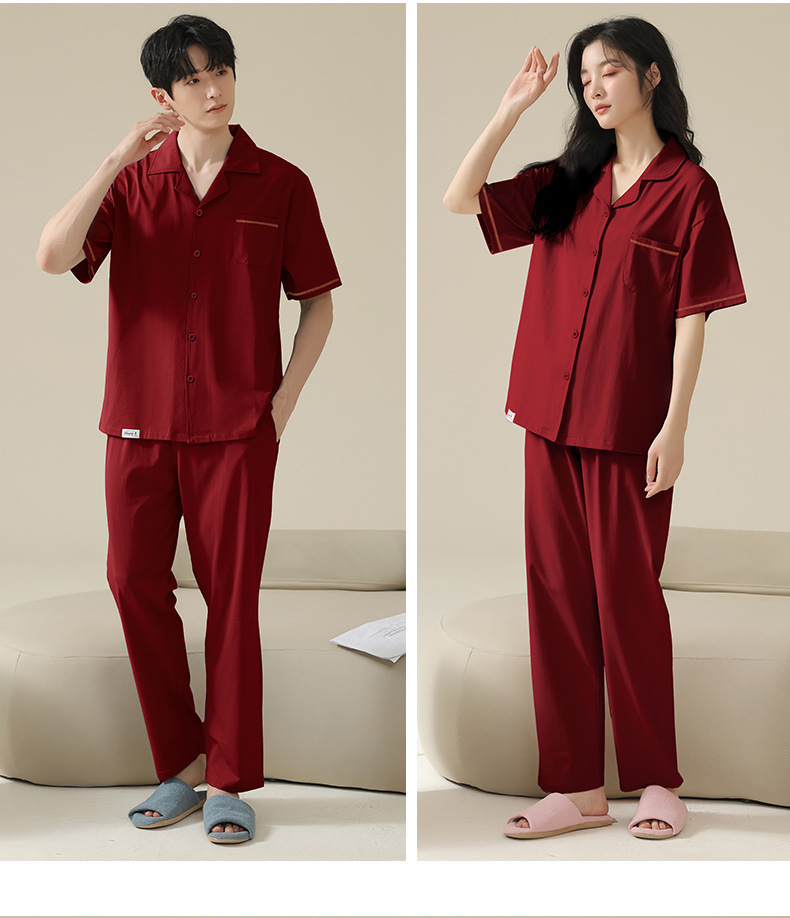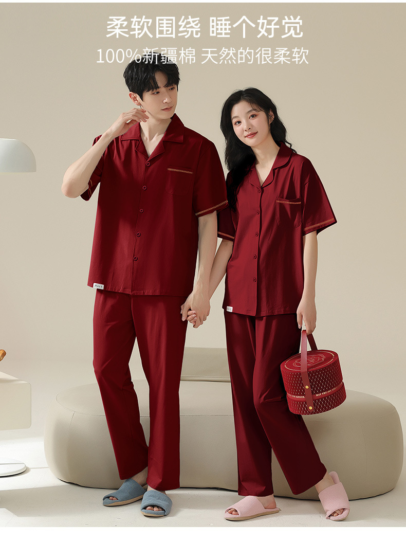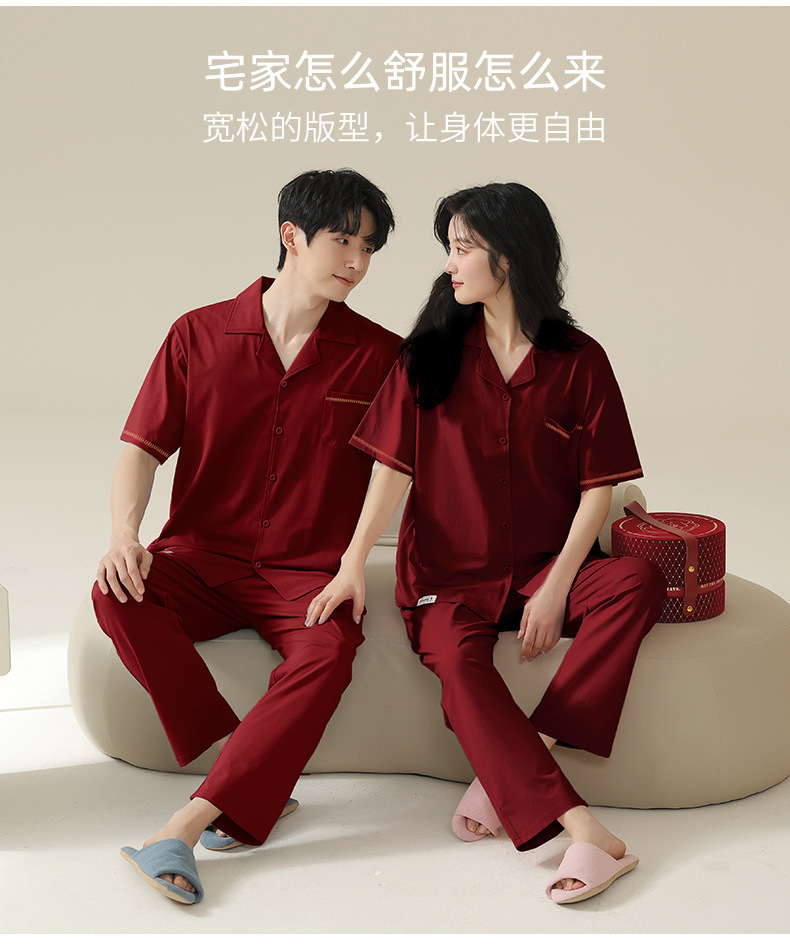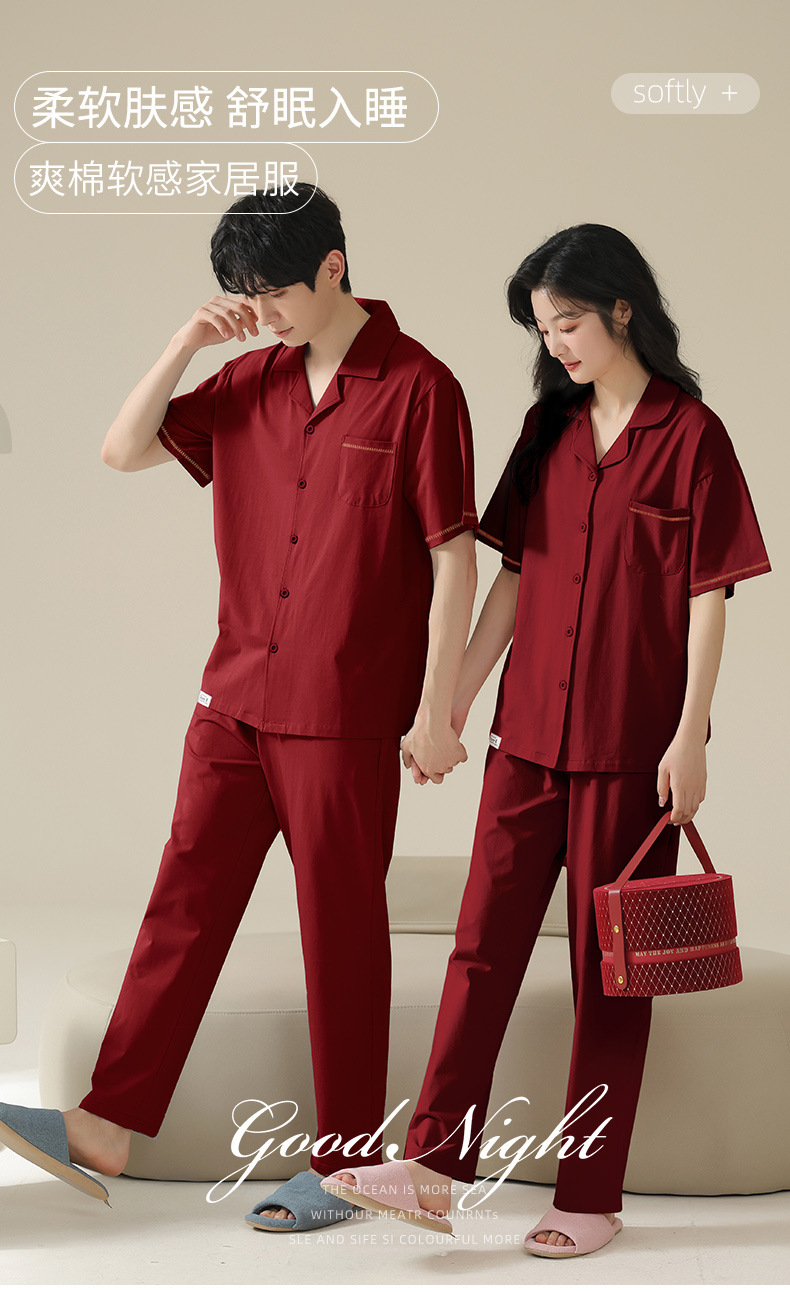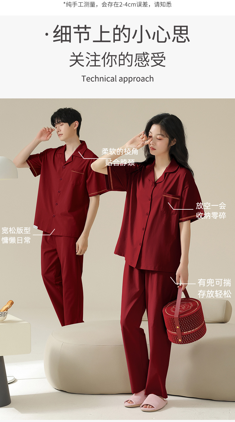 커플 잠옷 여름 반팔 바지 순수 코튼 레드 웨딩 신혼 홈웨어 세트 플러스 사이즈 남성과 여성스토어 가기