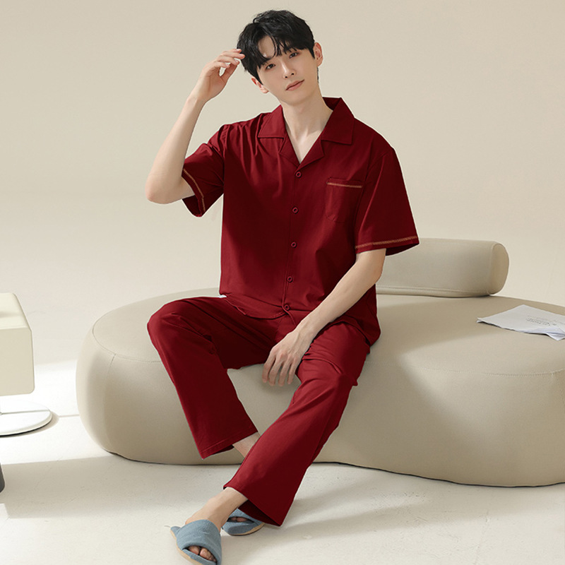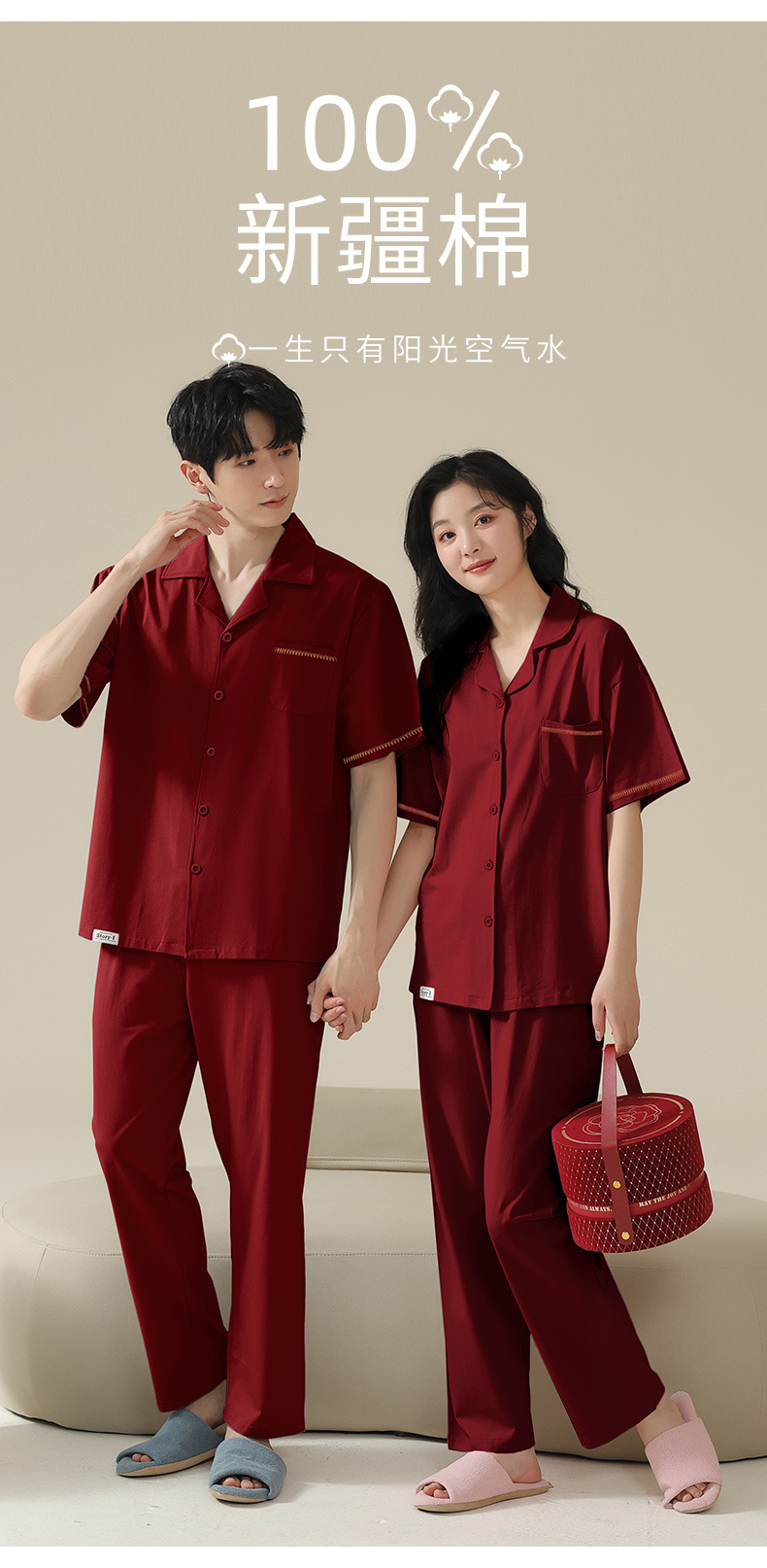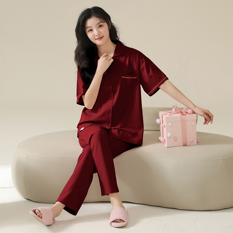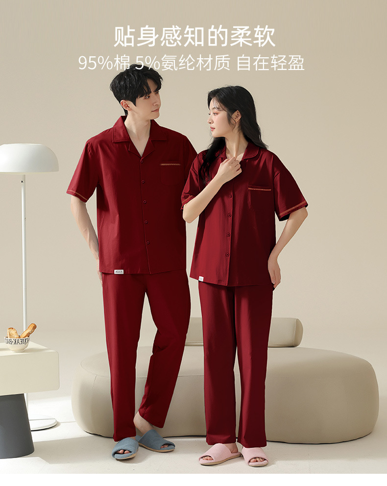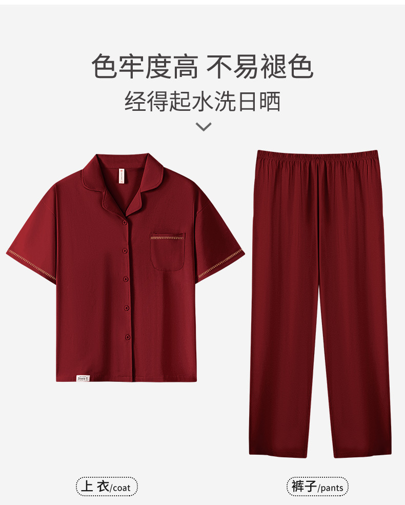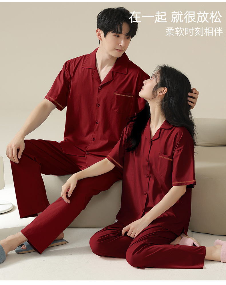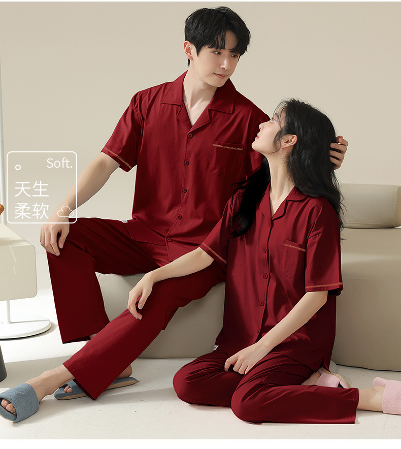 커플 잠옷 여름 반팔 바지 순수 코튼 레드 웨딩 신혼 홈웨어 세트 플러스 사이즈 남성과 여성스토어 가기