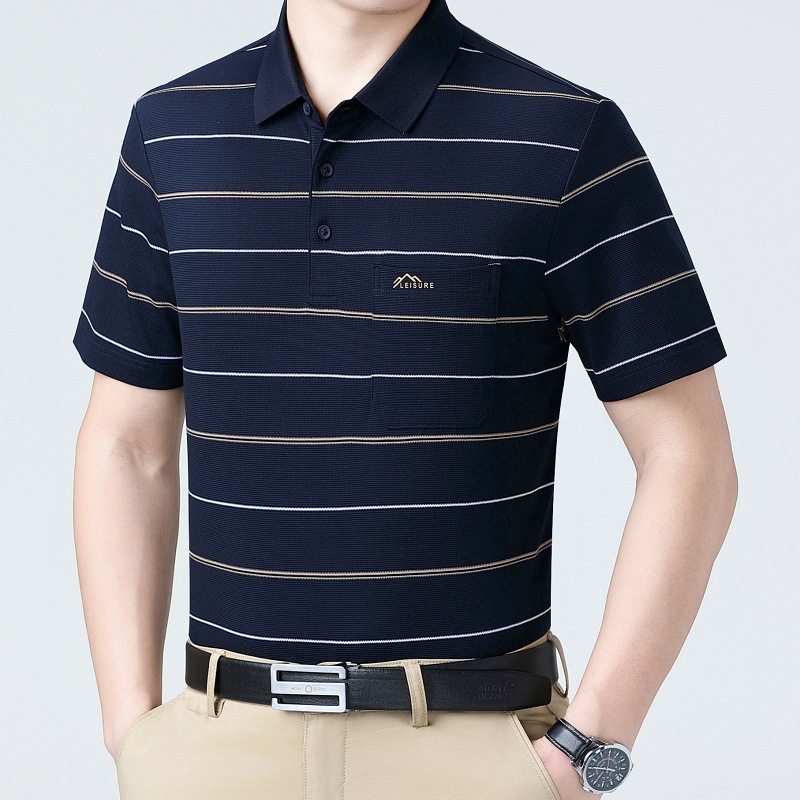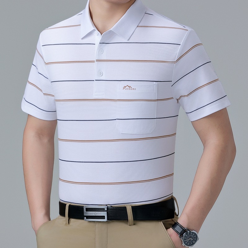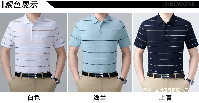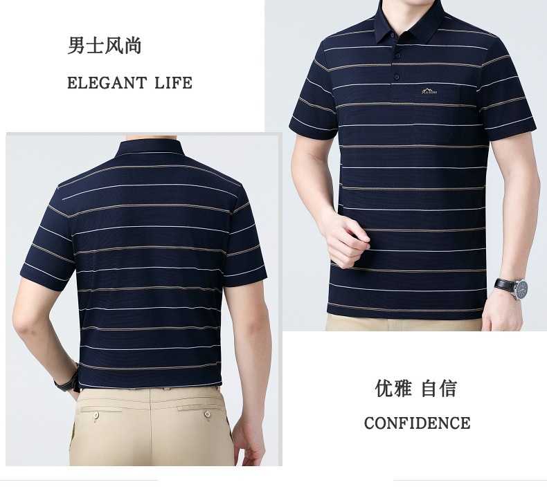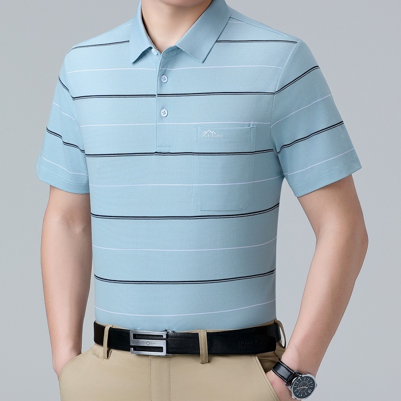 여름 남자 뽕나무 실크 반팔 티셔츠 새로운 중년 아빠 옷깃 줄무늬 폴로 셔츠 캐주얼 얇은 탑스토어 가기