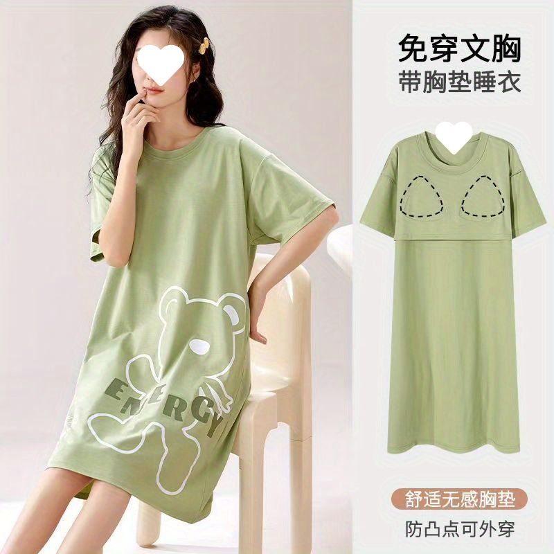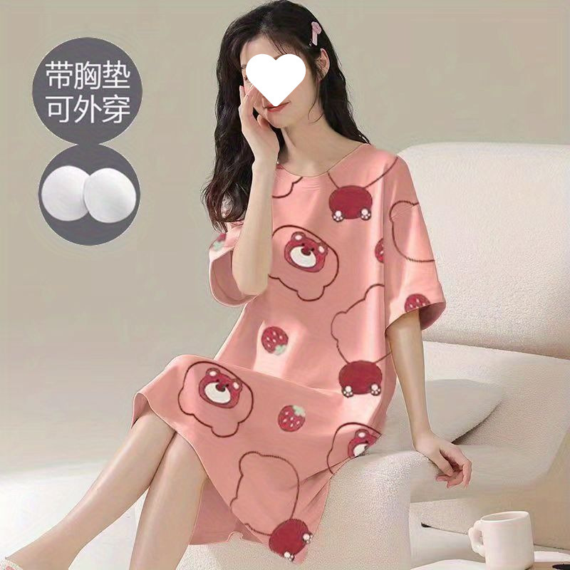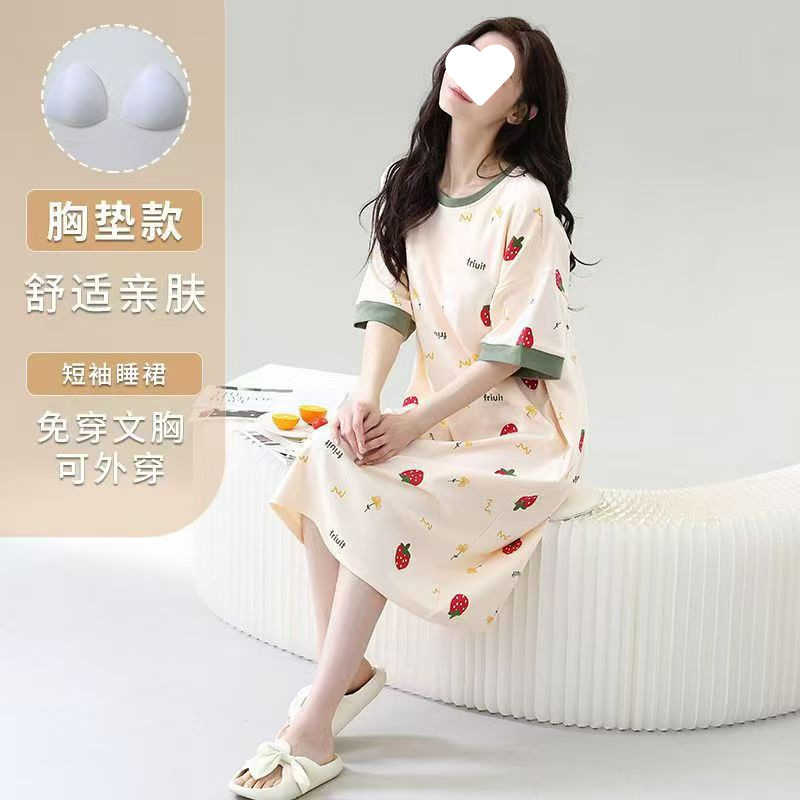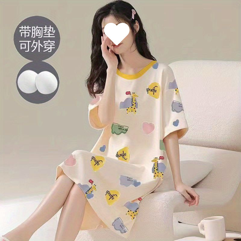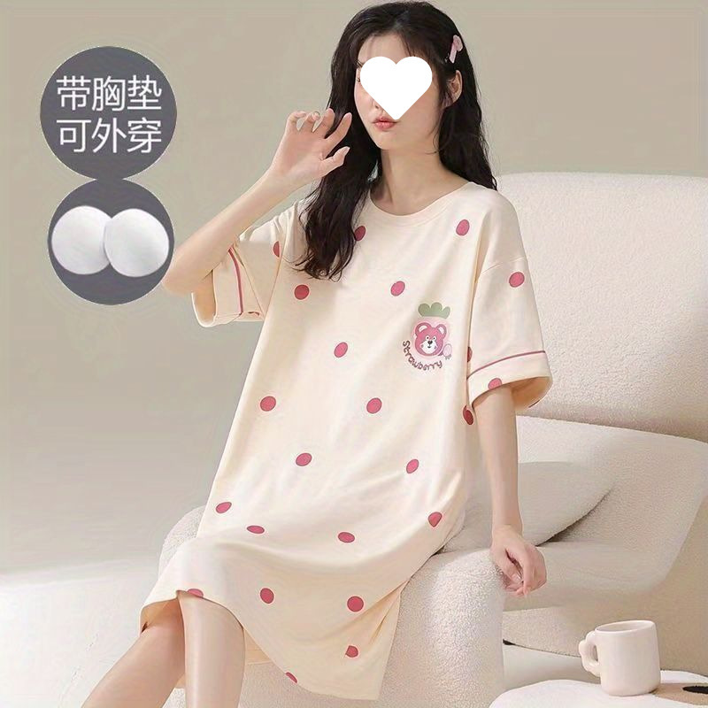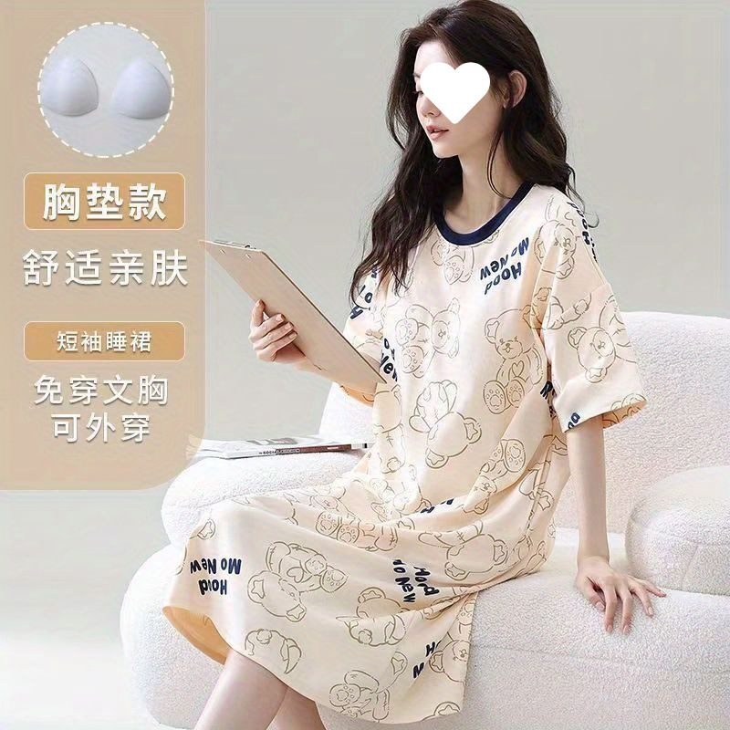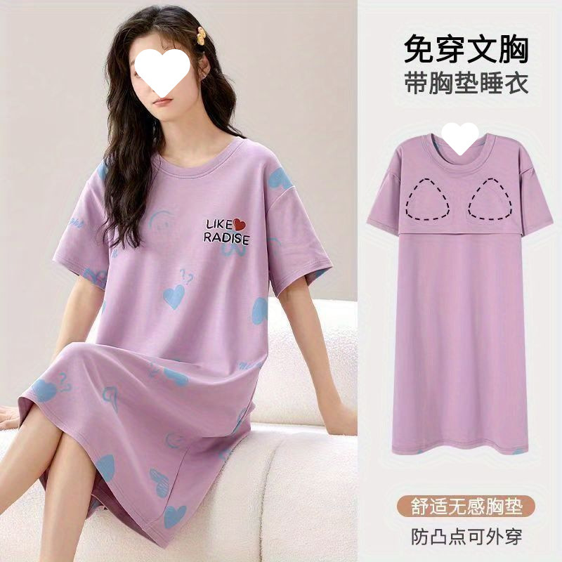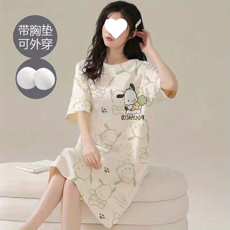 긴 무릎 플러스 사이즈 인터넷 축하 만화 달콤한 여름 잠옷 여성의 봄과 가을 귀여운 가슴 패드와 여성의 여름 원피스스토어 가기