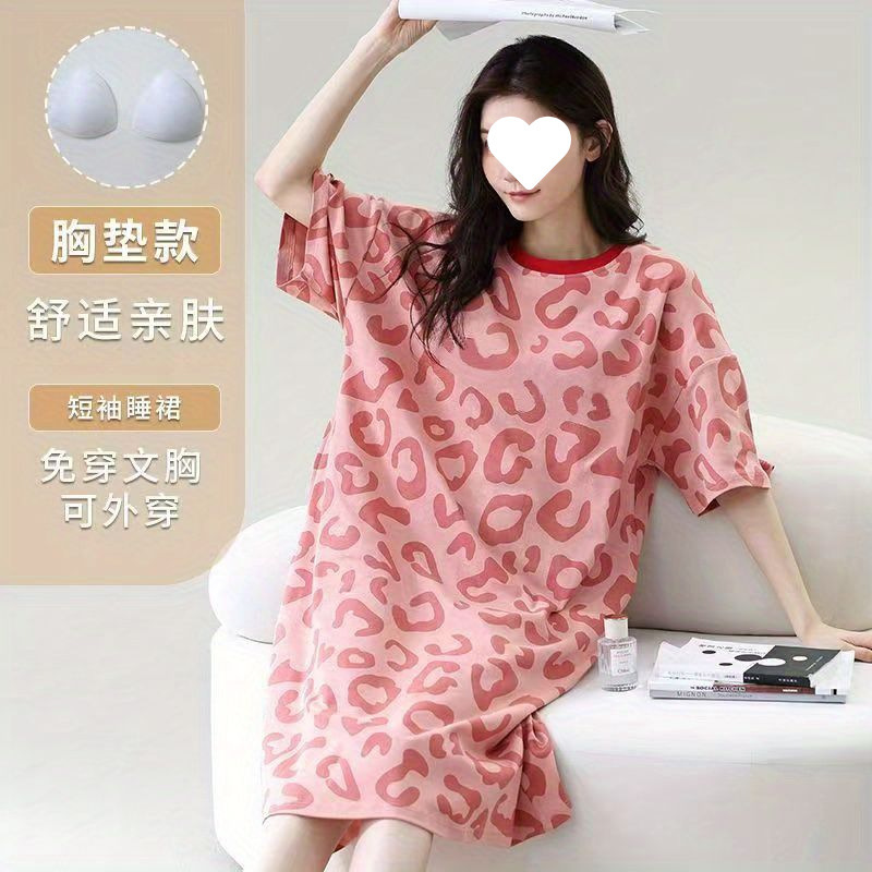 긴 무릎 플러스 사이즈 인터넷 축하 만화 달콤한 여름 잠옷 여성의 봄과 가을 귀여운 가슴 패드와 여성의 여름 원피스