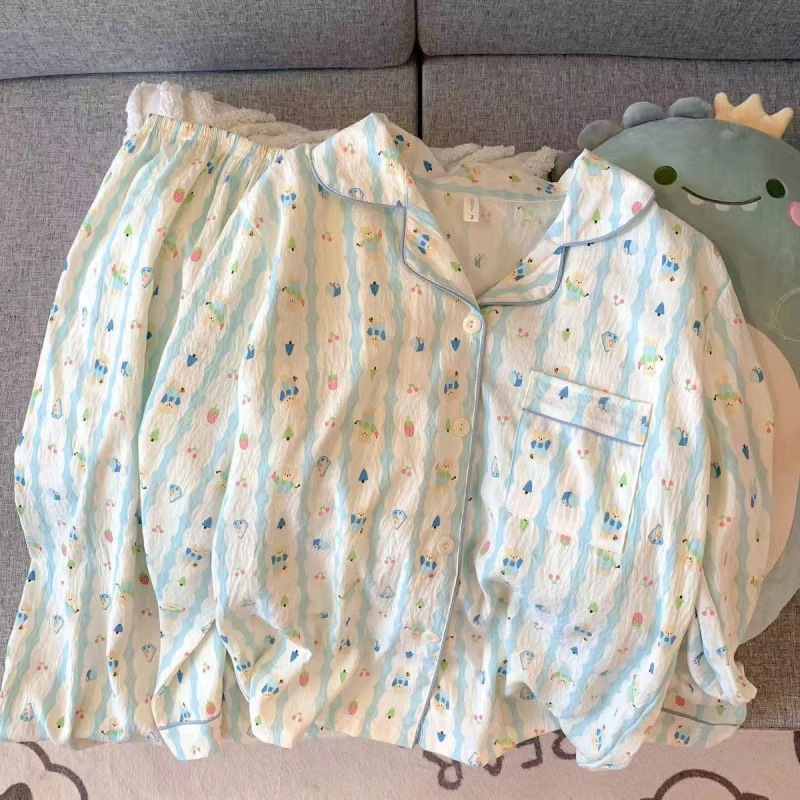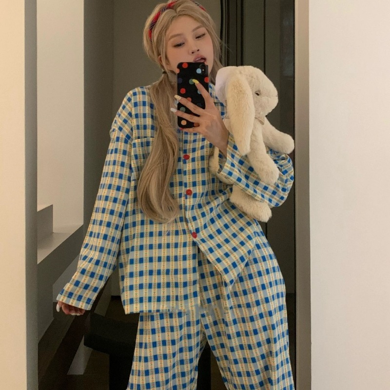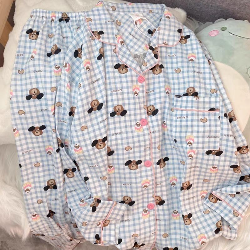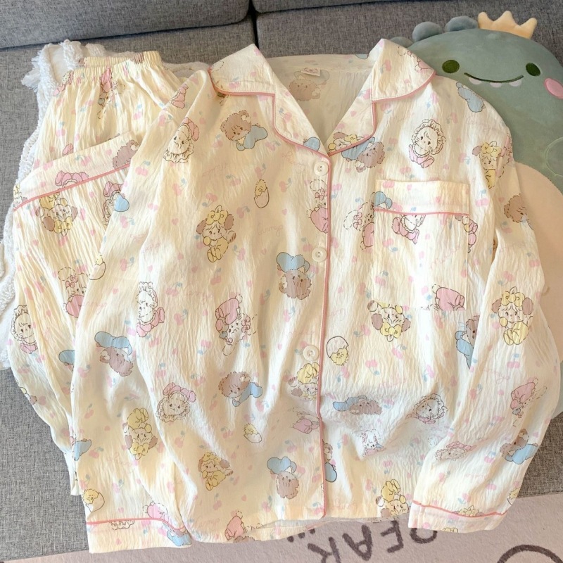 여성을위한 Yunduo 면화 잠옷 봄과 가을 새로운 달콤하고 귀여운 만화 긴팔 바지 느슨한 캐주얼 홈웨어 세트