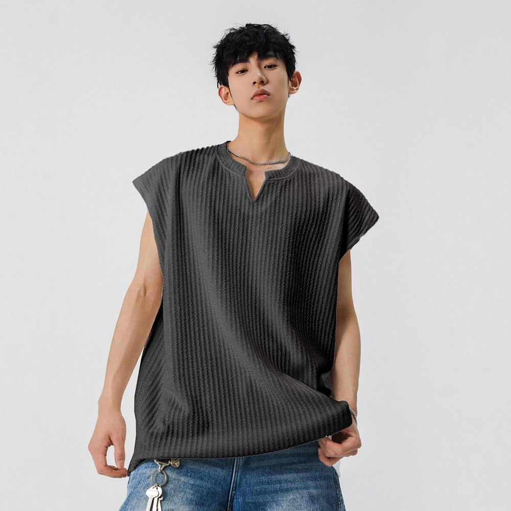 텍스처 V 넥 조끼 남자 여름 2025 새로운 빠른 건조 아우터웨어 스포츠 웨이스트 코트 십대 와이드 어깨 민소매 티셔츠