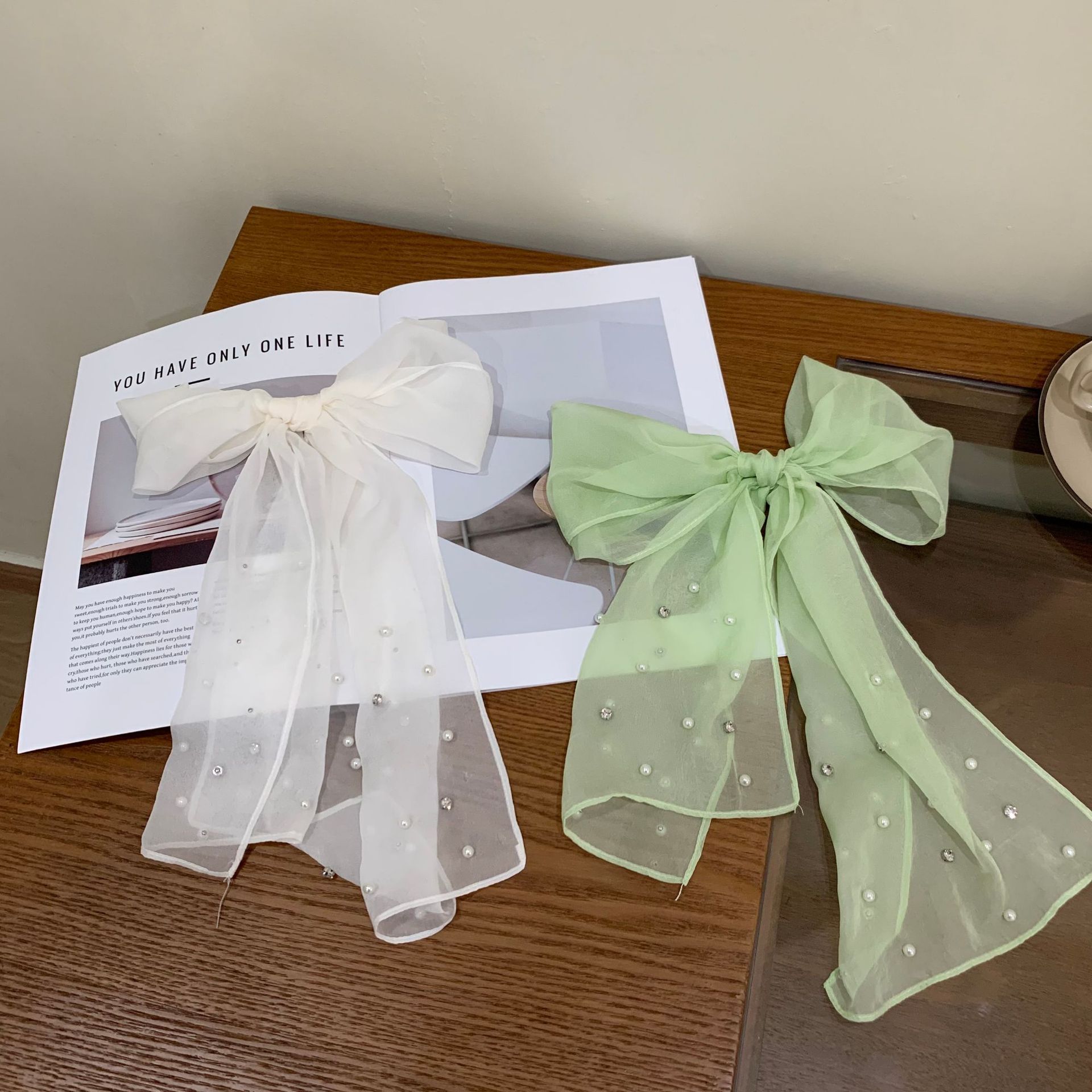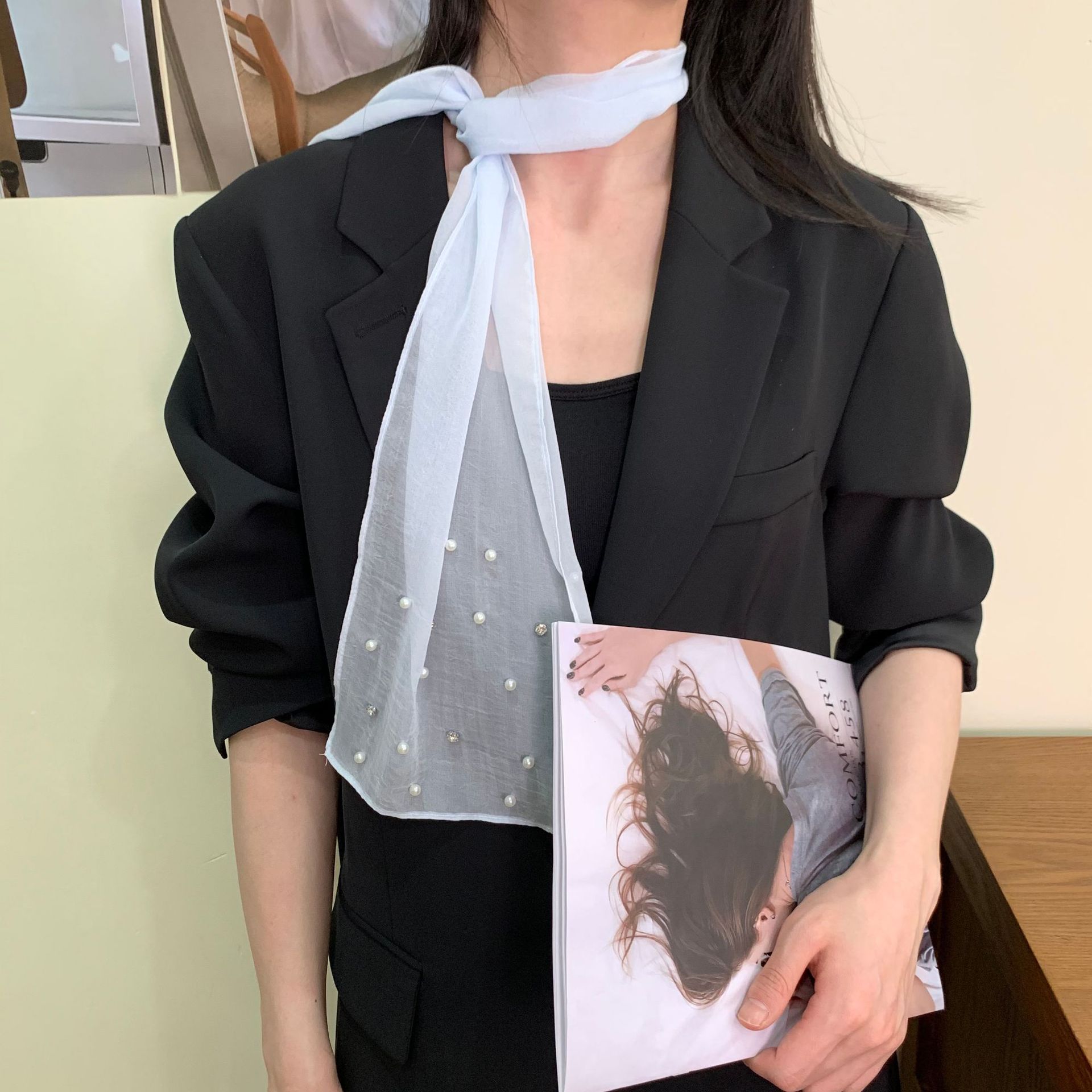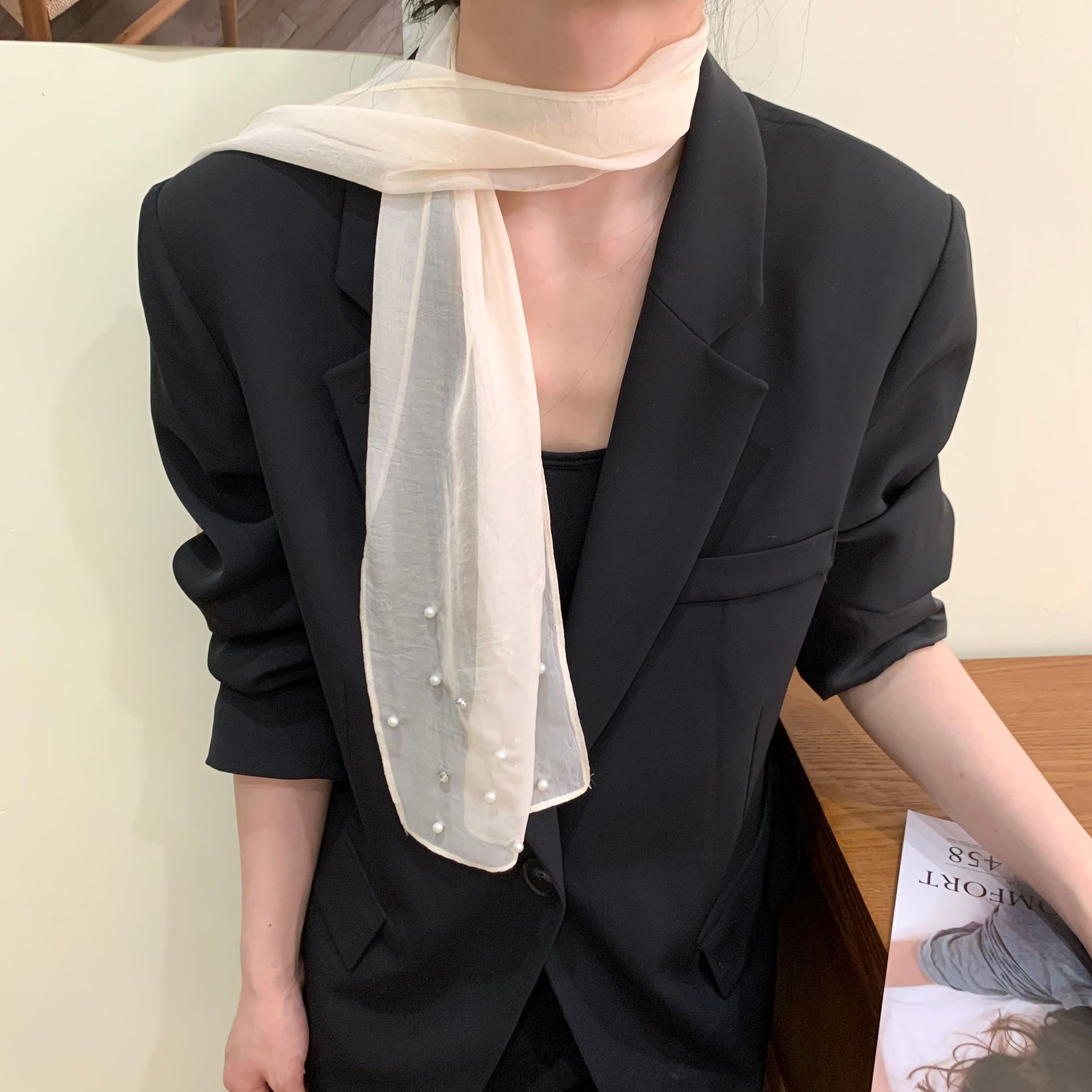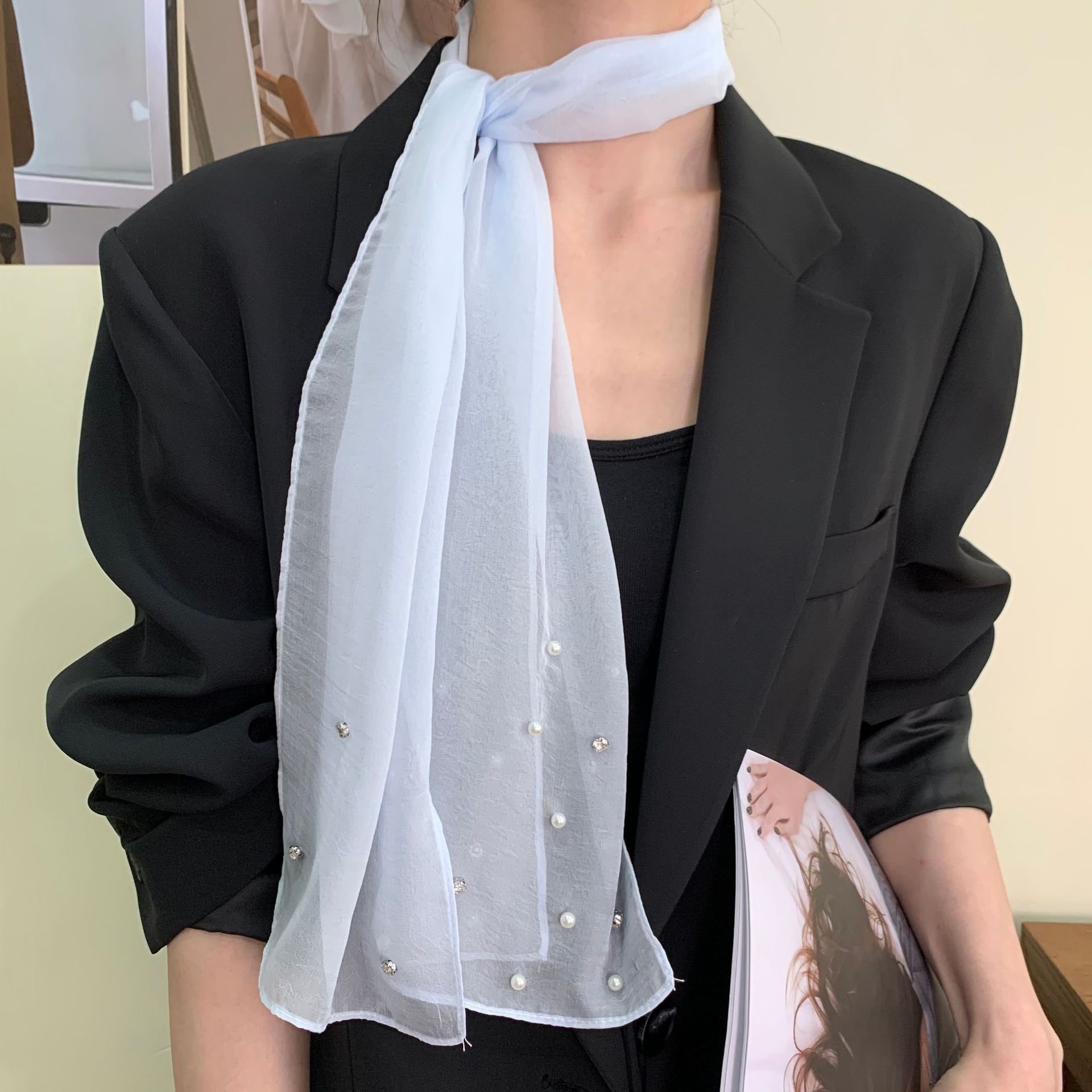 한국 틈새 ~ 우아한 달콤한 소녀 구슬 긴 실크 스카프 높은 감각 넥타이 헤어 인터넷 빨간 사진 리본 조수스토어 가기