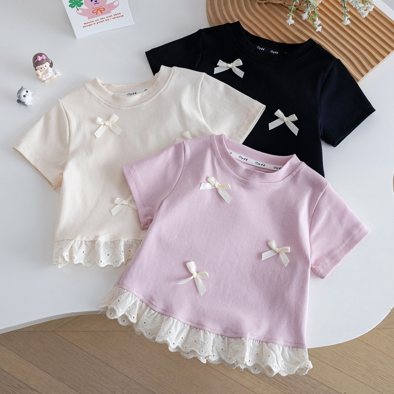소녀 여름 짧은 소매 1-6 세 아기 어린이 착용 여름 착용 핑크 흰색 반 소매 레이스 통기성 티셔츠 탑 여름스토어 가기