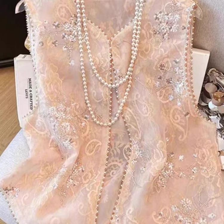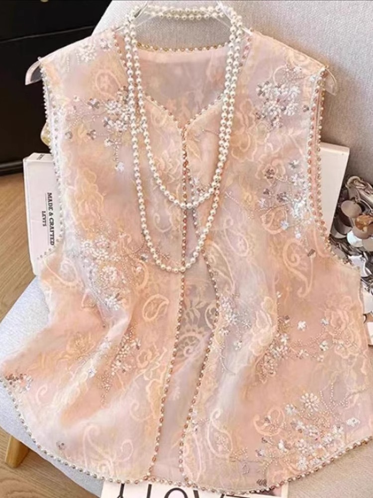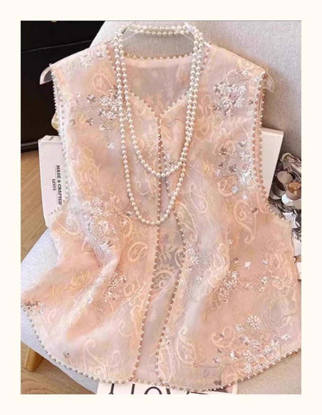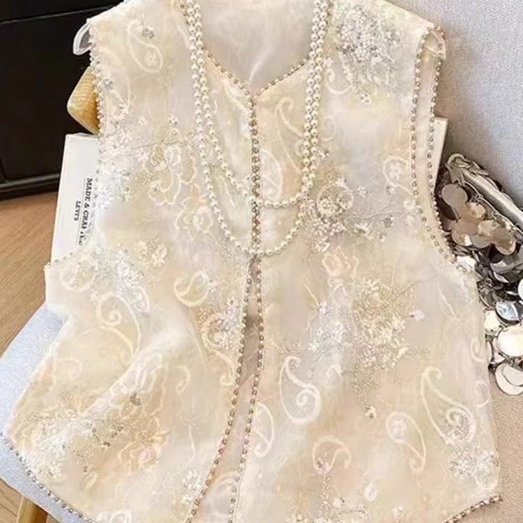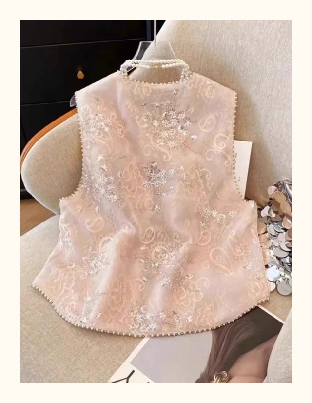 새로운 중국 스타일 국가 스타일 자수 구슬 조끼 여자 2025 봄 새로운 우아한 느슨한 올 매치 쁘띠 탑