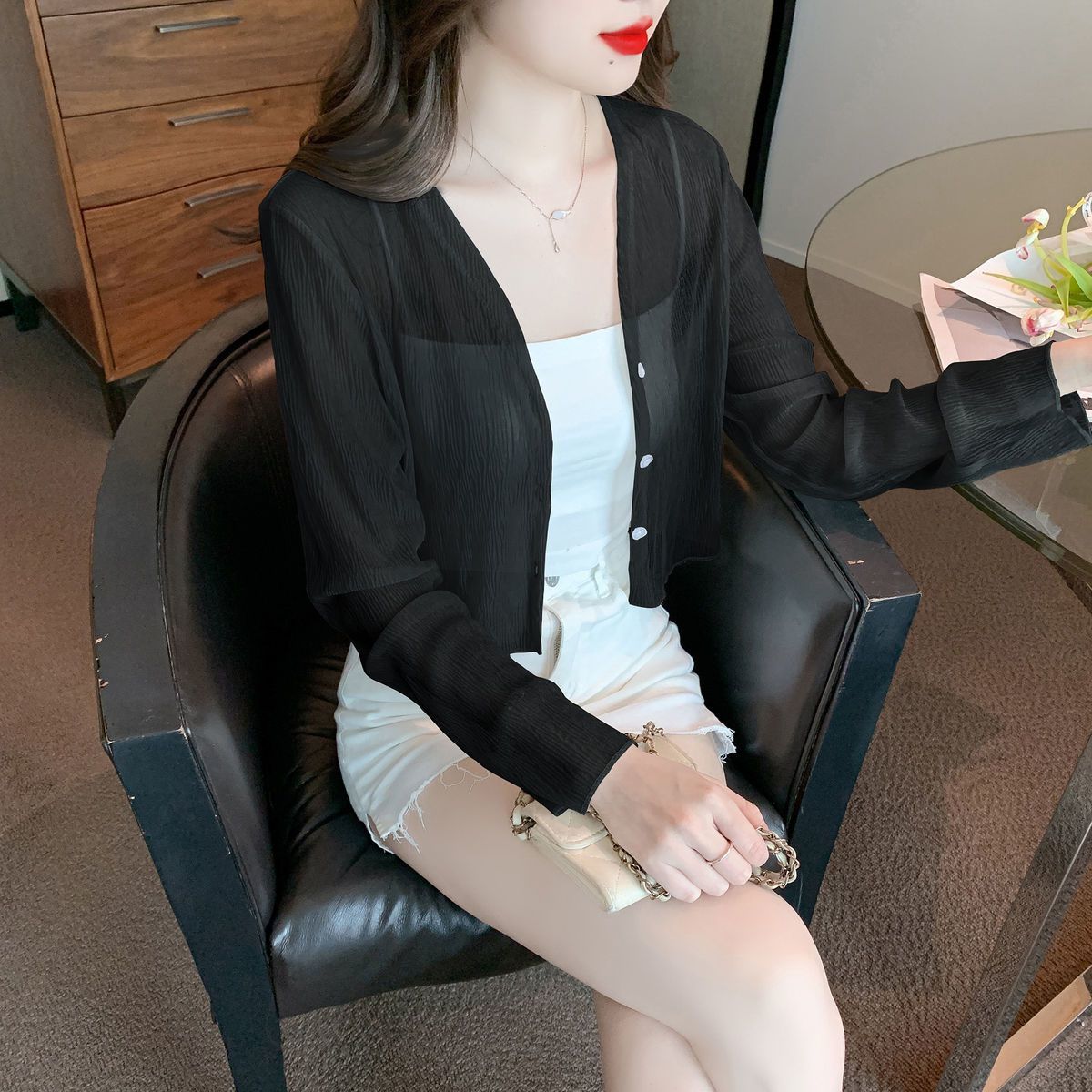 여름 여성용 화이트 아이스 실크 자외선 차단 의류, 얇은 쉬폰 가디건, 서스펜더 스커트, 블라우스, 숄, 숏 코트