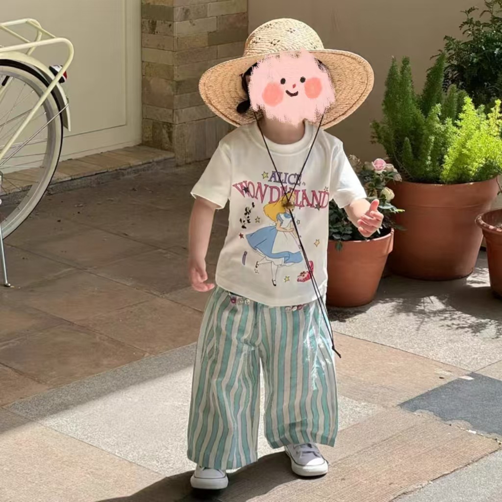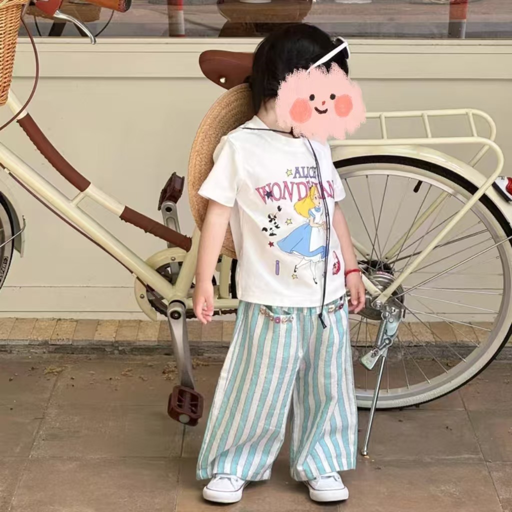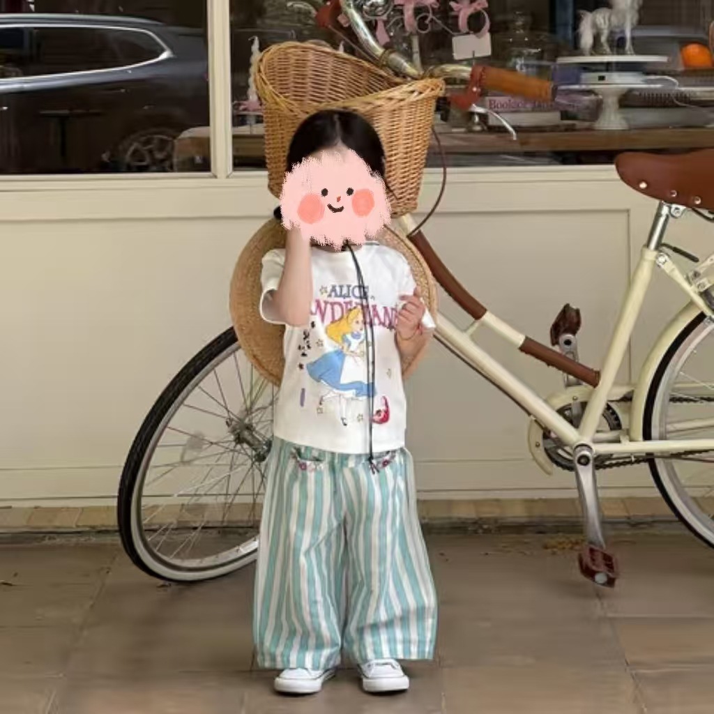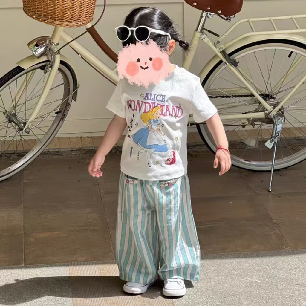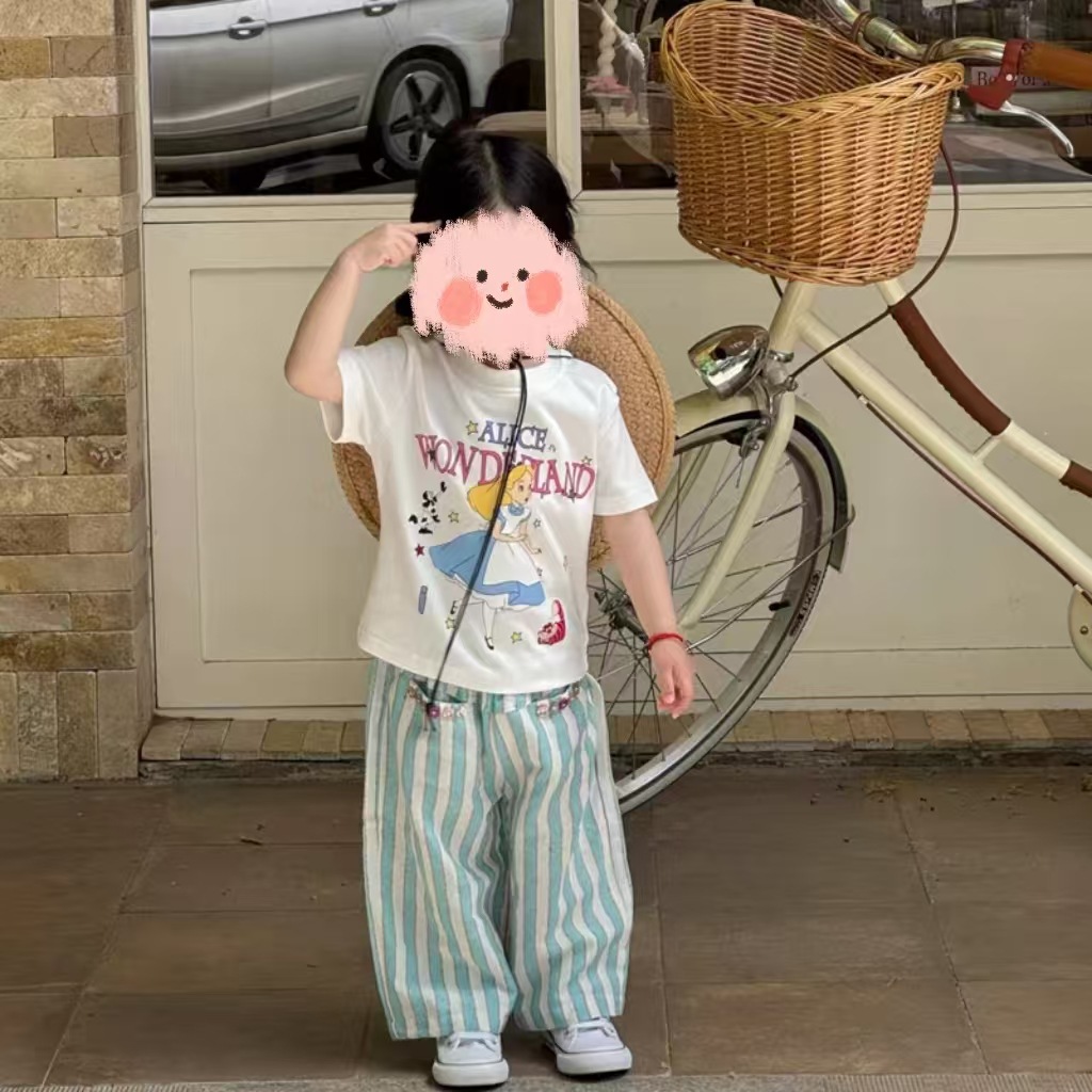 [클리어아웃 특가! 반품 불가] 한국 스타일 아동복 소녀 만화 프린트 흰색 반팔 티셔츠 탑 스트라이프