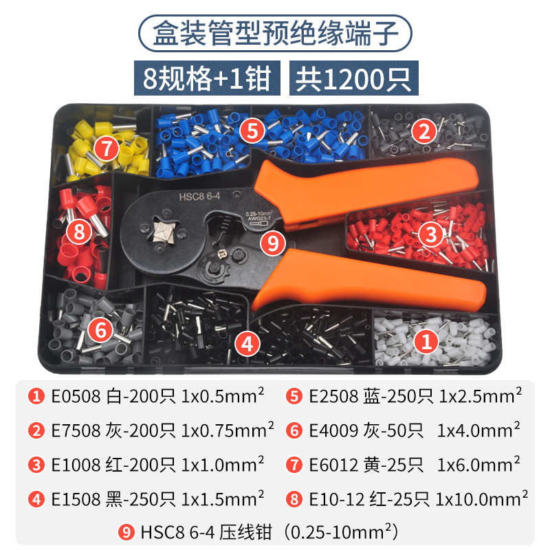 사전 절연 냉간 압착 단자 세트 크로스보더 압착 펜치 보관 상자 와이어 구리 노즈 E 튜브형 단자 핀