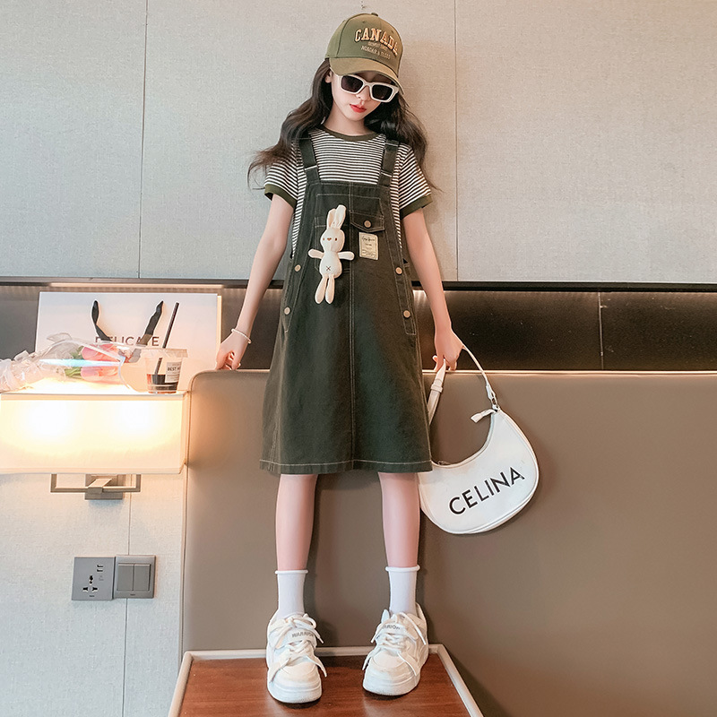 대형 어린이를위한 서양식 101.2kg 피스 아동복 서스펜더 스커트 줄무늬 반팔 여름 소녀 여름 정장 도매