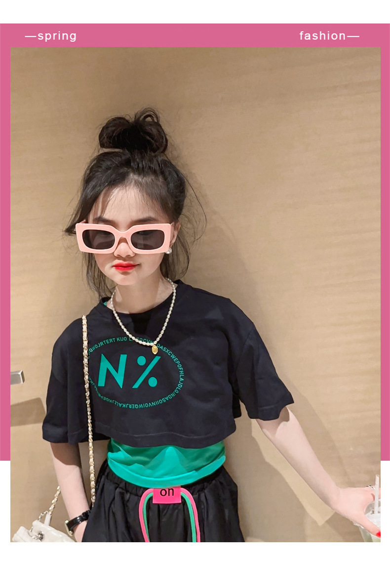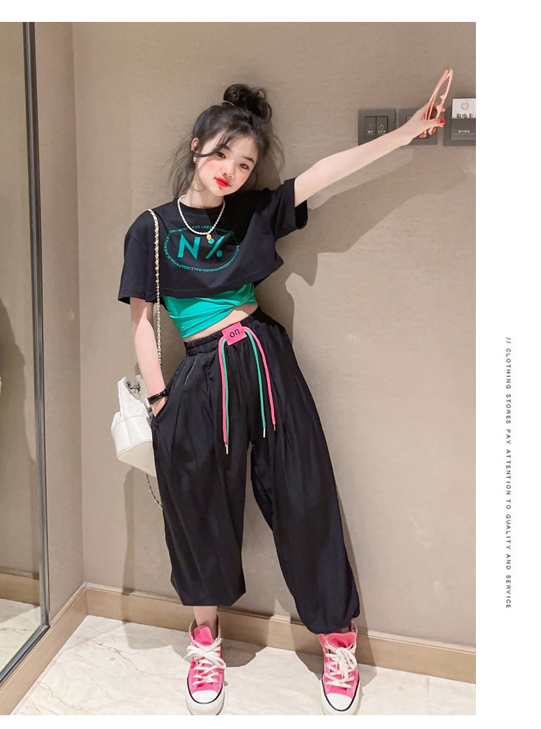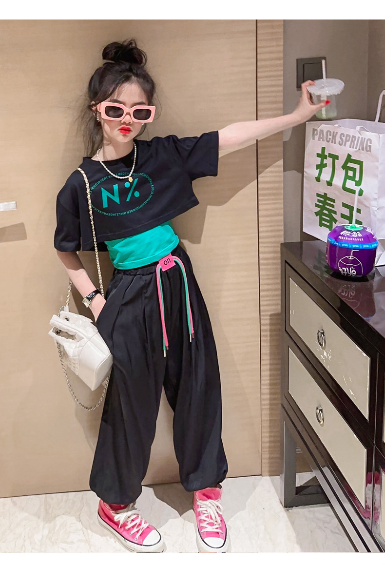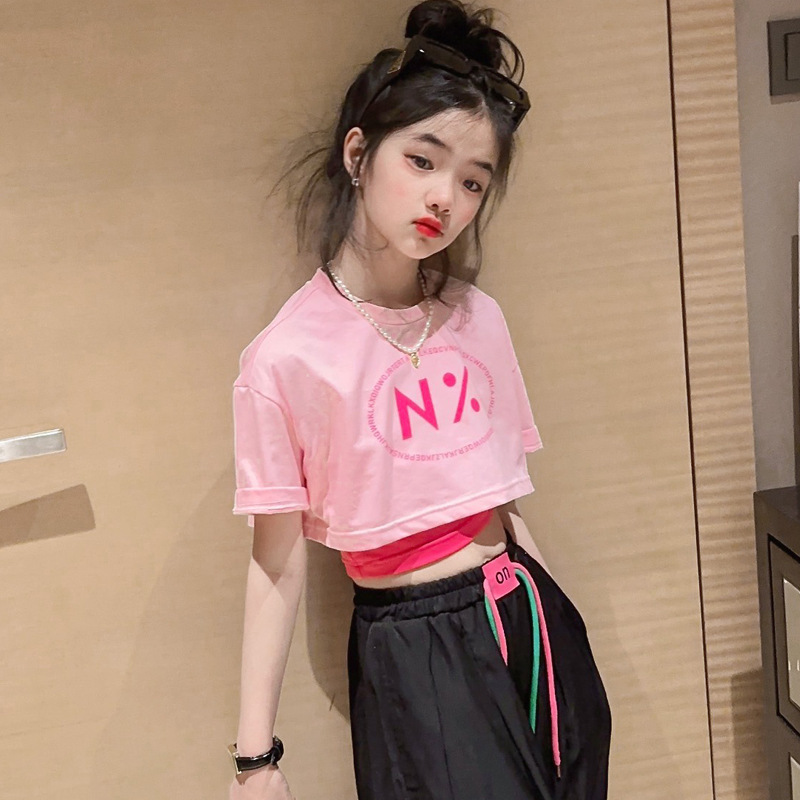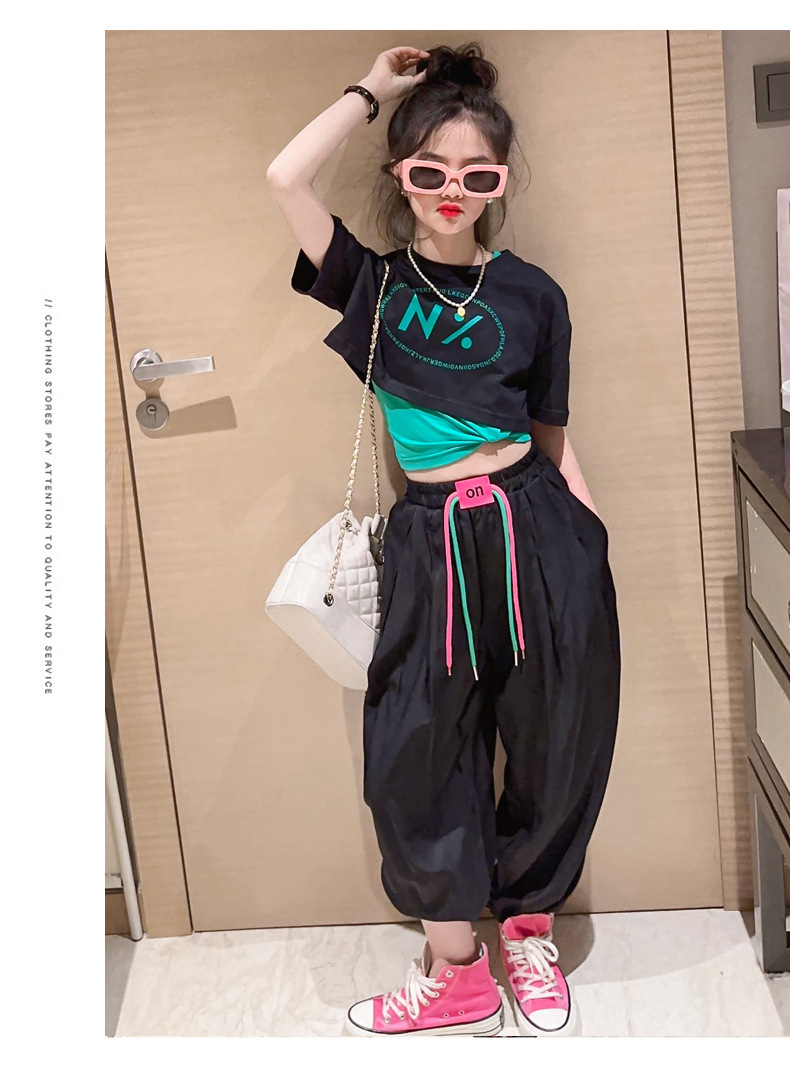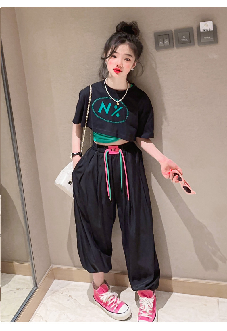 여자 2024 여자 스포츠 세트 트렌디 힙합 트렌디 빅 키즈 세트 아동복 새로운 여름 재고 코튼스토어 가기