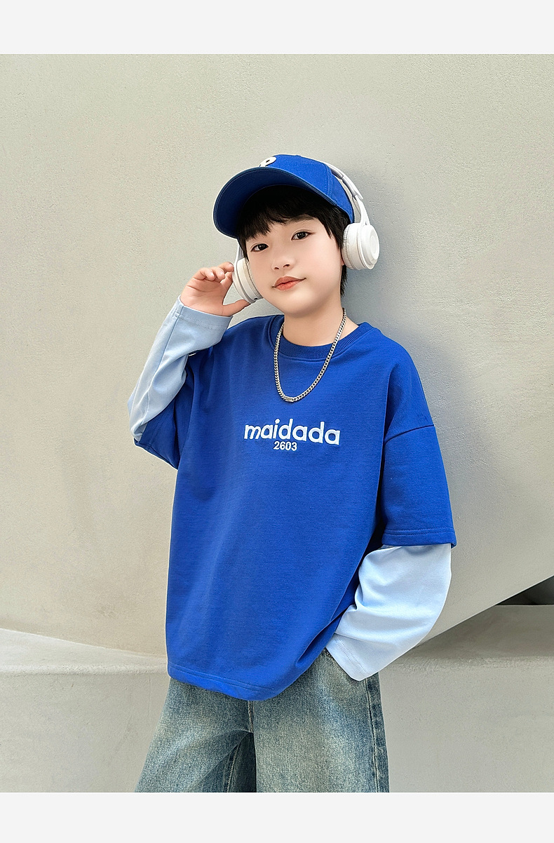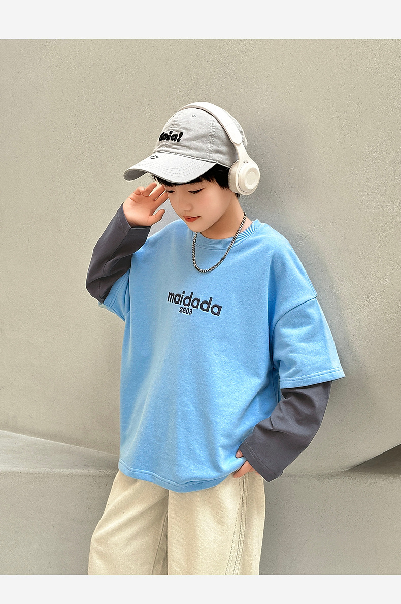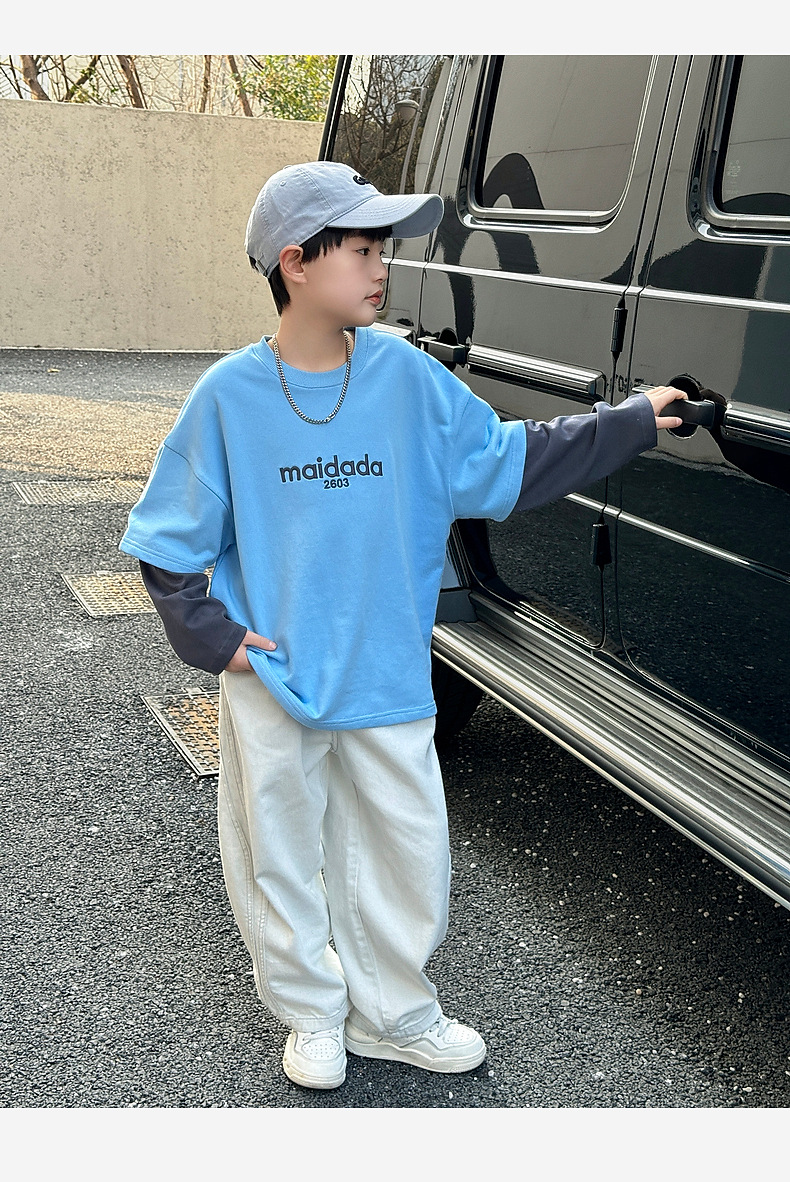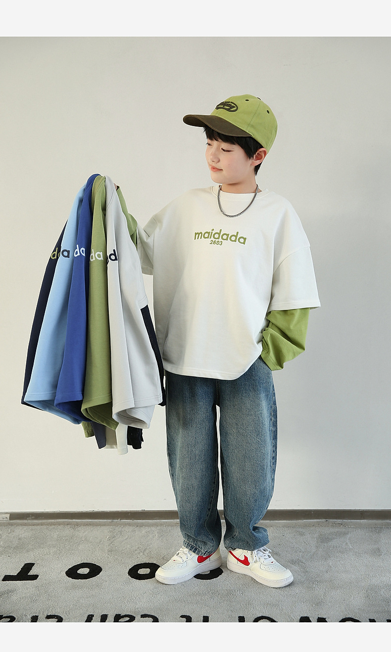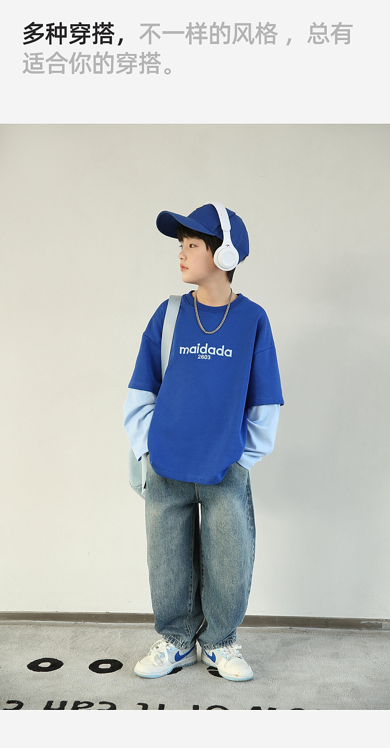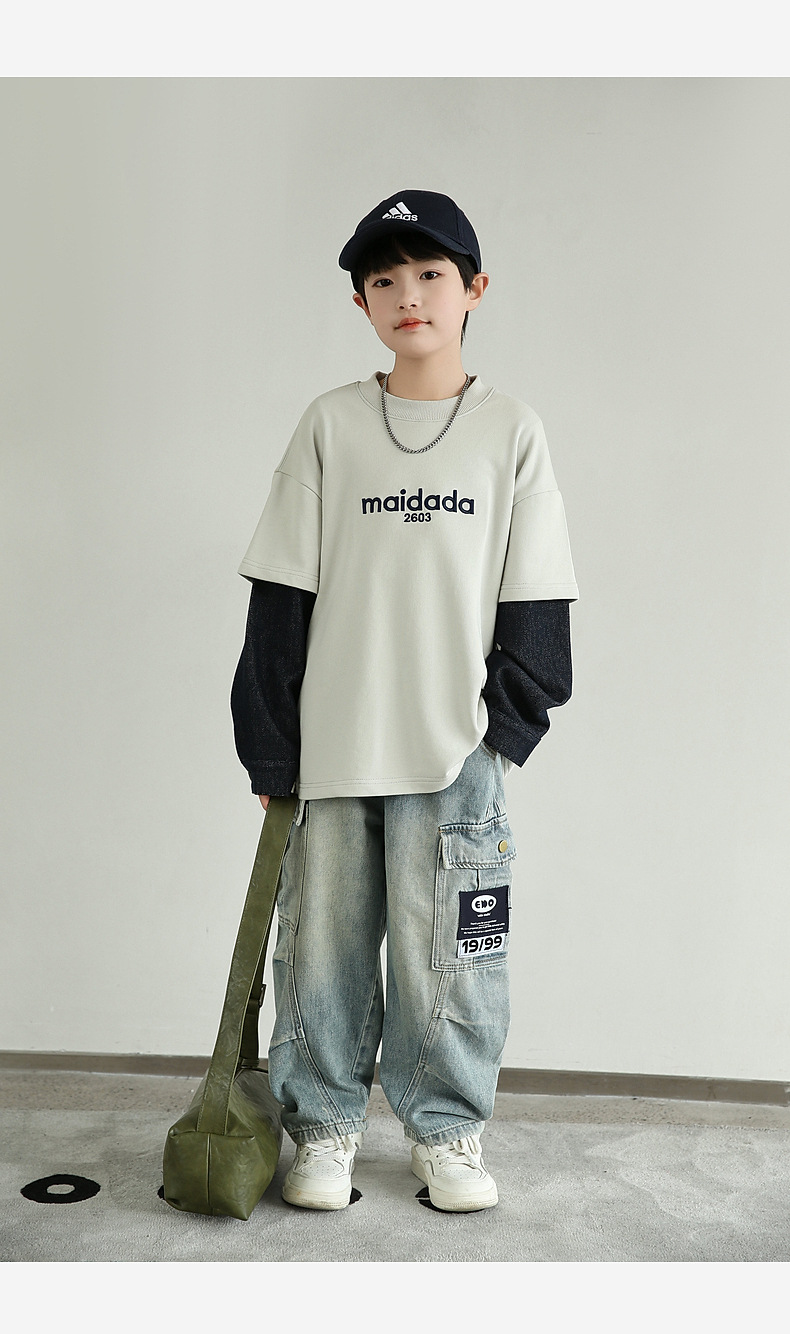 Panda Yuanyuan 2025 봄 원피스 새로운 소년의 가짜 투피스 티셔츠 큰 소년 데님 슬리브 어린이 스웨터 도매스토어 가기