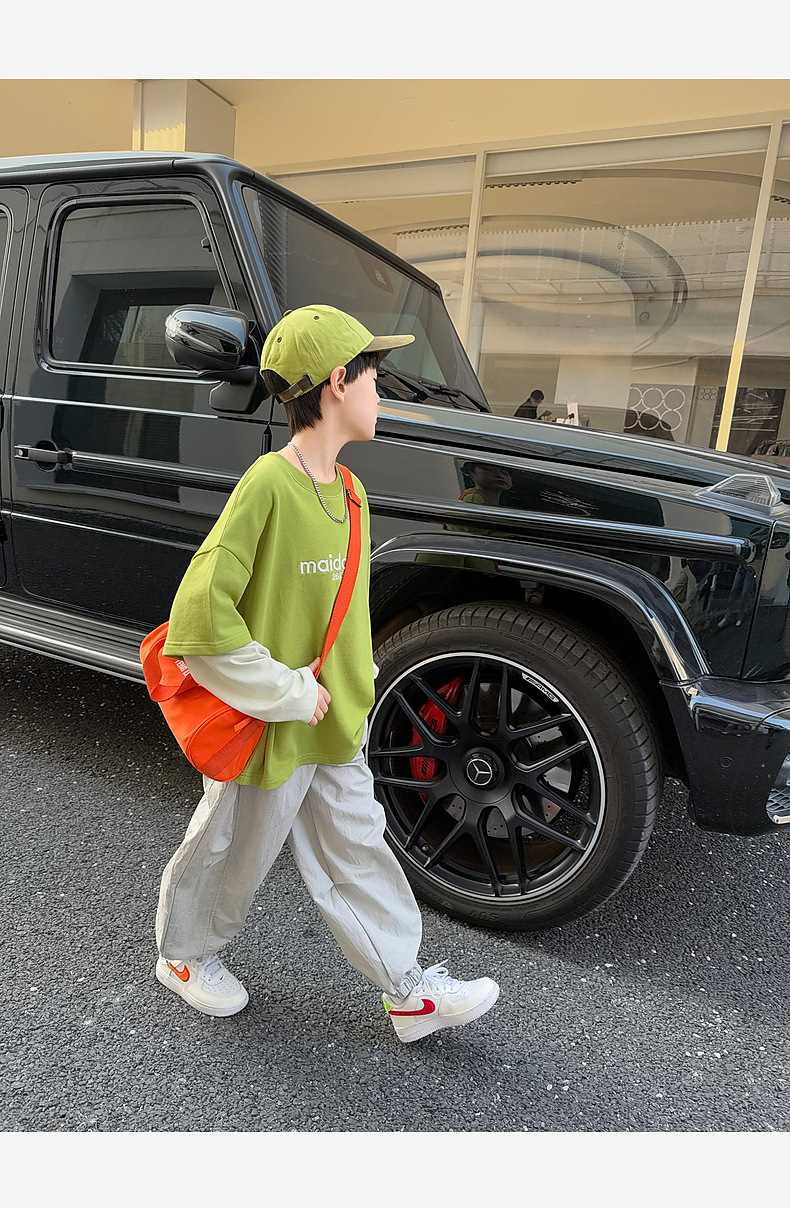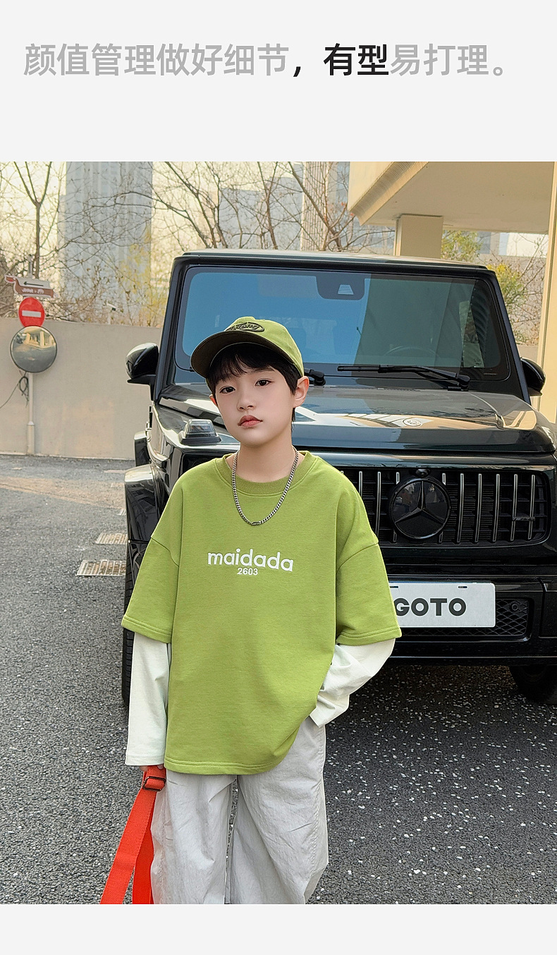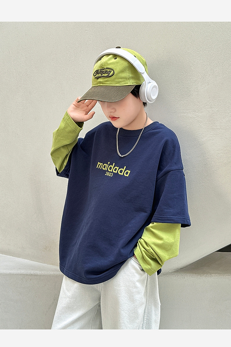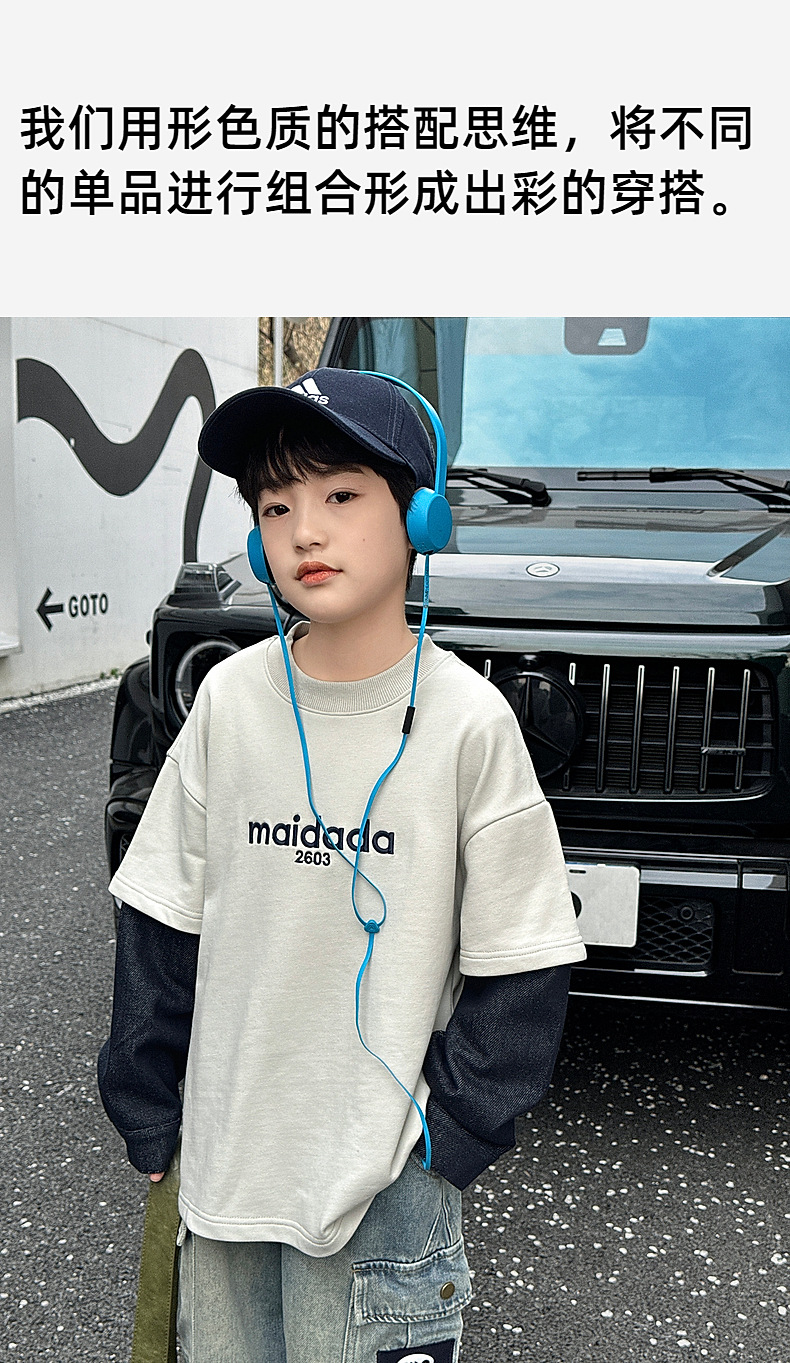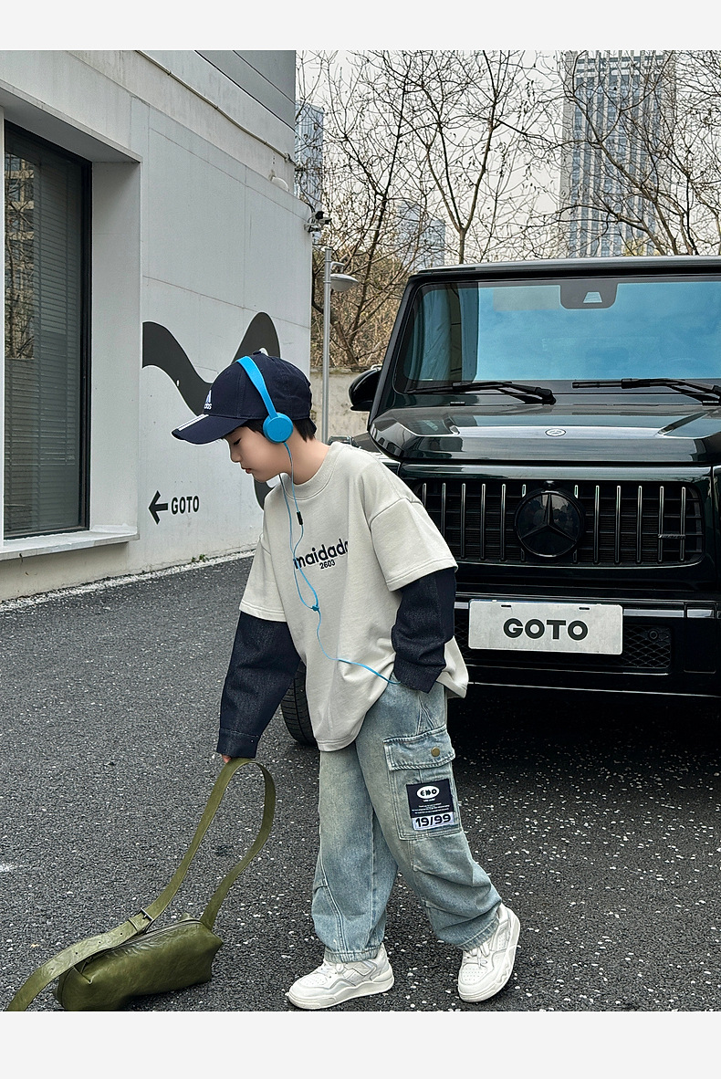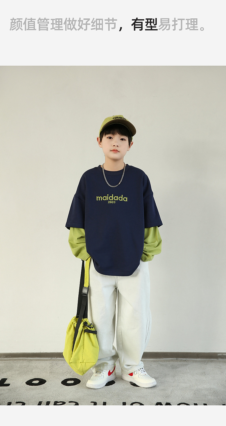 Panda Yuanyuan 2025 봄 원피스 새로운 소년의 가짜 투피스 티셔츠 큰 소년 데님 슬리브 어린이 스웨터 도매스토어 가기