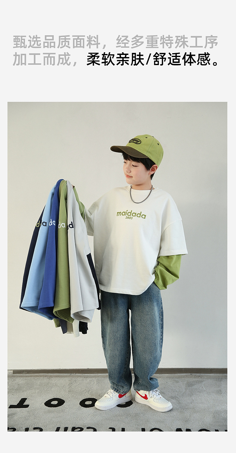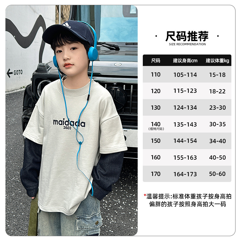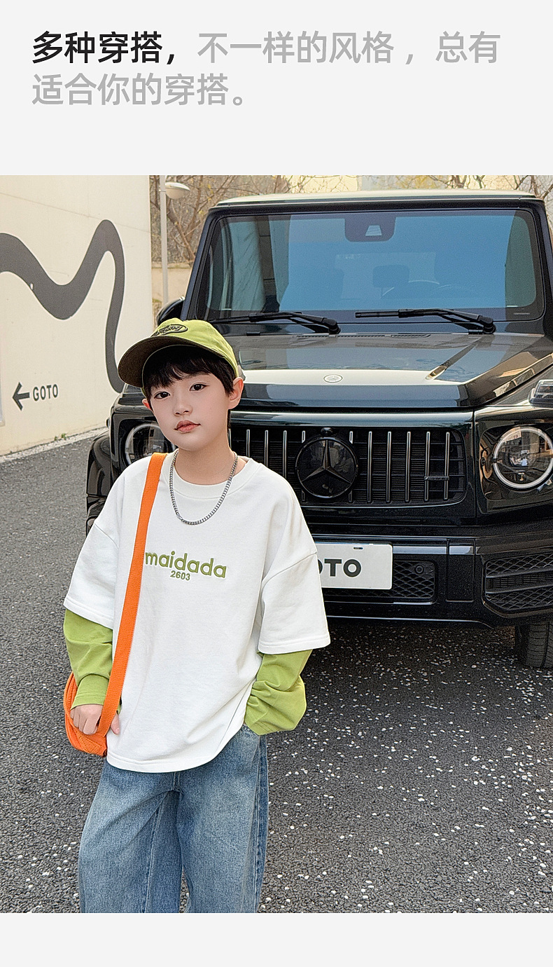 Panda Yuanyuan 2025 봄 원피스 새로운 소년의 가짜 투피스 티셔츠 큰 소년 데님 슬리브 어린이 스웨터 도매