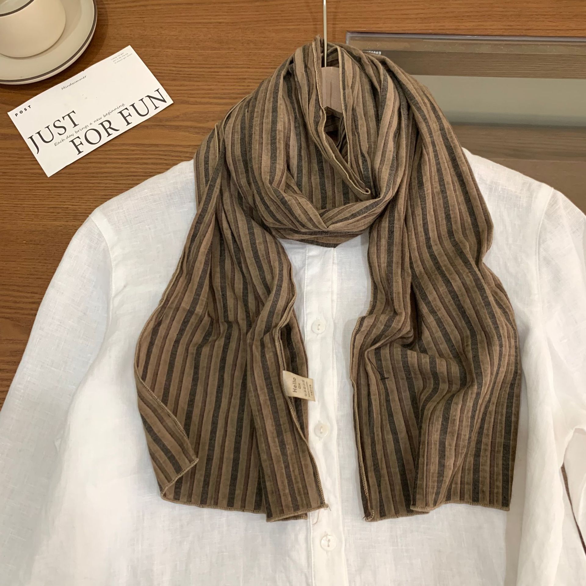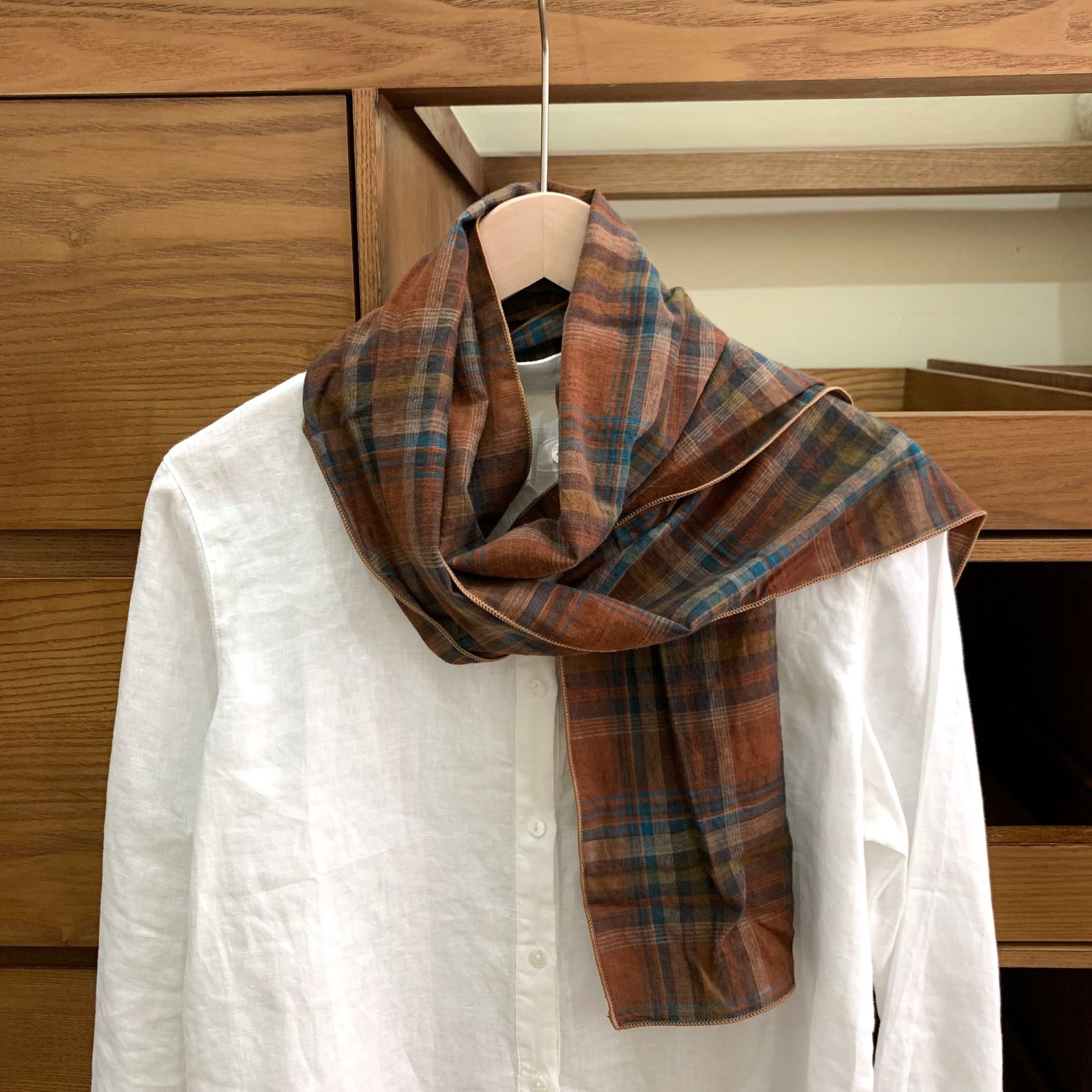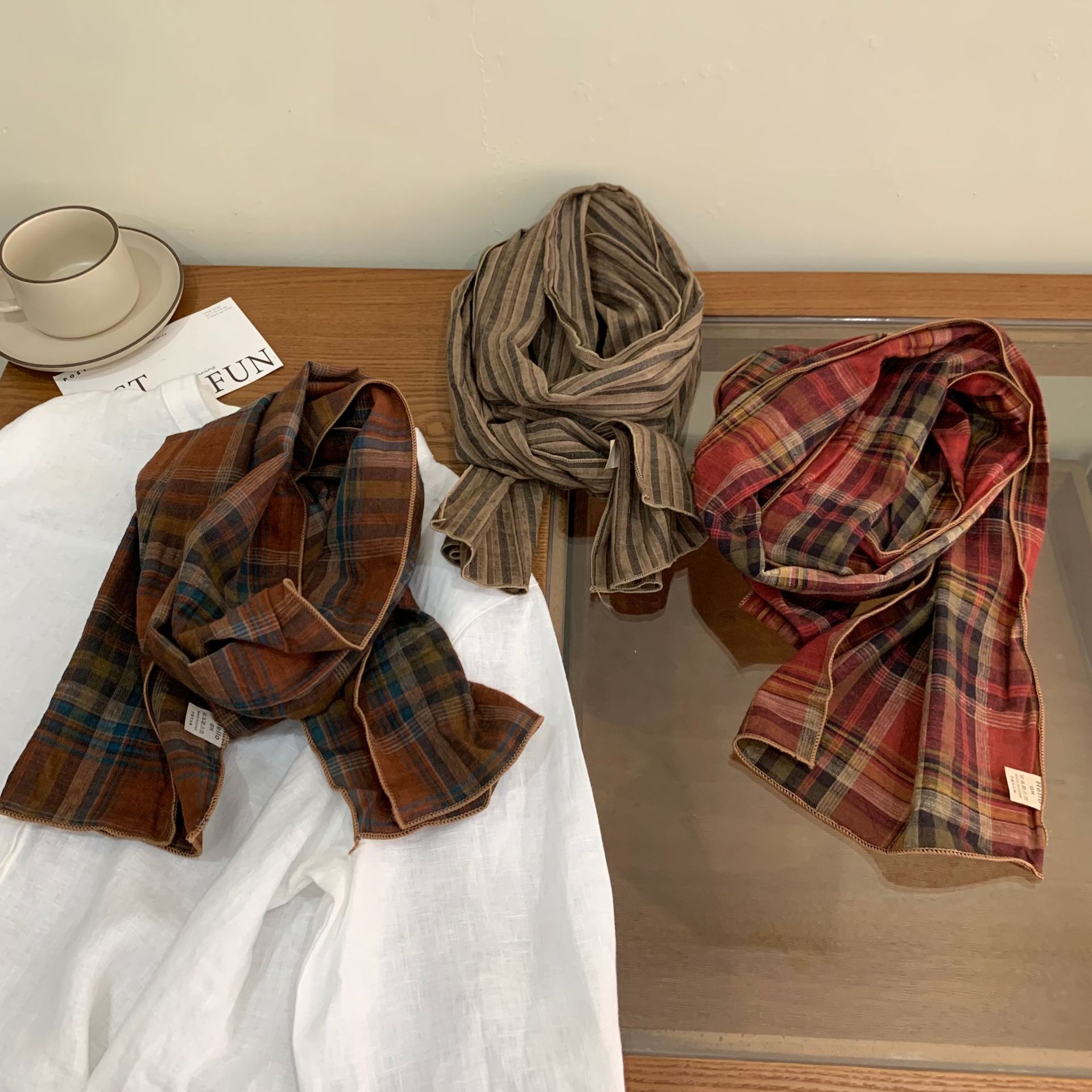 빈티지 레드 커피 체크 무늬 코튼 좁은 스카프 여성의 봄과 여름 얇은 예술적 올매치 긴 목 보호 장식 실크 스카프 남성용스토어 가기