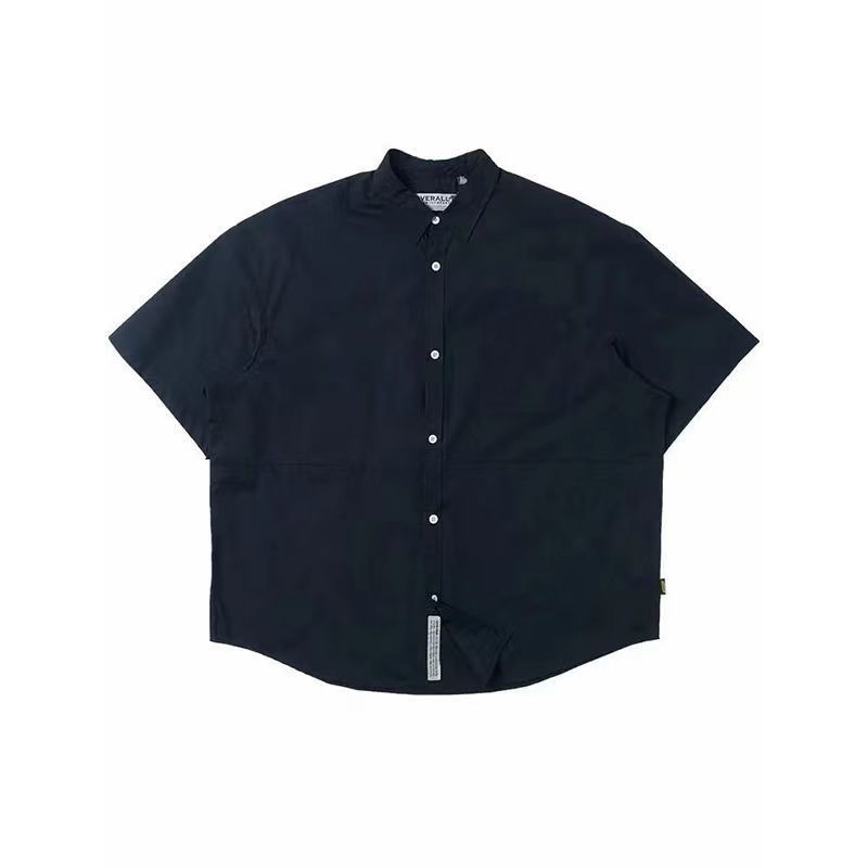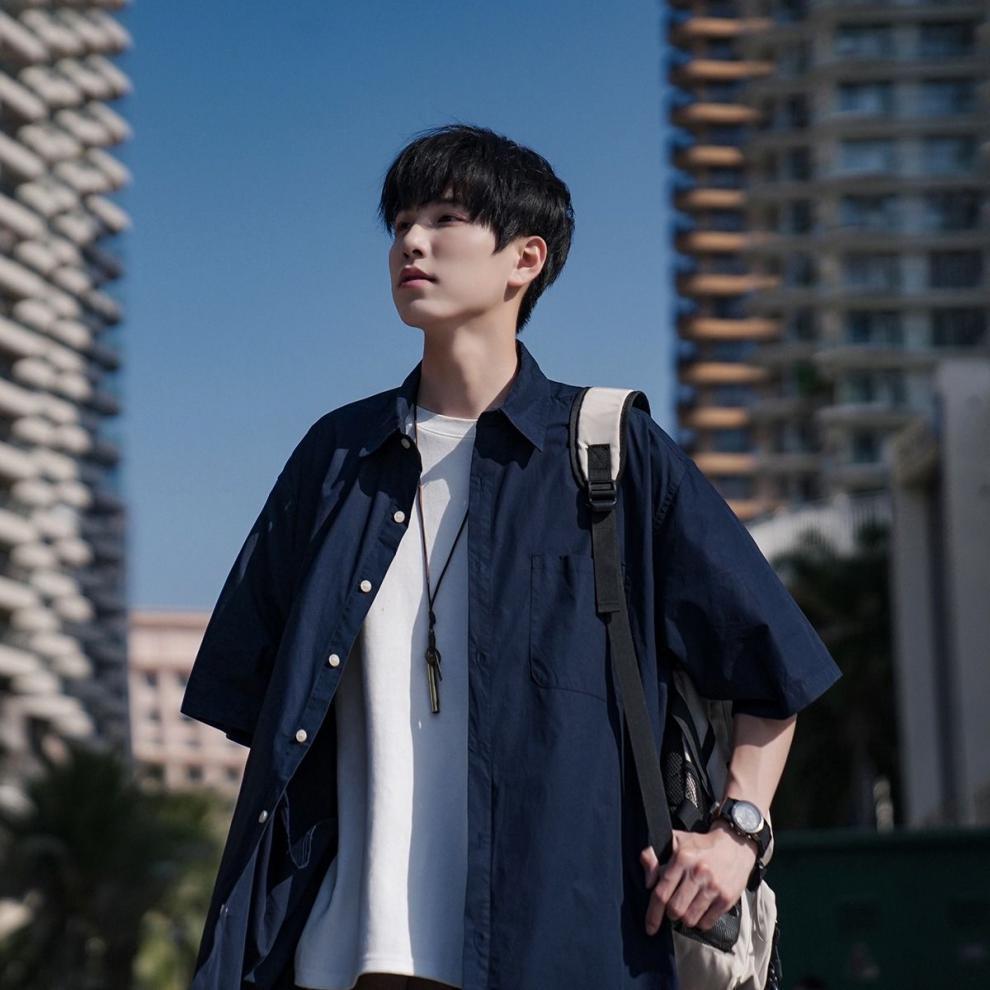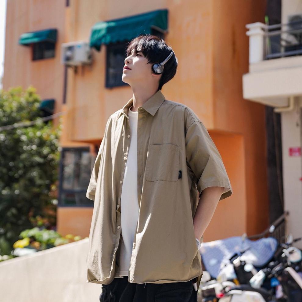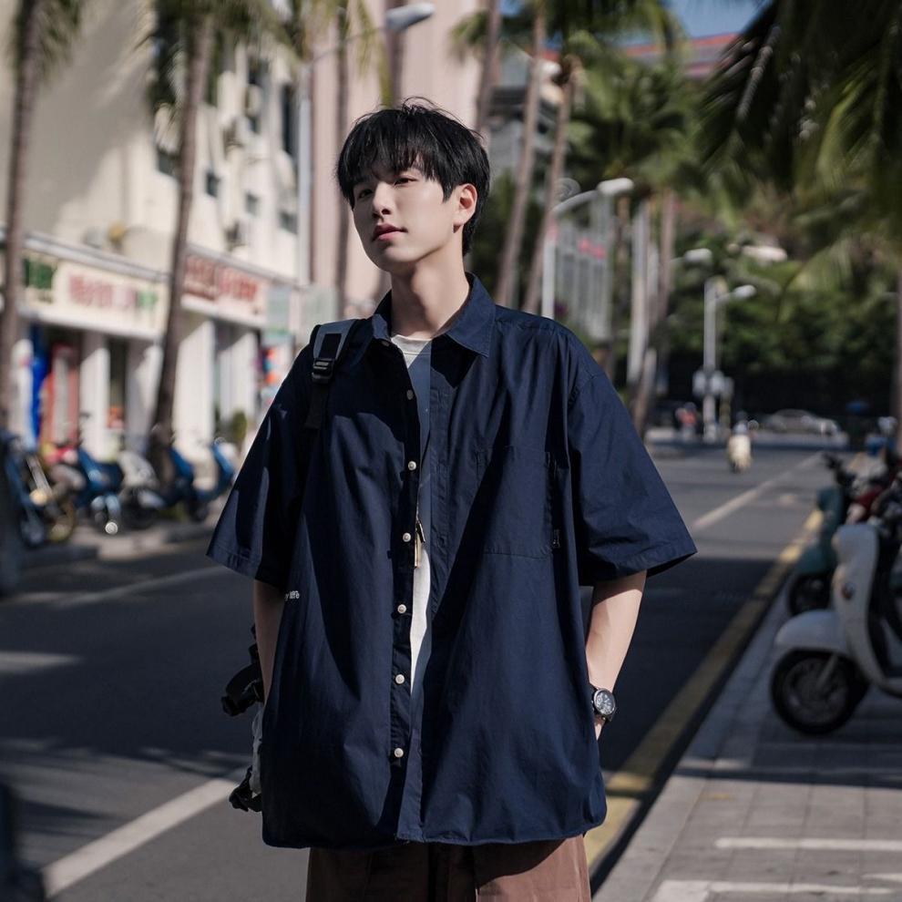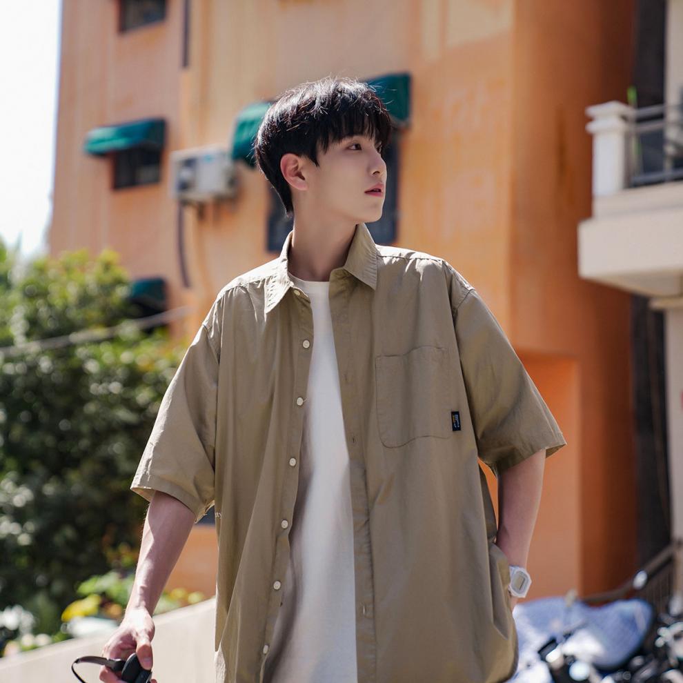 日系简约五分袖衬衫男夏季冰丝薄款休闲潮流宽松ins潮牌翻领衬衣
