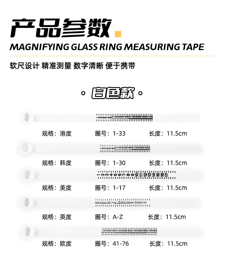 돋보기가 있는 공장 핫셀링 반지 사이즈 측정용 소프트 눈금자, 미국 사이즈 반지 눈금자 측정 스크리너스토어 가기