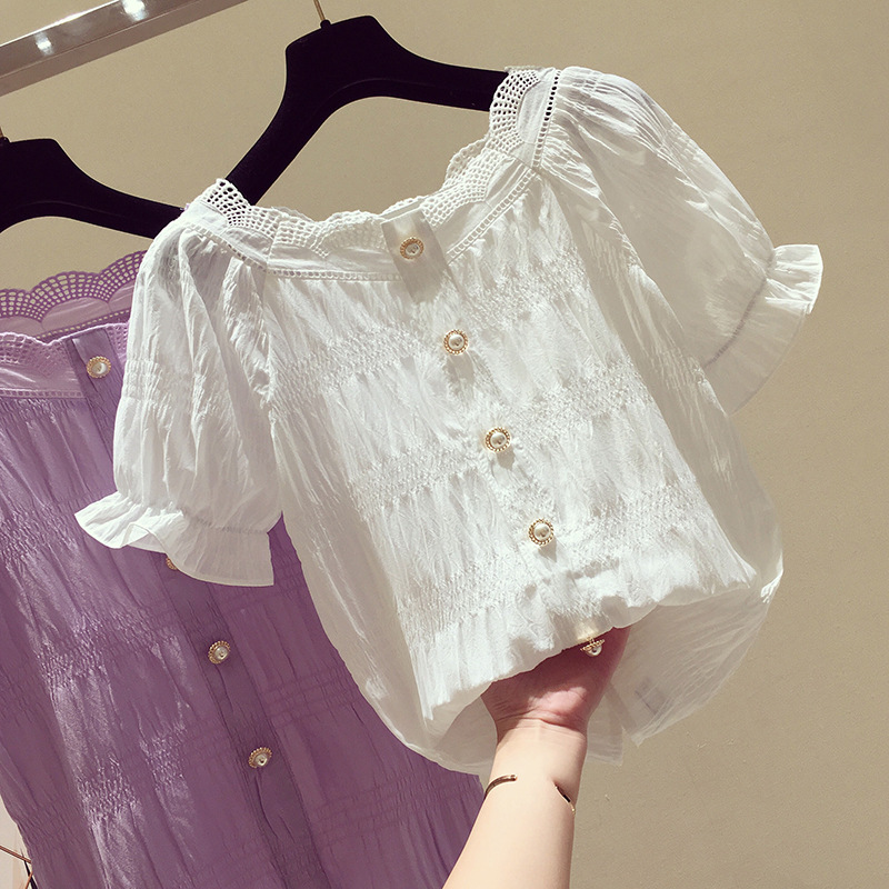 보라색 쉬폰 셔츠 여성 반팔 2025 새로운 여름 한국 스타일 느슨한 달콤한 서양식 셔츠 인형 슬리밍 탑