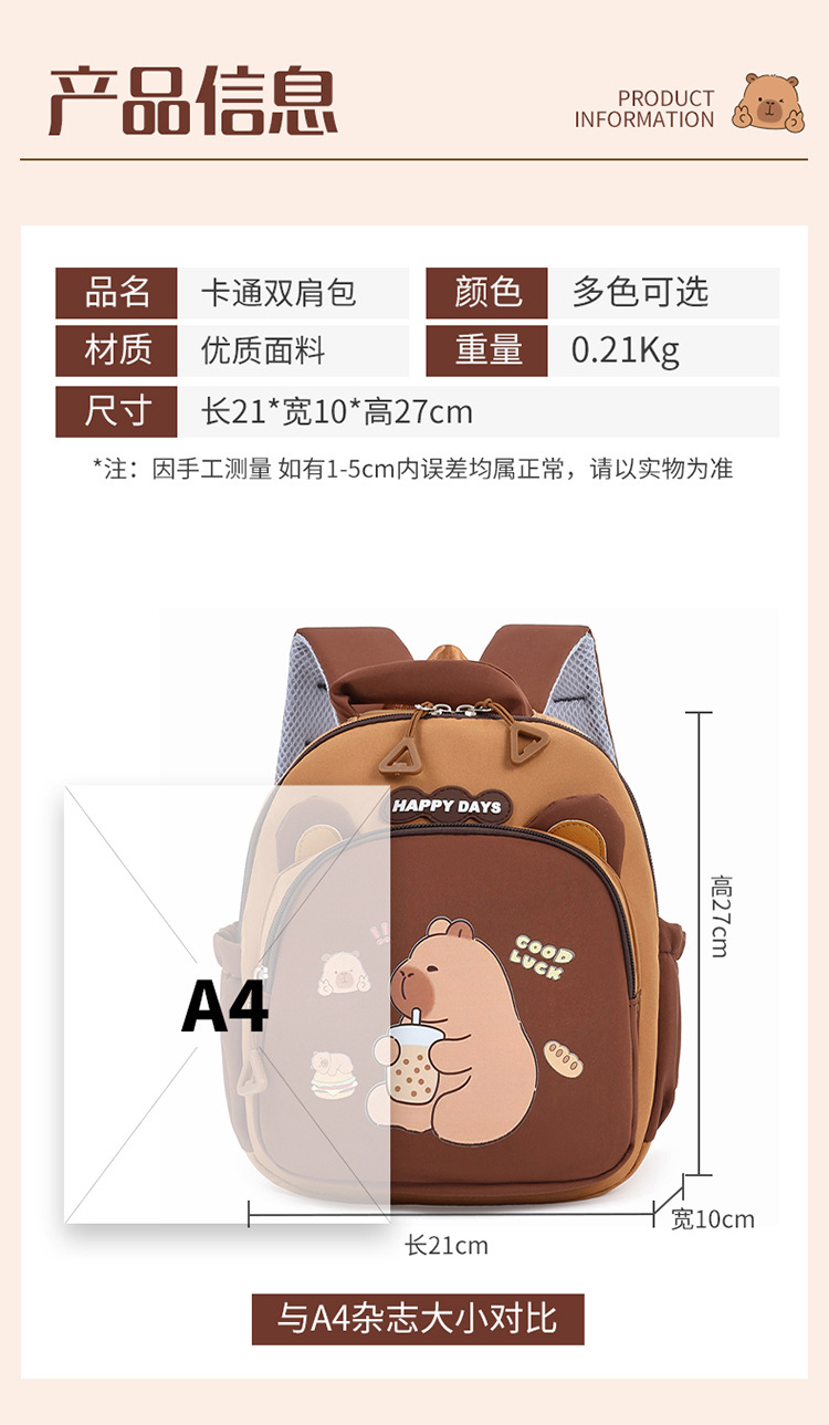 귀여운 Carto Kapibala Capybara 배낭 유치원 어린이 릿지 보호 배낭 초등학생 대용량 Schoolbag스토어 가기