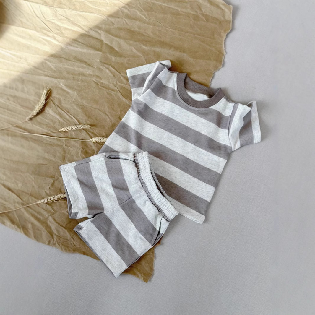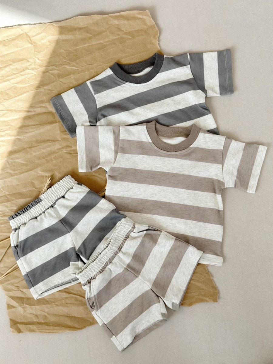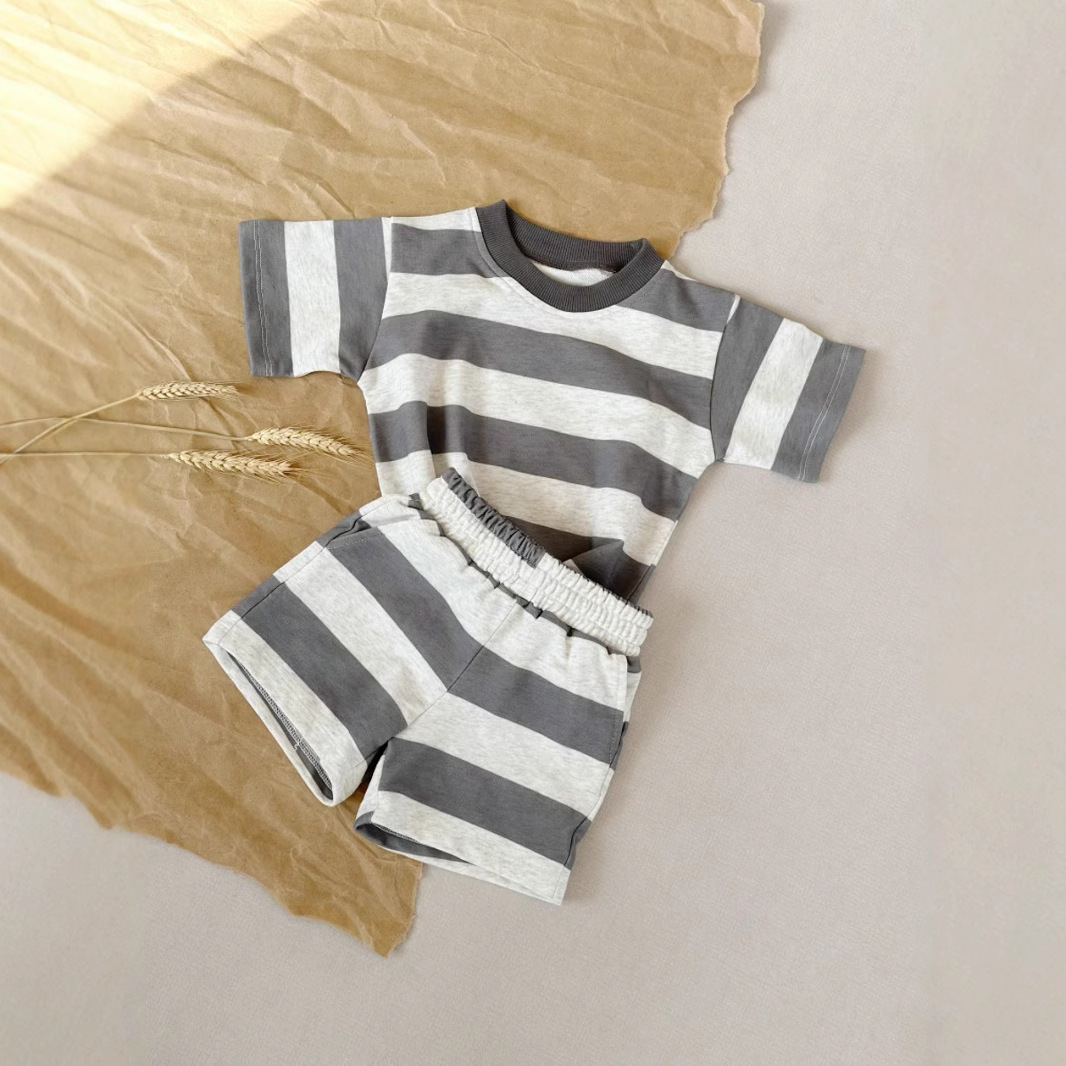Ins 대외 무역 크로스 보더 소년 여름 어린이 정장 남성과 여성 베이비 스트라이프 반팔 다목적 티셔츠 반바지 투피스 세트